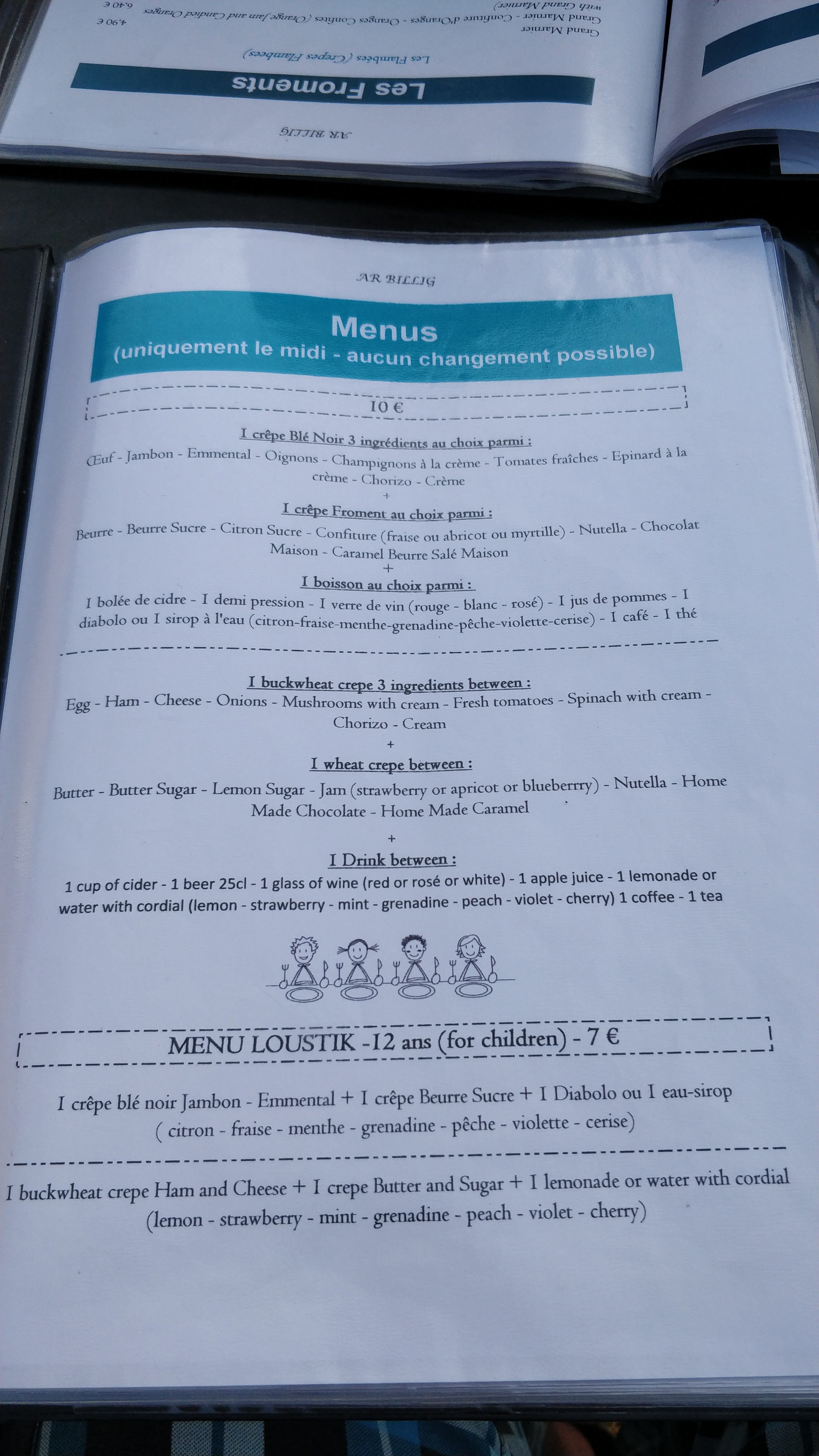 Menu crêpe à 10€ (plat, dessert, boisson), complet et excellent.