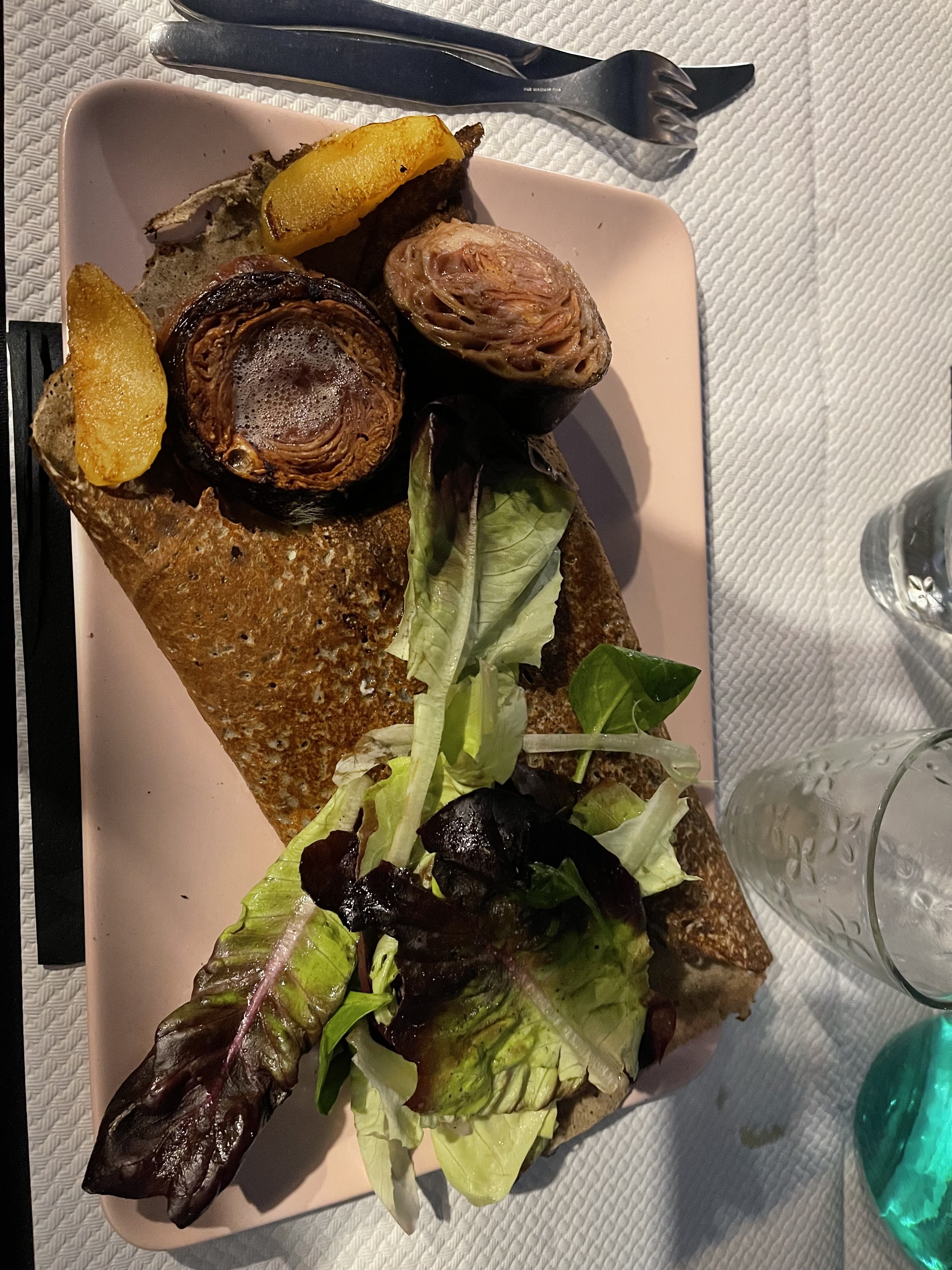 une crêpe végétarienne délicieuse et copieuse, avec légumes frais très très bien cuisinés par le chef