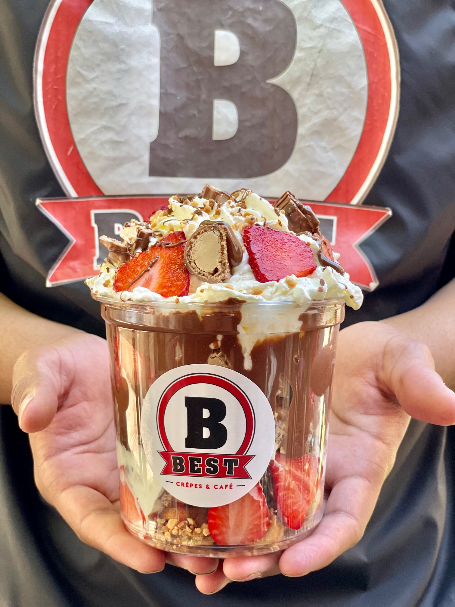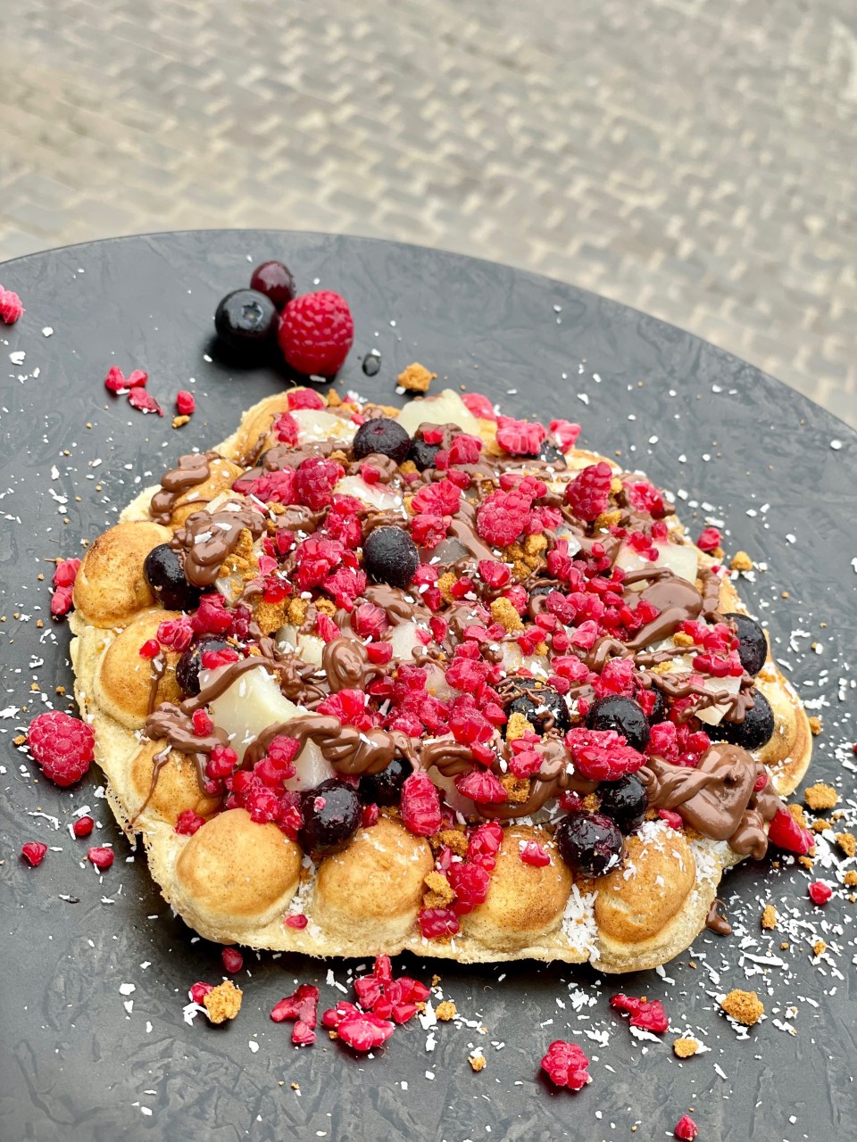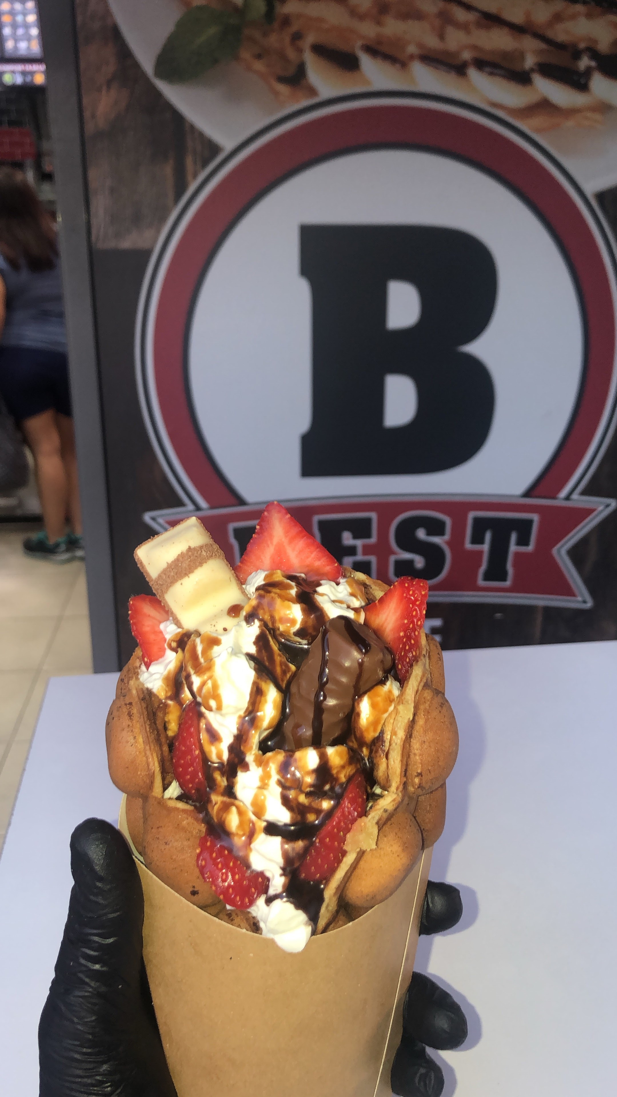 J’ai pris une gaufre en cup avc des framboise , nutella ,chantilly , kinder maxi et Bueno White !! C’est incroyable 😻 portion très généreuse ça vaut son prix ! Je recommande