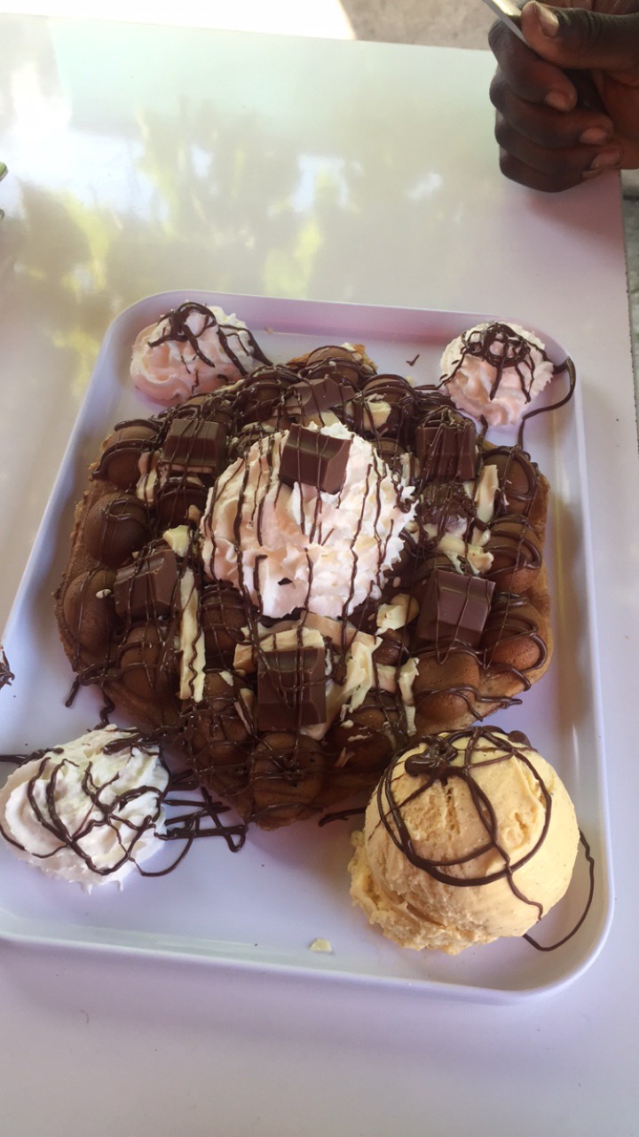 Avant hier j’ai manger une waffles kinder Bueno + fraise et glace vanille avec une bububle tea franchement c’était super bon très bien accueilli tout a été bien fait j’ai manger sur place on me la ramener pas besoin de se déplacer aller chercher sa commande franchement vraiment top 👍👍👍