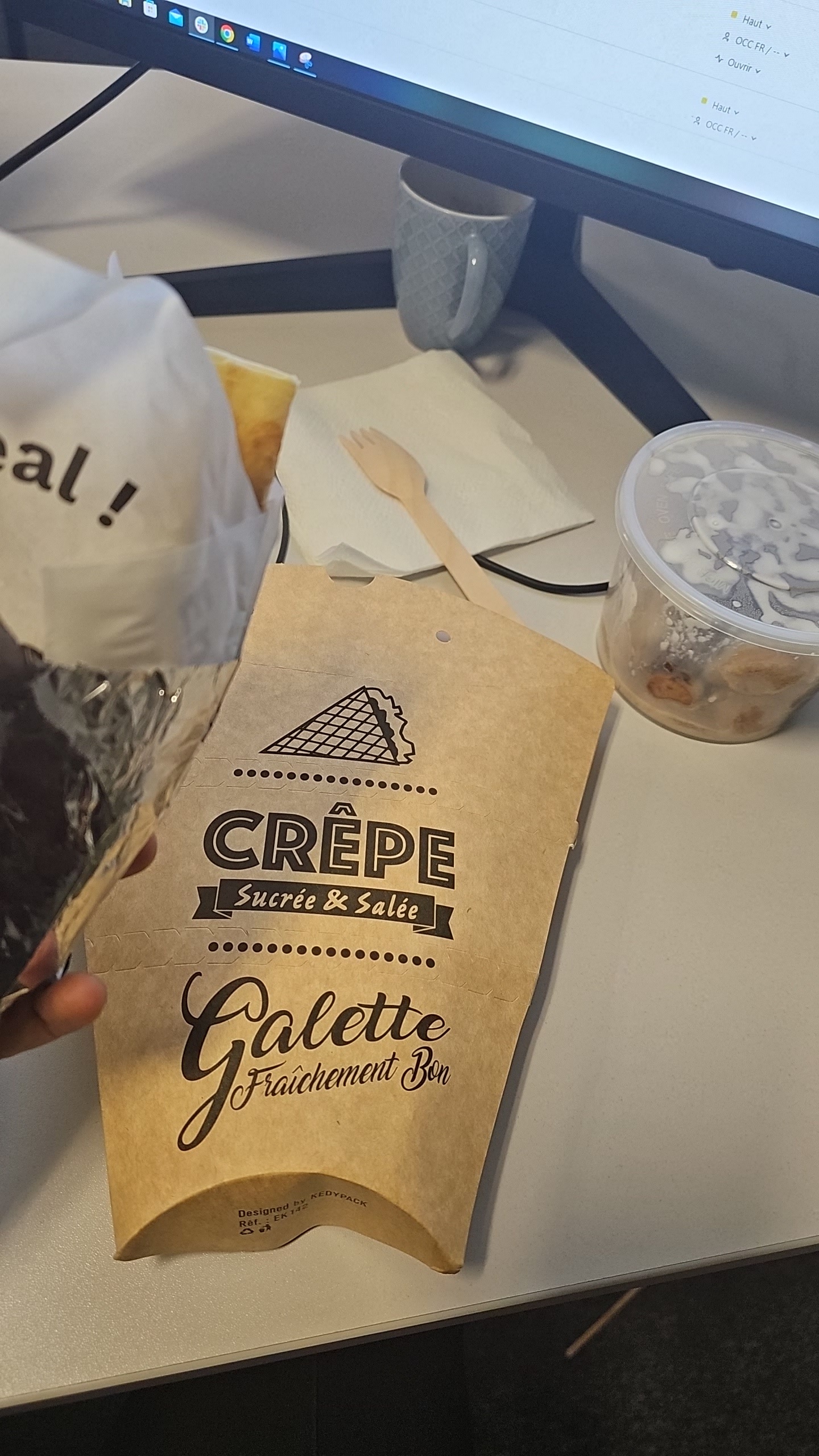 Commande passée ce jour, Je suis vraiment déçu, j’ai l’impression d’avoir commandée des crêpes qui datent de la veille tellement la crêpe est dure, impossible pour ma fille 7 ans de l’a manger sans difficulté. Elle a failli y laisser sa dent. Je me suis laissé tenter par les commentaires positifs, mais franchement c’est vraiment pas cool. Je peux comprendre que la crise Covid n’est pas facile à vivre pour les restaurants mais en agissant comme ça vous vous mettez les quelques clients qui commandent à dos. Personnellement je ne recommanderais pas. Trop déçu. J’ai mis deux étoile: une pour le nutella et l’autre pour le livreur. 1 crêpe salée viande hachée ; franchement bof Crêpe sucrée nutella: Classique 😶 J’espère que vous prendrez en compte cet avis et les autres déjà sur le site. J’aurais aimé savourer ma crêpe (point)!!