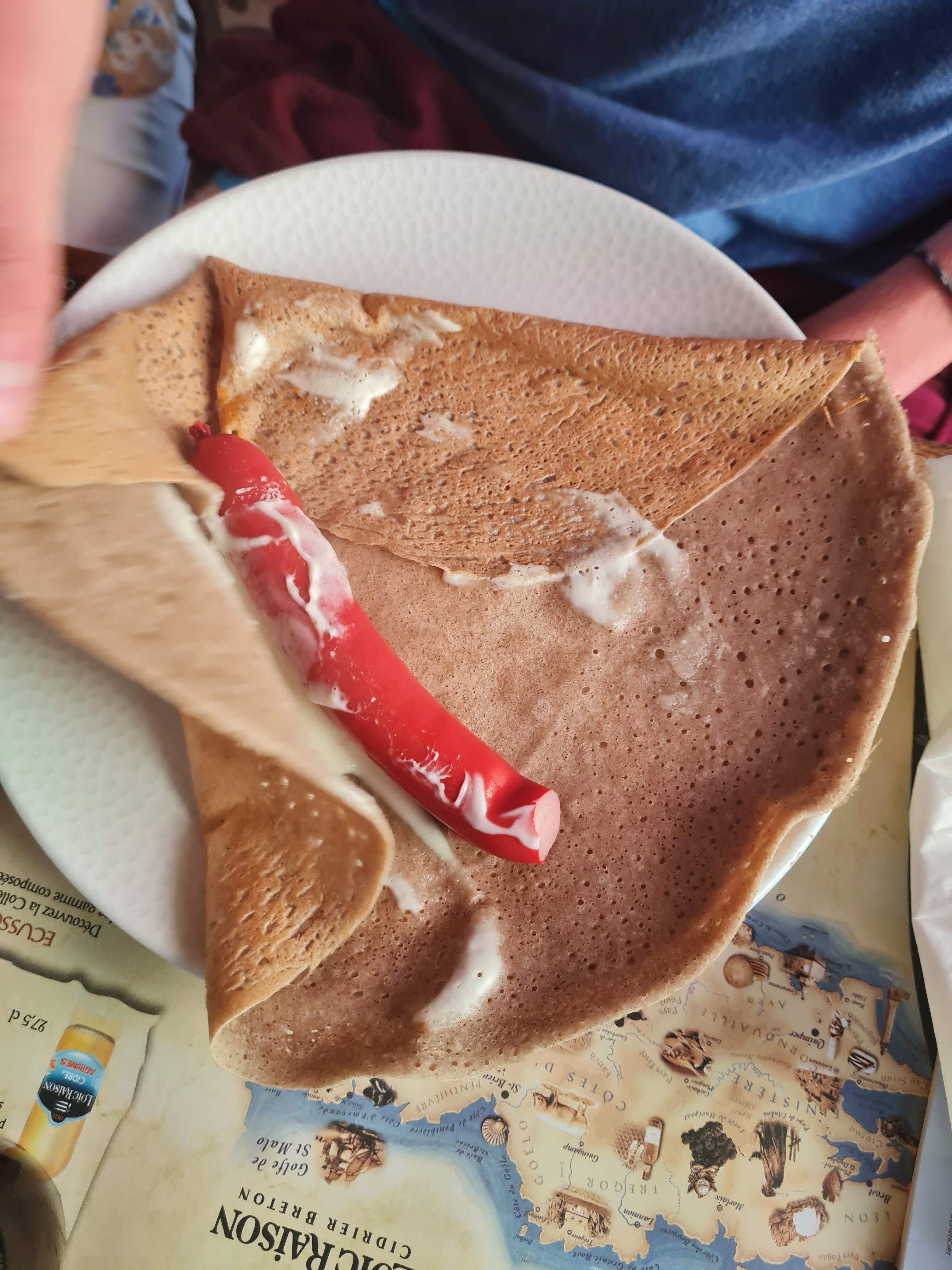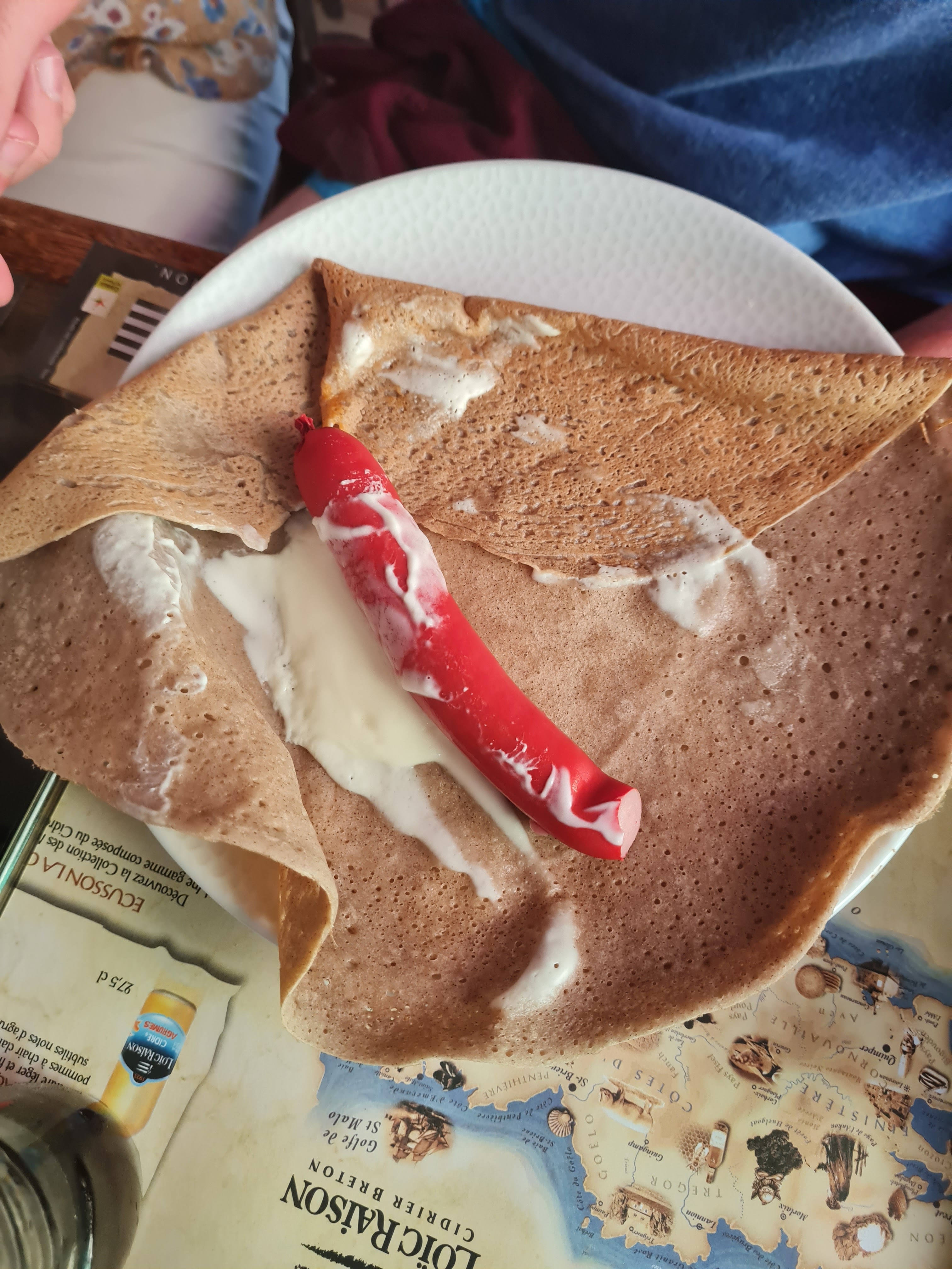La pâte à crêpes est fade, épaisse, et l'intérieur composé d'une saucisse de Strasbourg est désastreuse. Celle aux 3 fromages était correcte. Les frites sont surgelées et pas cuites convenablement.