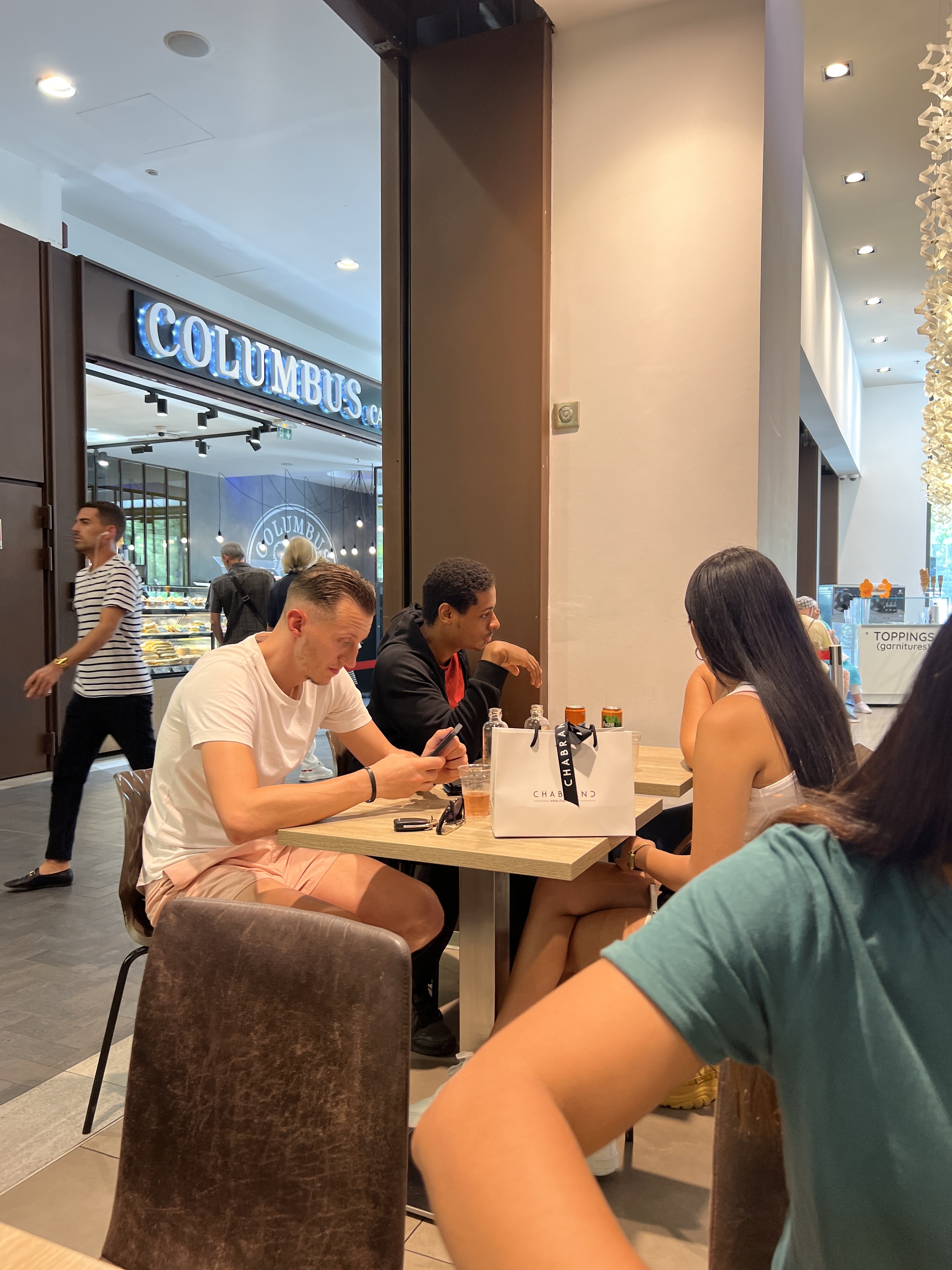 J'ai choisi la proximité (n face du Lego Store) pour me désaltérer, mais j'aurai dû regarder les avis avant, Je confirme les négatifs ! 😡 Pour ma part, je demande un jus de fruits pressés (je vois d'ailleurs la grosse machine remplie d'orange, j'en salive déjà), mais non : orange et pamplemousse (orange citron demandé et payé au départ - mais 1 fois payé : j'ai plus de citron... ça aurait été bien de vérifier avant....) La dame me verse un liquide (?), quelques glaçons et la moitié d'un pamplemousse épluché, passe au mixeur, et voilà... Quand je demande où est l'orange pressé ? Réponse : on les presse davance ! A d'accord, davance de quand ??? 🤢 Donc l'orange n'est PAS fraîchement pressée... pour la modique somme de 6.5€ ! 🤡🤥 Quelle belle arnaque ! Elle m'a gentiment proposé du sirop de sucre de canne pour atténuer le goût amer du pamplemousse