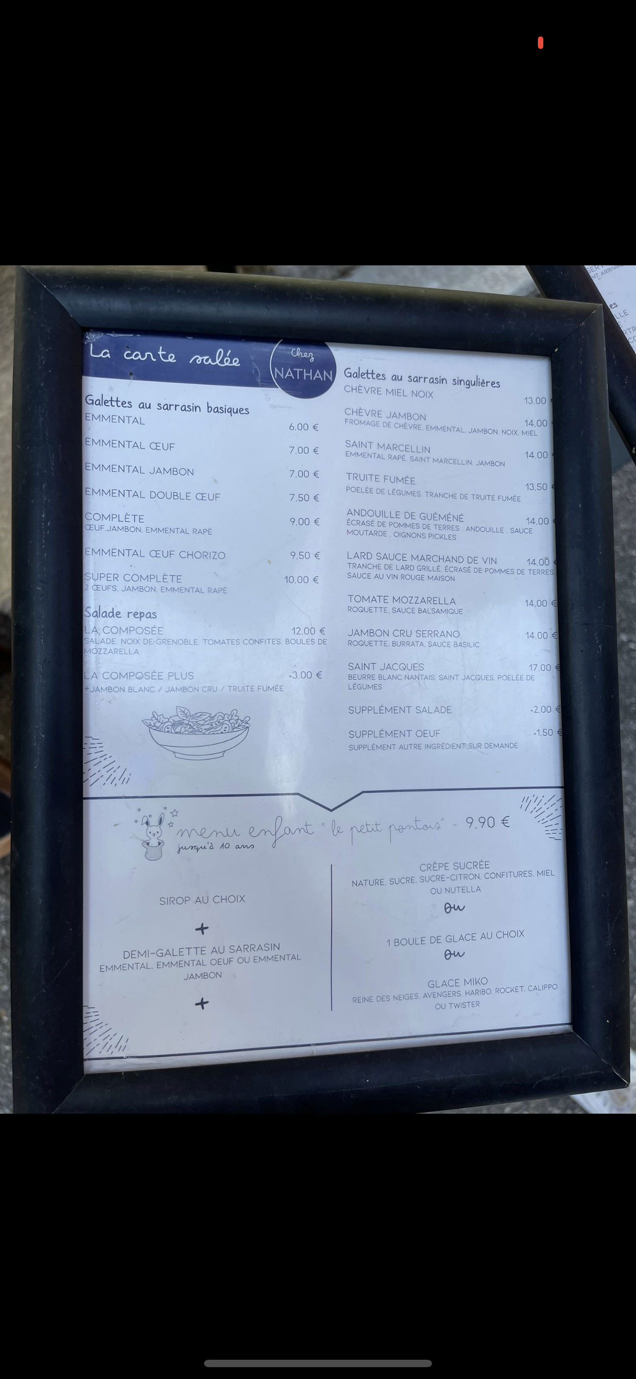 Nous vous remercions chaleureusement d'avoir partagé votre expérience ainsi que quelques photos de vos repas. Nous sommes enchantés de savoir que vous avez apprécié notre magnifique cadre, ainsi que notre cuisine qui a su vous séduire. Votre compliment sur notre serveuse et son amabilité, même en fin de service, nous touche particulièrement. Votre retour positif est une récompense précieuse pour nos efforts. Si l'envie de déguster nos délicieuses crêpes vous reprend, n'hésitez pas à revenir nous voir. Nous serions ravis de vous accueillir à nouveau pour un autre moment savoureux dans notre cadre enchanteur. Votre recommandation est extrêmement appréciée ! 🥞🌟😊 L'équipe de Chez Nathan