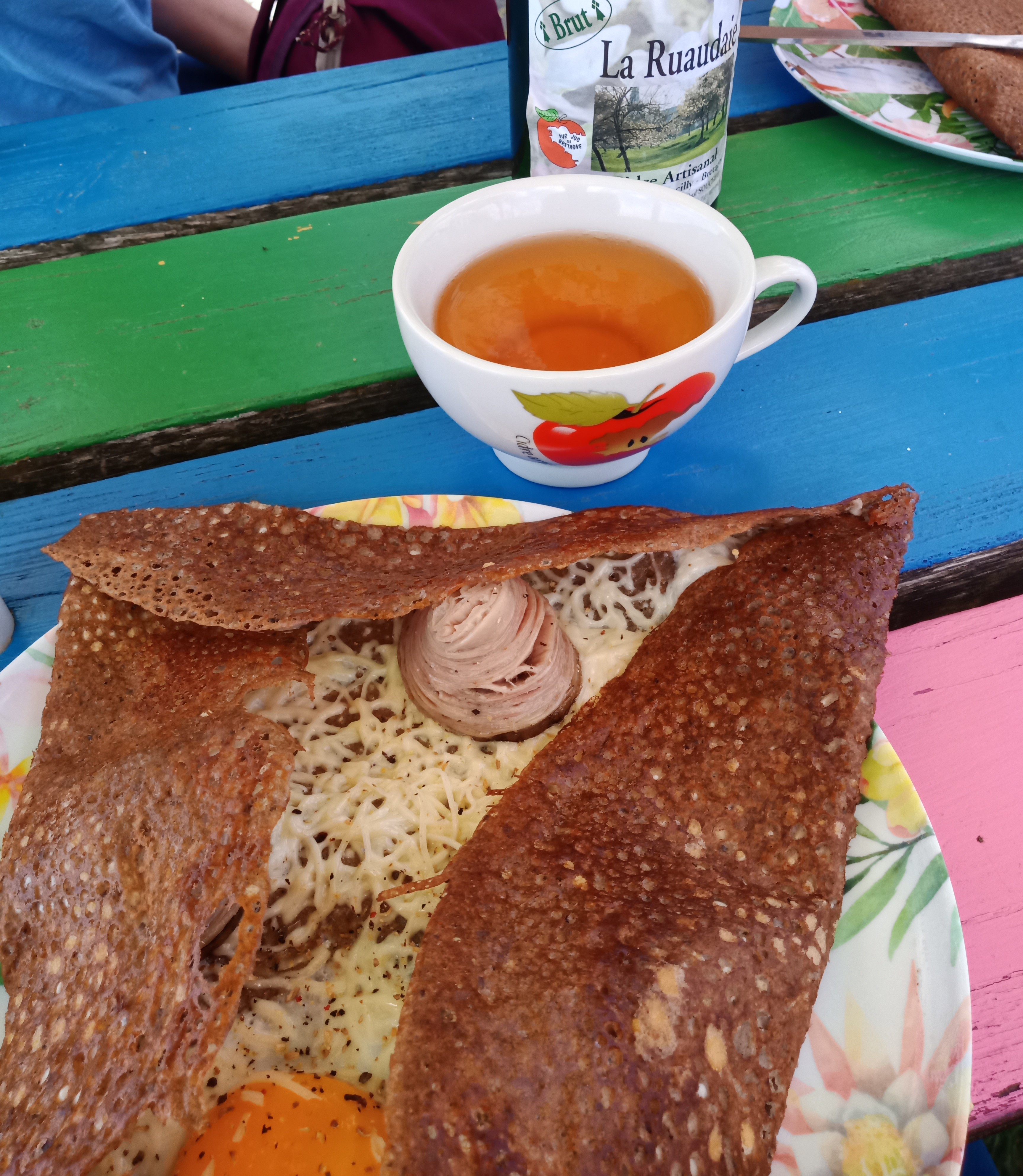 Très bonne galette de blé noir (sarrasin) et il faut absolument goûter le jus de pommes. Excellent ! Sans oublier en dessert la crêpe.