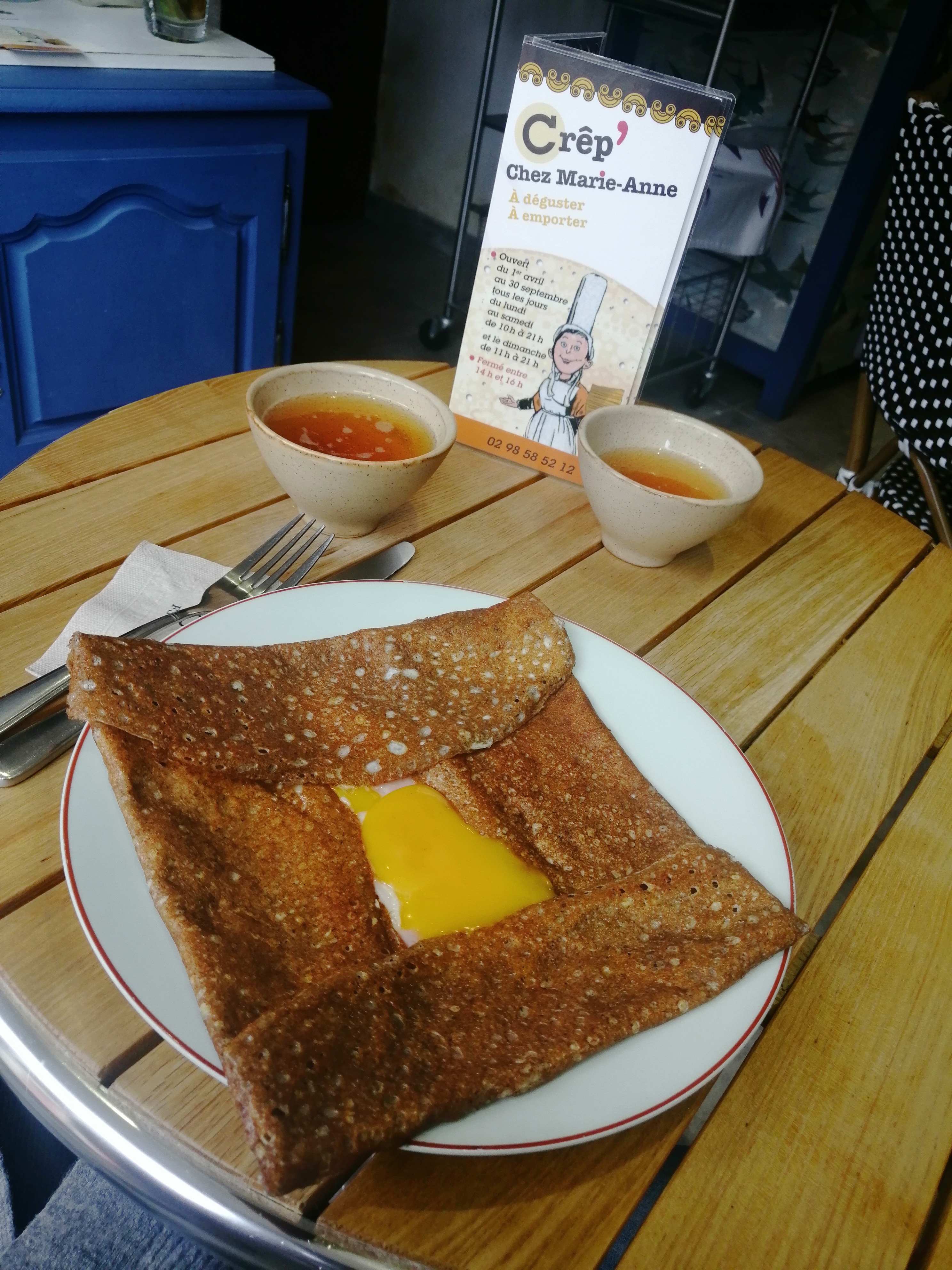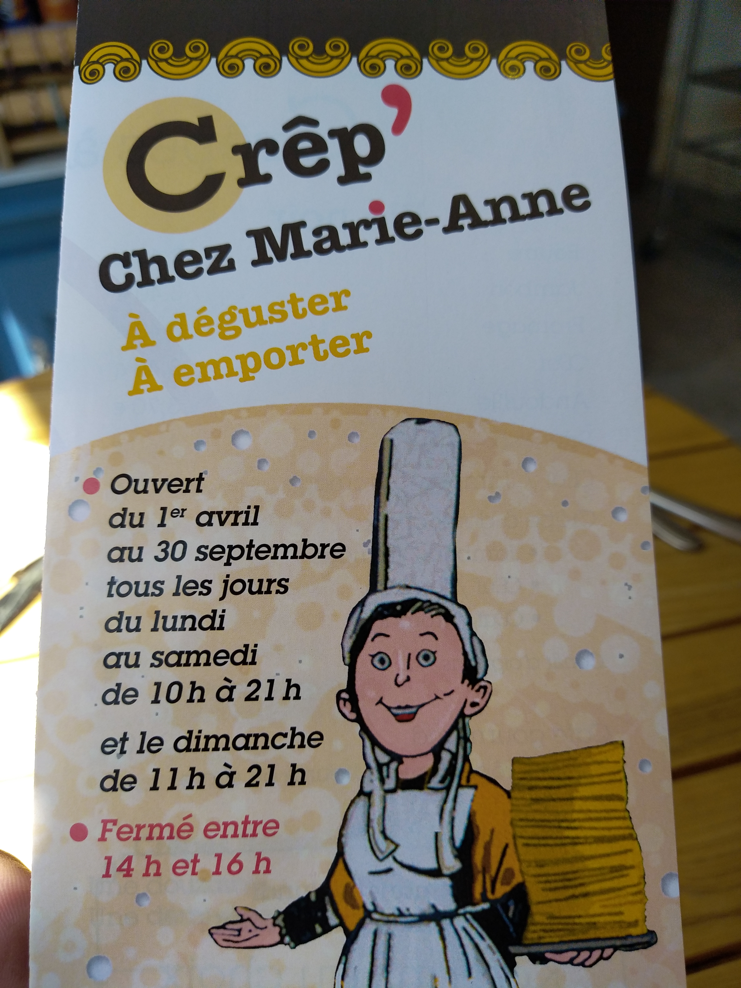 Située dans une petite ruelle à l’abri des regards mais bien indiquée par des panneaux, la crêperie de Marie-Anne vous accueille avec un large sourire pour vous offrir d’excellentes galettes sucrées ou salées. Hélas, trop peu de places pour recevoir à l’intérieur moins d’une dizaine de personnes. Mais la vente à emporter est garantie si vous ne pouvez pas profiter de cet endroit charmant et cosy.