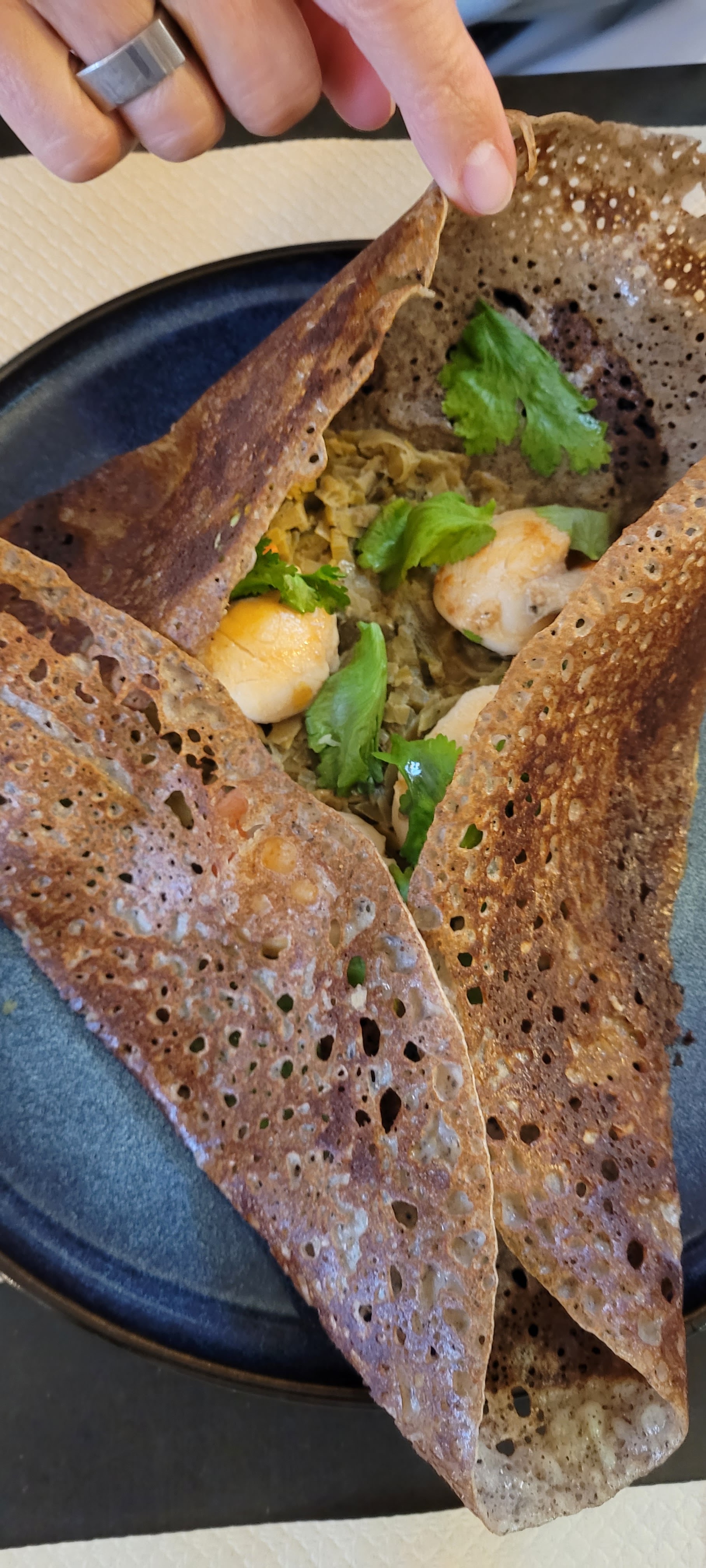 Cuisine avec produits frais et locaux. Quatre saint jacques gros calibre dans une galette c est vraiment une galette aux saint Jacques.