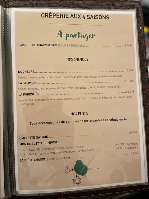 Il y a juste ce qu'il faut à la carte. Les galettes et les crêpes sont bonnes et copieuses. Service rapide. J'aimerais que le cadre soit un peu plus chaud.