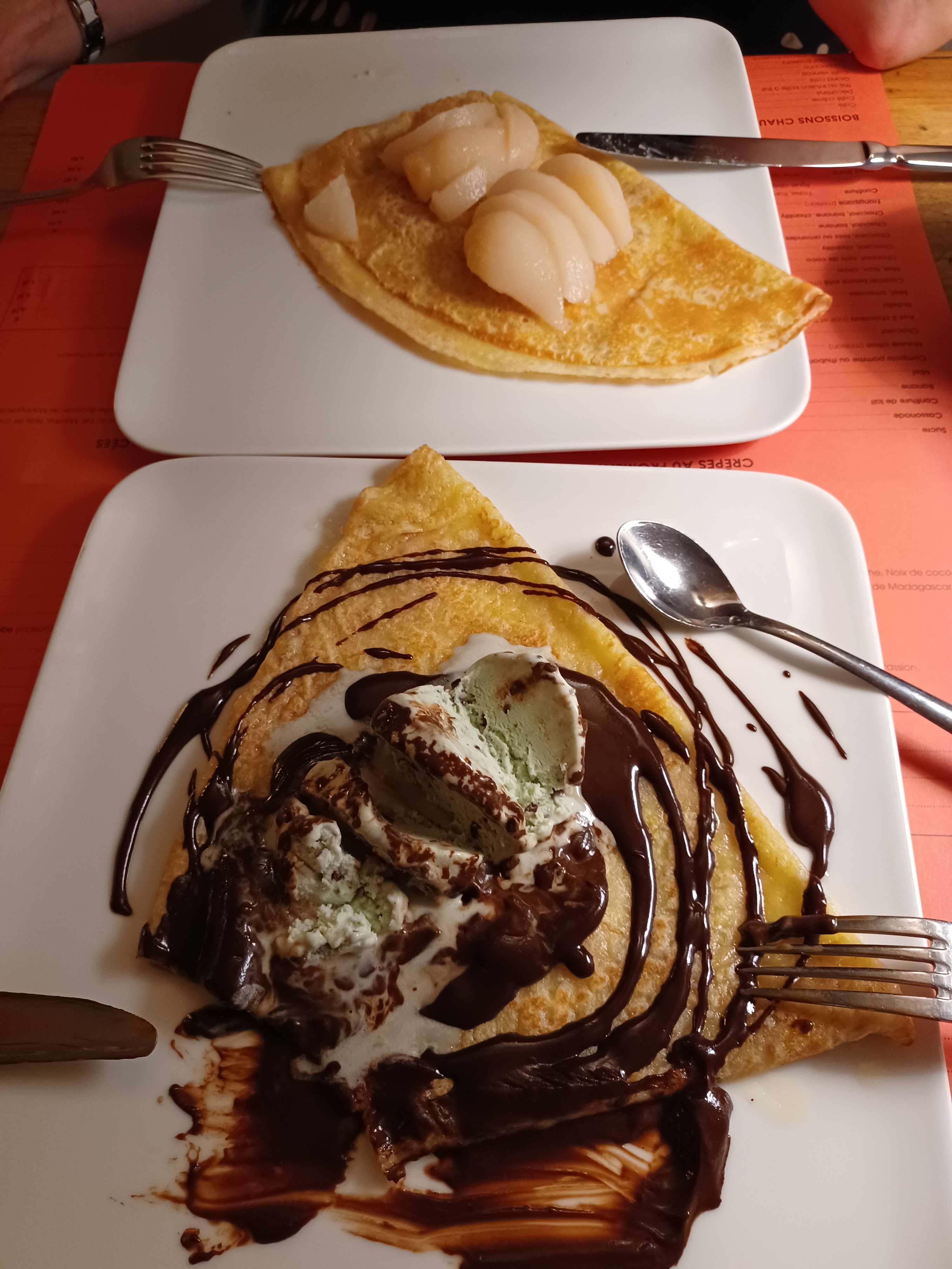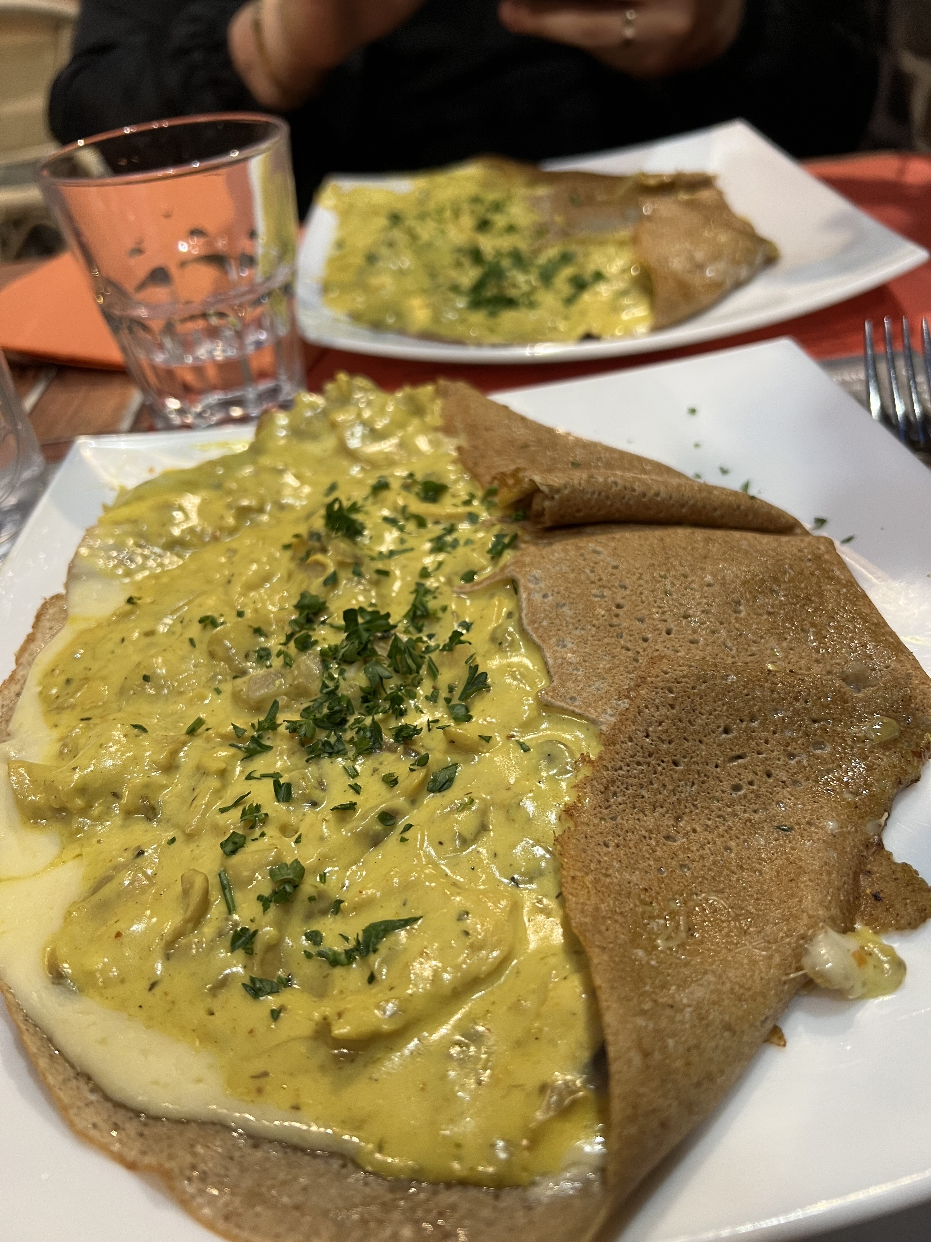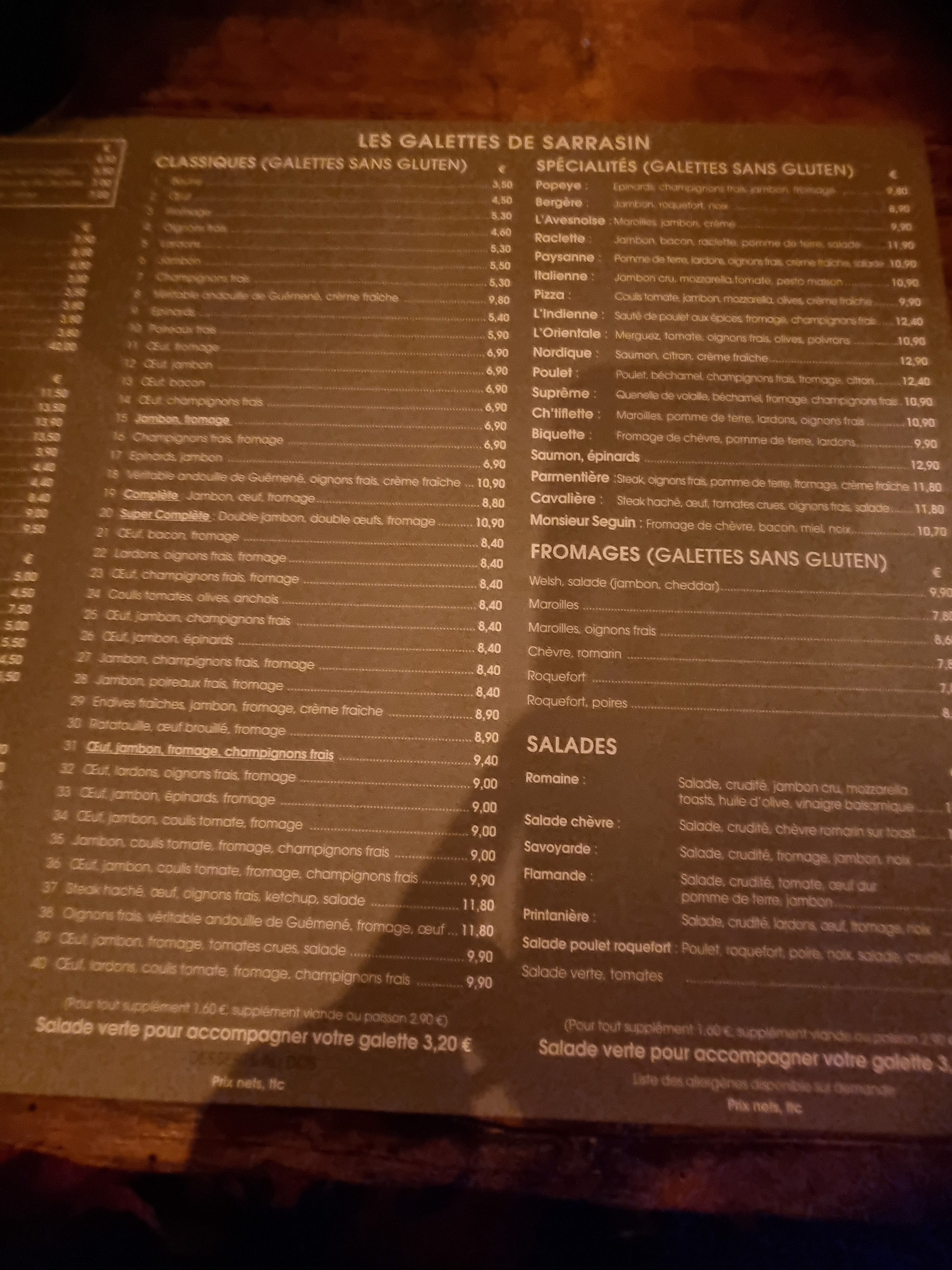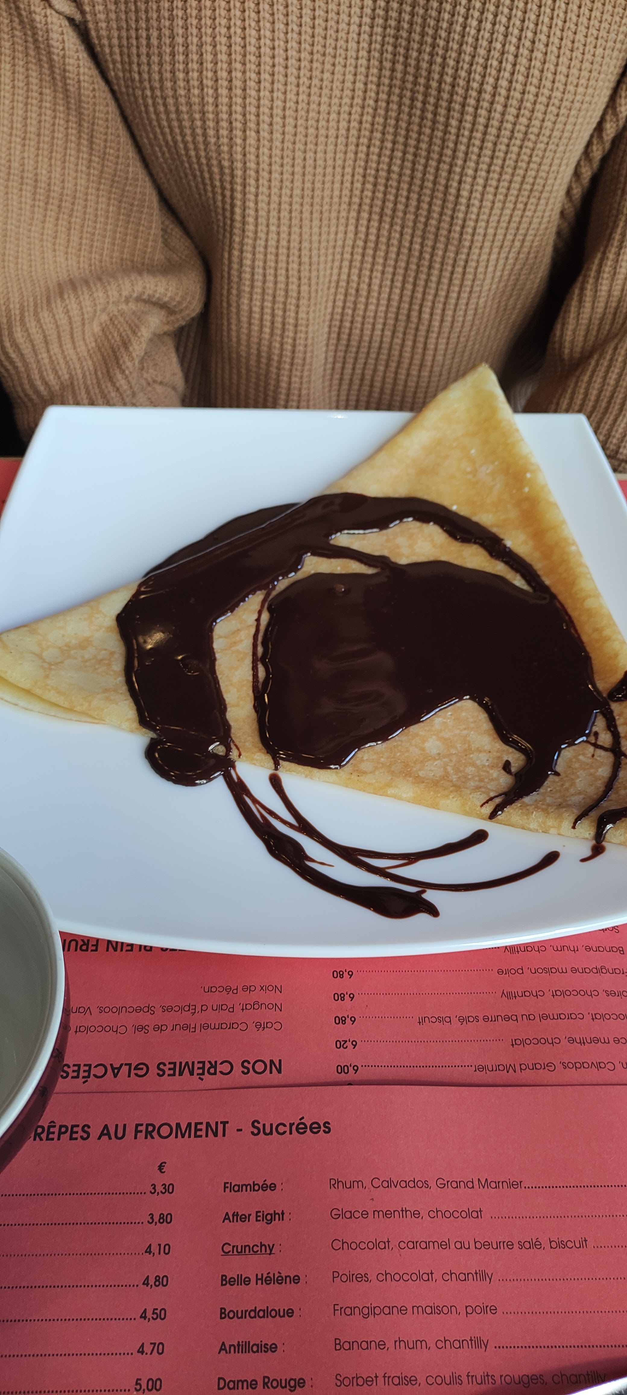 Nous sommes arrivées 30 mins avant la fermeture de la cuisine et nous avons été super bien accueillies. Crêpe au roquefort délicieuse et généreuse et possibilité de faire une dame noire à la place d’une dame blanche alors que pas à la carte donc j’étais ravie !