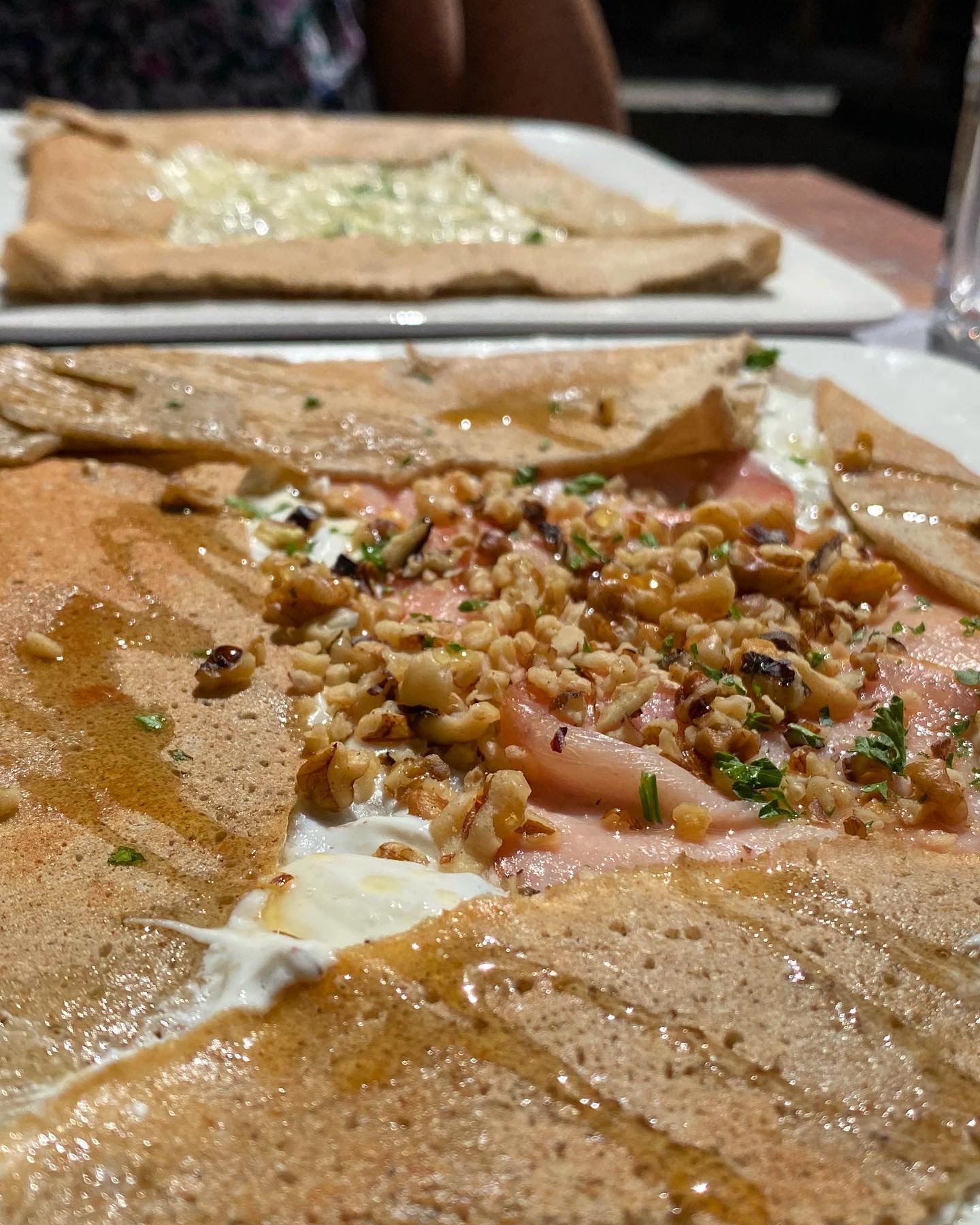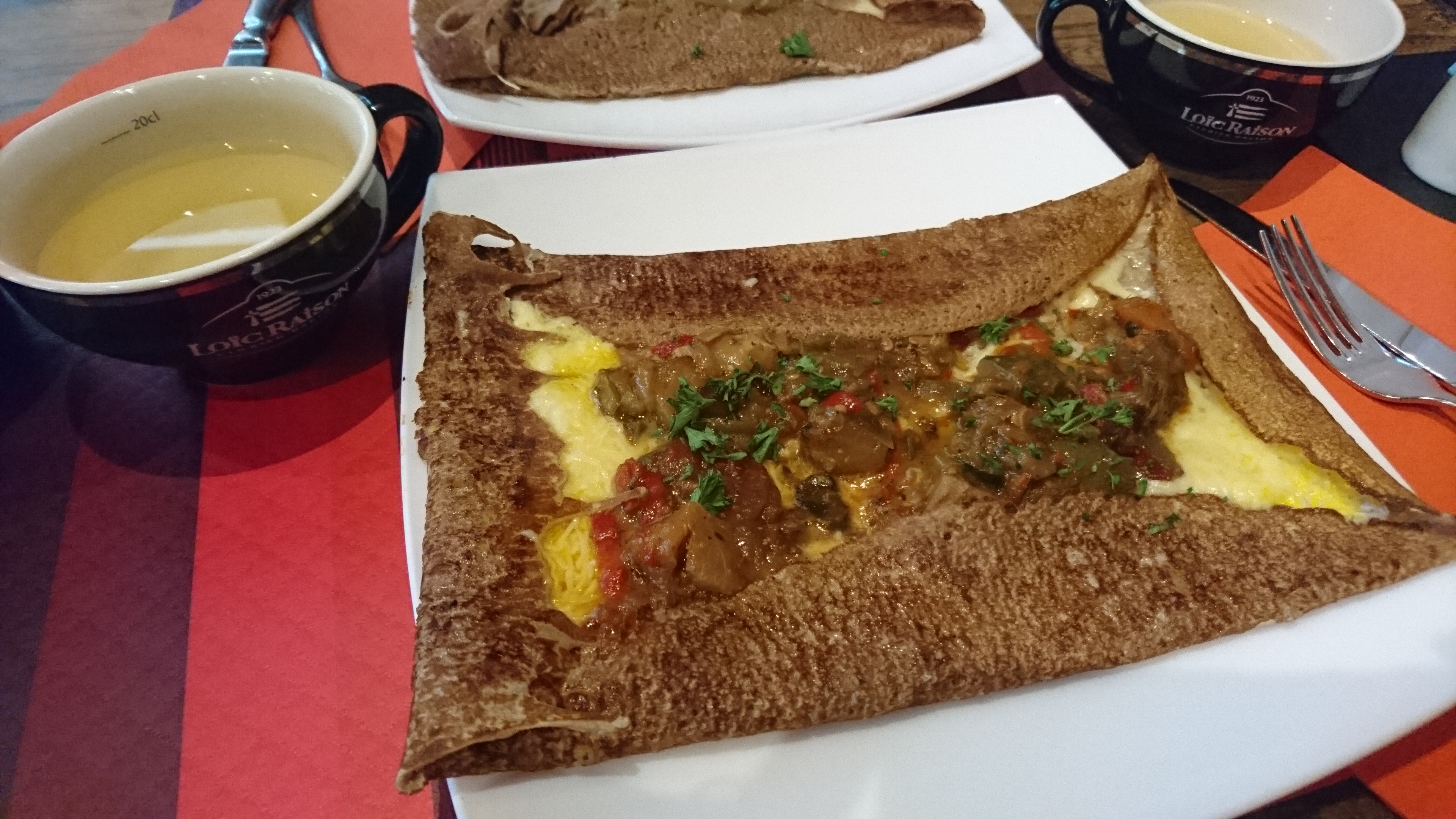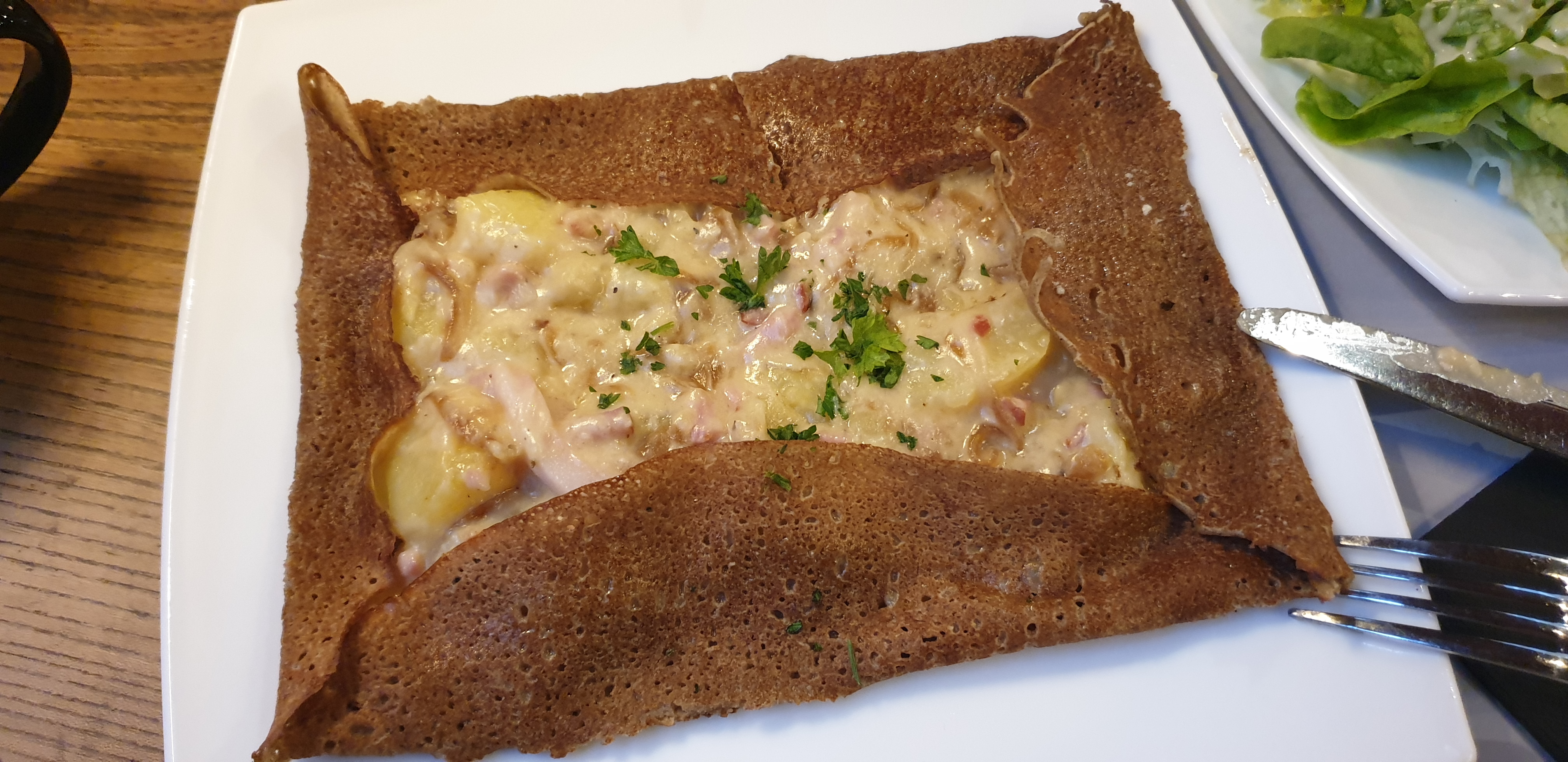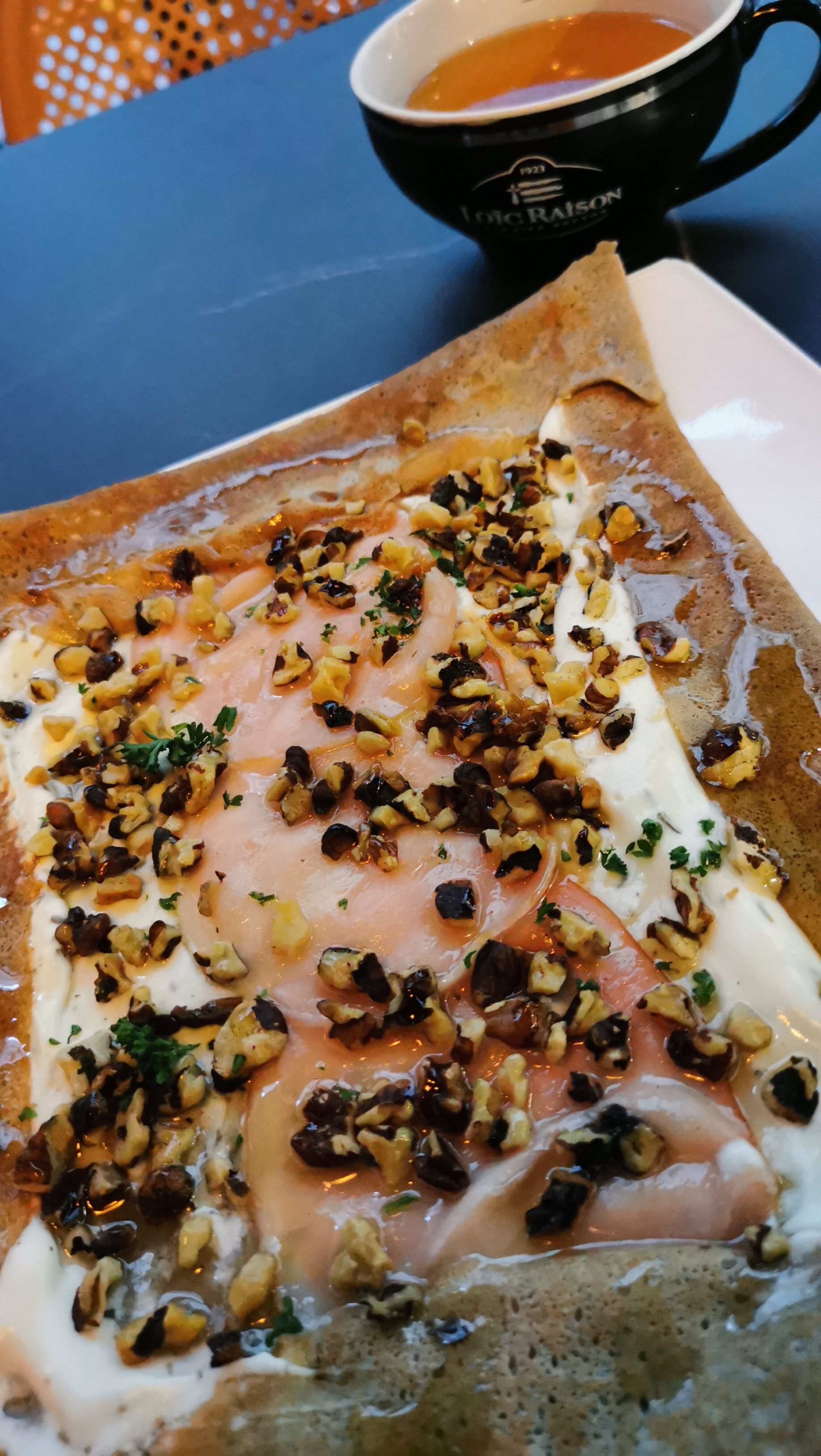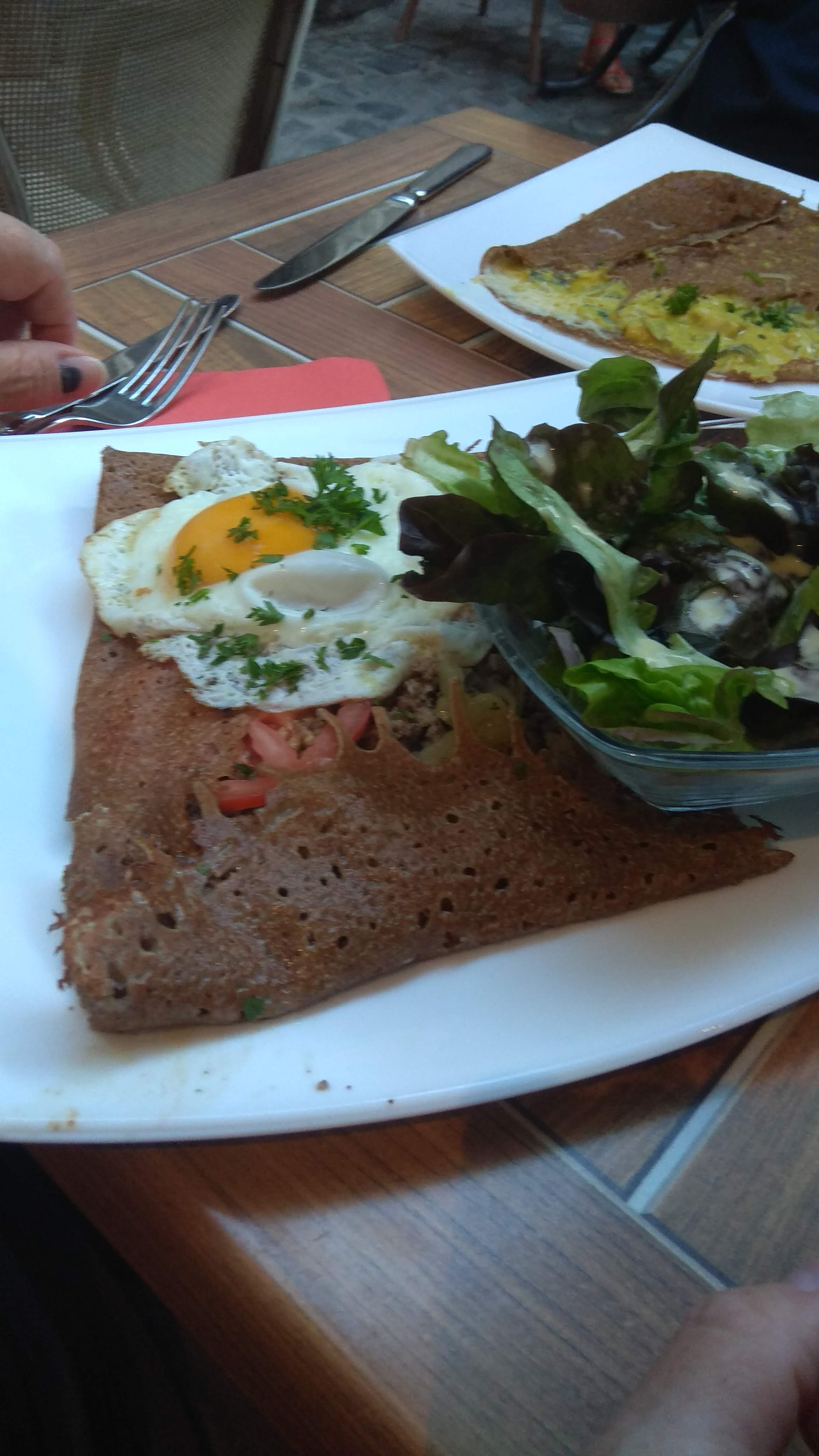 Au détour d'une rue nous avons découvert ce bel établissement, accueillant et très bien décoré. Attention si vous êtes clostro comme moi, précisez le afin d'être à l'étage et non par surprise à la cave... Plats très copieux, frais et excellent malheureusement on en perd le goût de la crêpe (beaucoup garnies). Les crêpes sucrées sont excellentes et très bien dosées ! A visiter