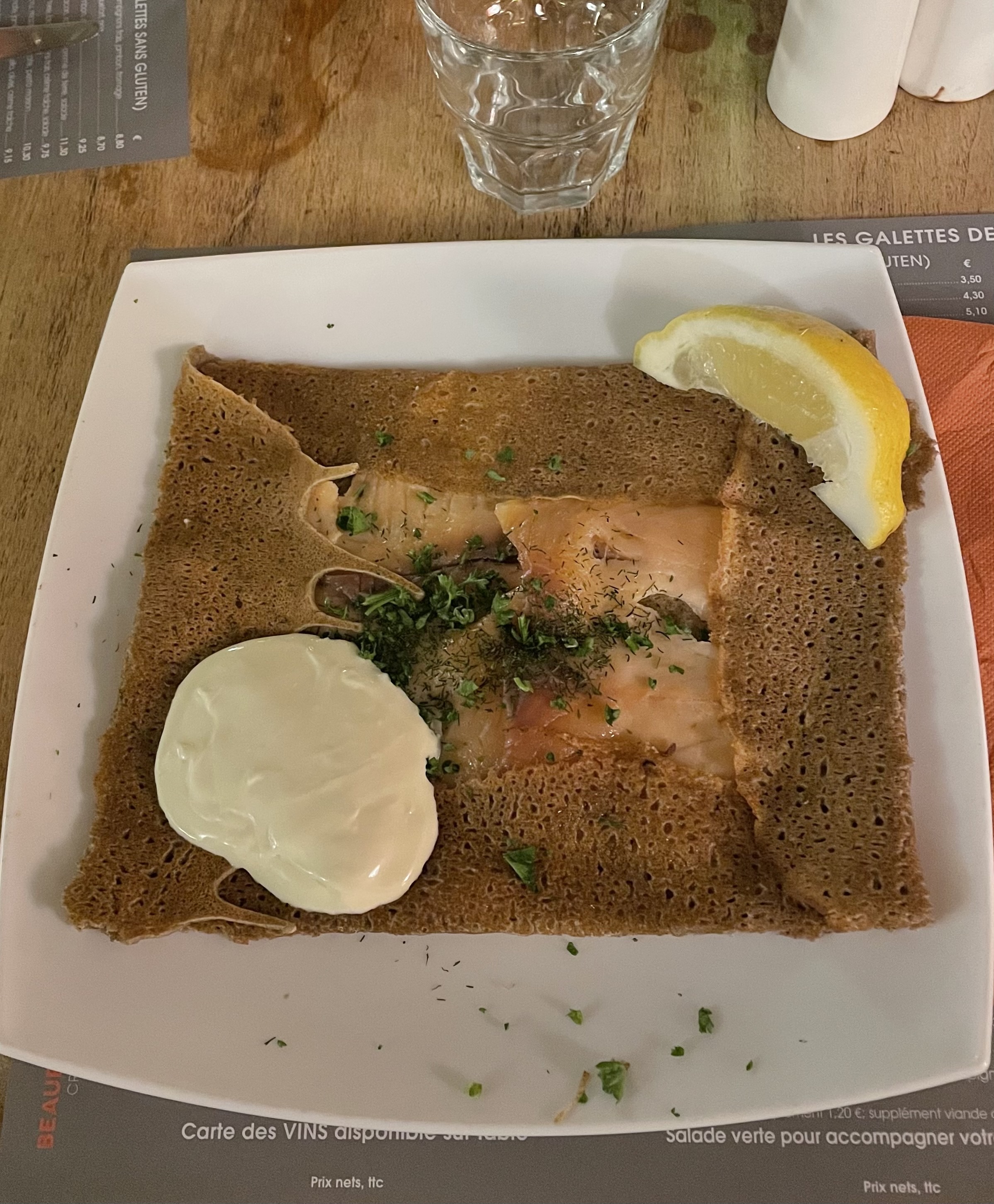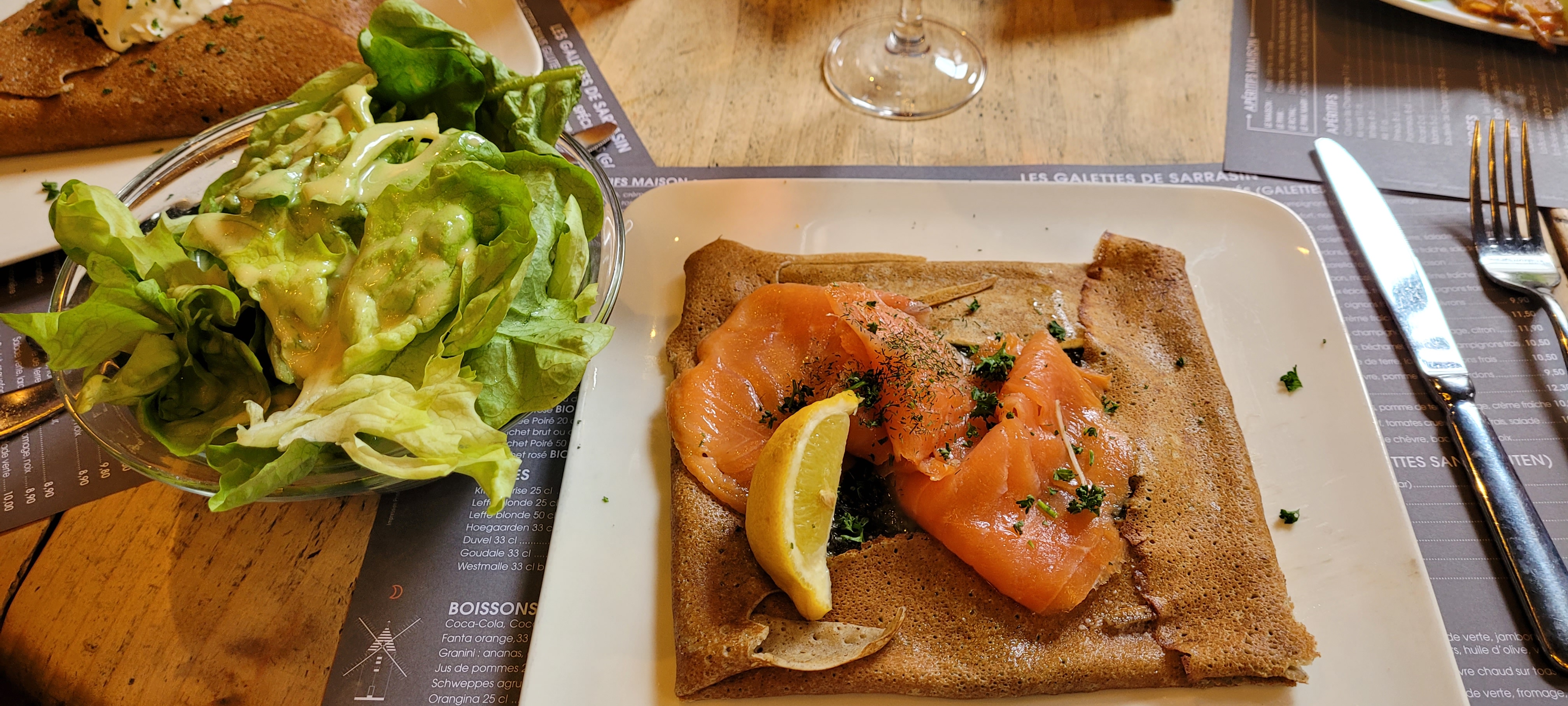 Crêpe saumon épinards : pâte a crêpe molle, blanche, épinards baignant dans une sauce indescriptible, saumon presque inexistant, trop fumé et de plus digestion difficile .... Très déçue