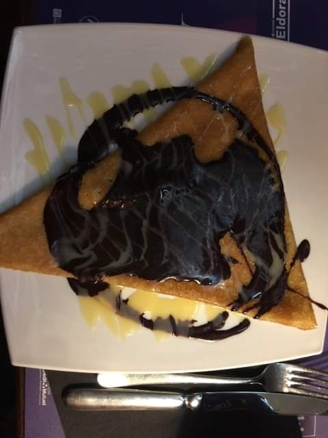 Cadre sympas et prix attractifs. Crepes salees a composer soit même avec les ingrédients souhaités donc accessibles a tous les budgets. Seul bémol la salade non comprise. Ci joint crepe aux 2 chocolats
