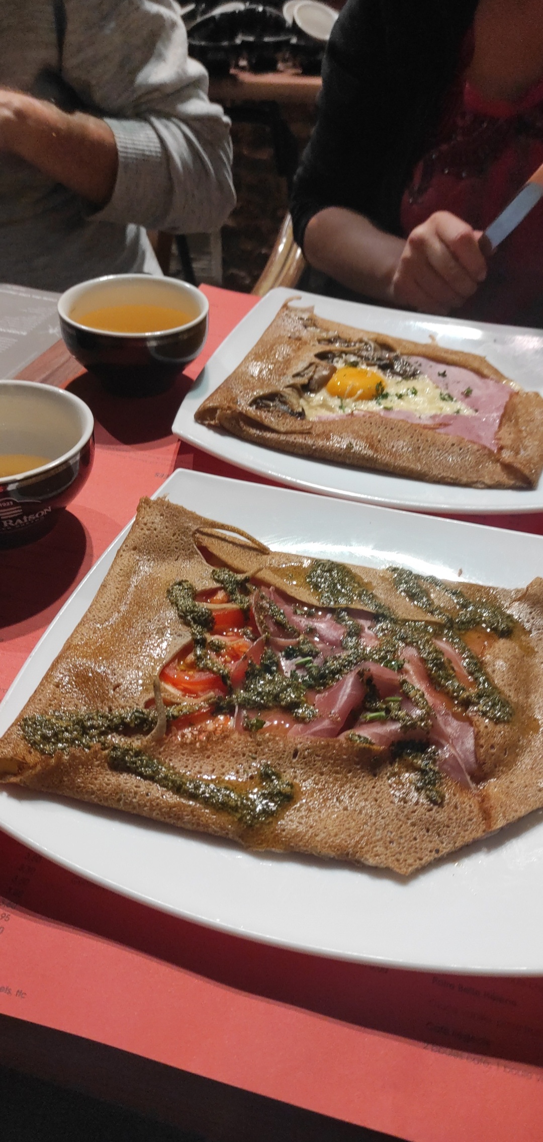 Très bonnes galettes salées et sucrées. Très copieux. Bonne ambiance. Temps d attente pour être servi correct. Pas de pression pour nous faire partir une fois le repas terminé. Nous sommes restées plus d une heure après la fin du repas. Par contre tables plutôt petites.