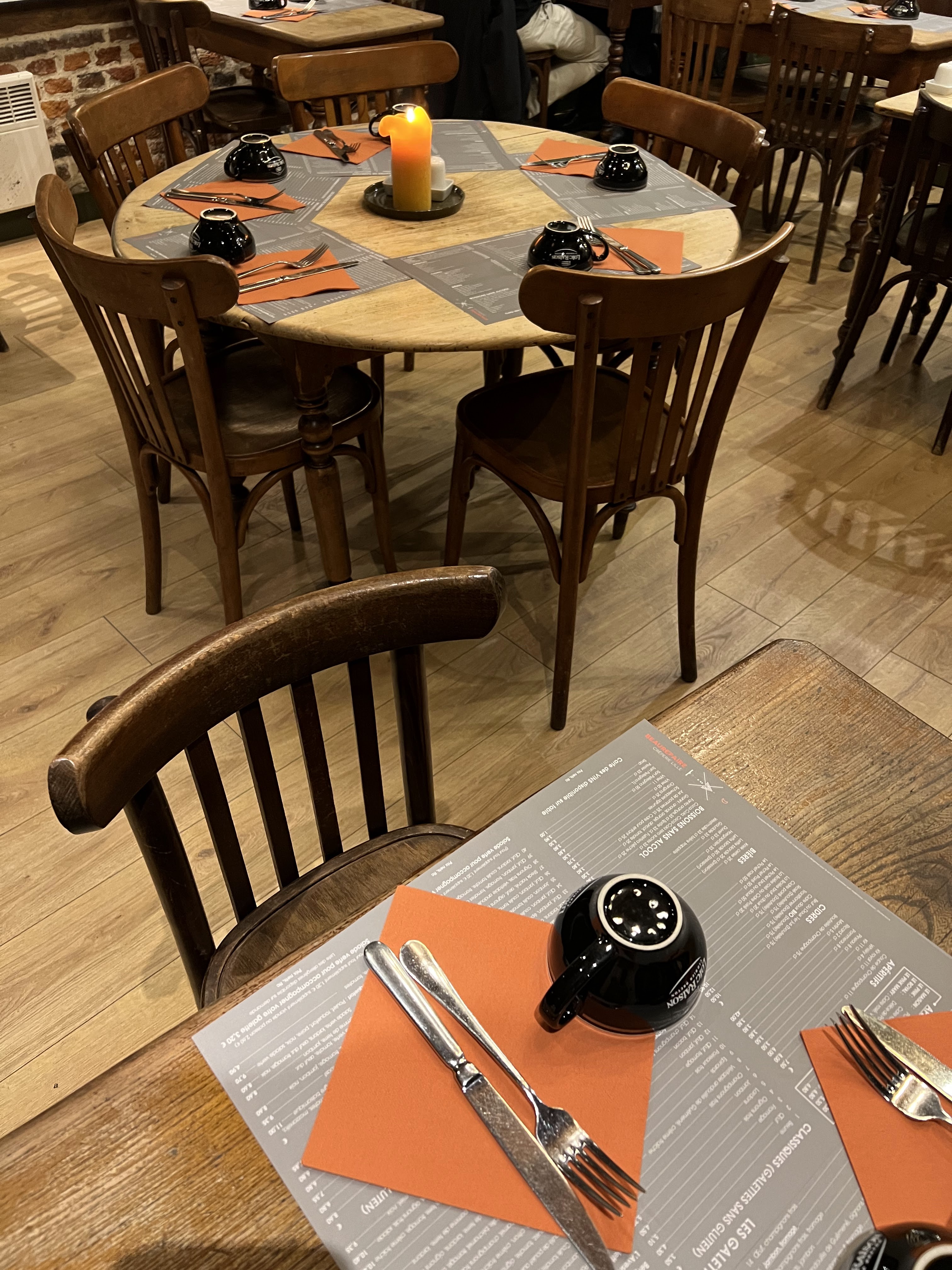 Je mets 3 * et j'espère modifier ma note lors d'un prochain passage qui ne serait pas une catastrophe ;) Le cadre est joli, les tables sont certes, serrées mais c'est ambiance bonne franquette... Tout mon soutien aux serveurs-ses qui doivent, tant bien que mal, slalomer entre les tables... ;) Ils sont efficaces ! La carte est dense, il y a bcp de choix.. La cuisine est bonne. On a juste pas trop apprécié le fait que les autres clients ne fassent aucunement attention en se levant et fassent tout tomber.. Bière renversée, salière renversée, couvers renversés.. c'était pénible. On a eu l'impression d'être la table de la loose et c'est peu de le dire ! Là-dessus, il y a quand même qqchose à creuser. Je passe sur l'incident majeur de la soirée vu que vous m'avez offert ma crêpe dessert ;) A bientôt !