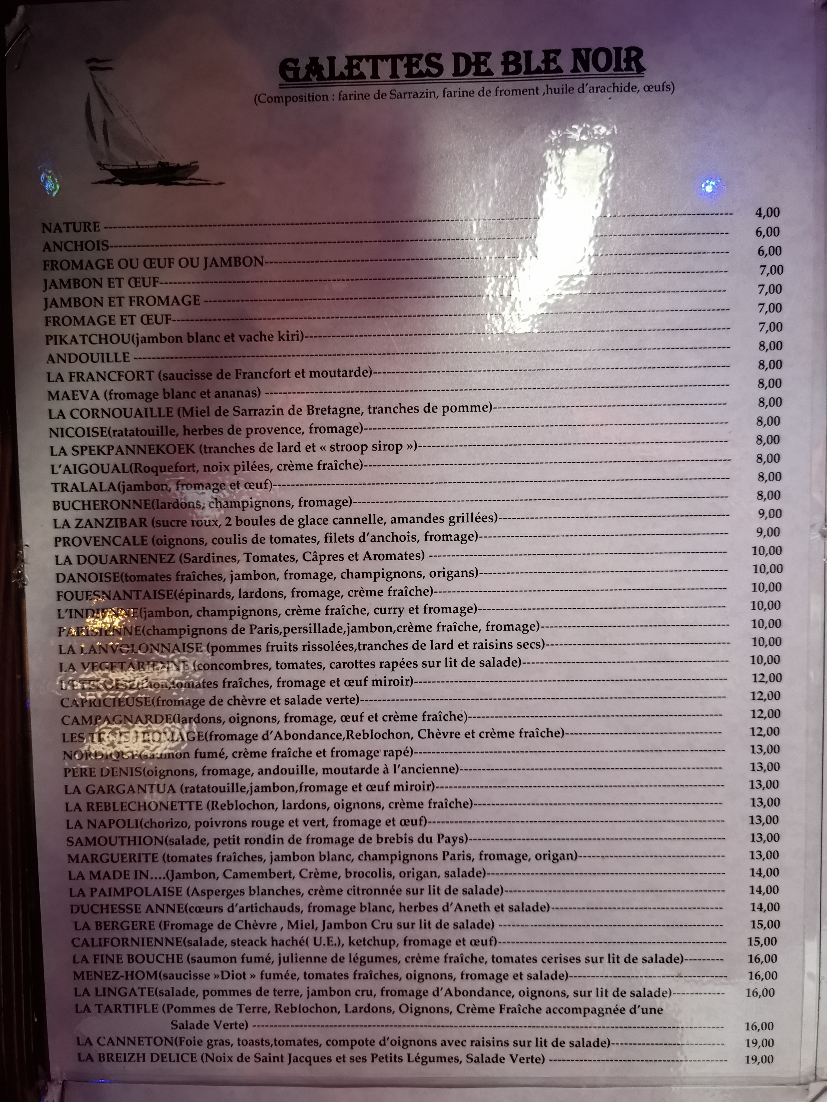 J ai lu beaucoup de critiques négatives sur la patronne mais en ce qui nous concerne très bonne serviabilité de l équipe et donc de la patronne.... Les crêpes salées ou sucrées vraiment très bonnes, maintenant les prix des sallees entre 11 et 17€et sucrées entre 4.5 et 7 euros, le cidre est bon, dommage que le système pichet n existe pas (soit 20cl soit 75cl) à recommander