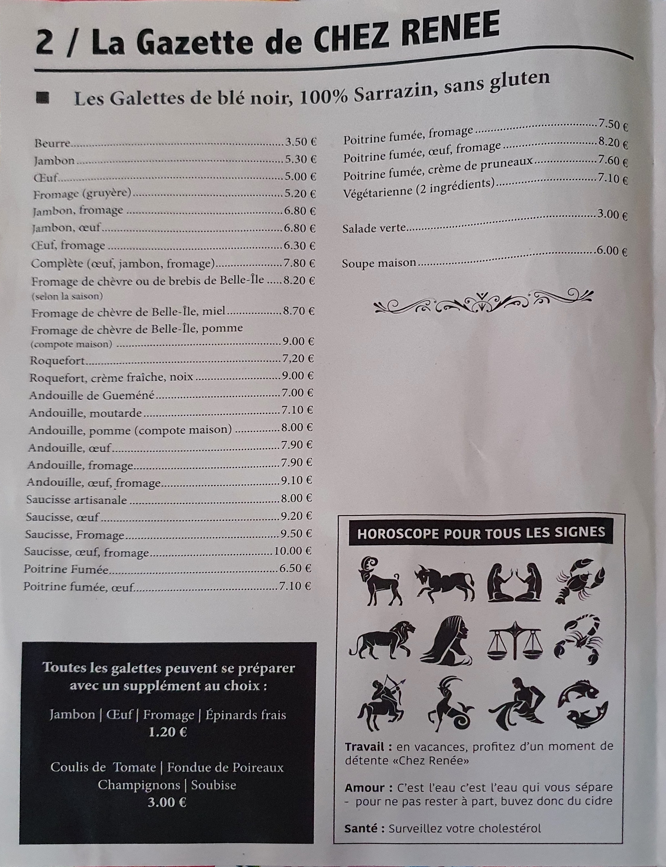 Chez René vit sur sa réputation et une belle ambiance. Malheureusement, la cuisine n'est plus au rendez-vous. Comme à plusieurs reprises ces dernières années, galettes avec du beurre recuit et aujourd'hui une galette chèvre miel avec quasiment pas de miel et une galette complète presque sans oeuf, en partie brûlée au point d'être noire. La propreté ne semble pas au rendez-vous non plus, avec des toiles d'araignées dans la lampe juste au-dessus de la table qui jouxte l'entrée en cuisine... Quel dommage pour cette institution de l'île