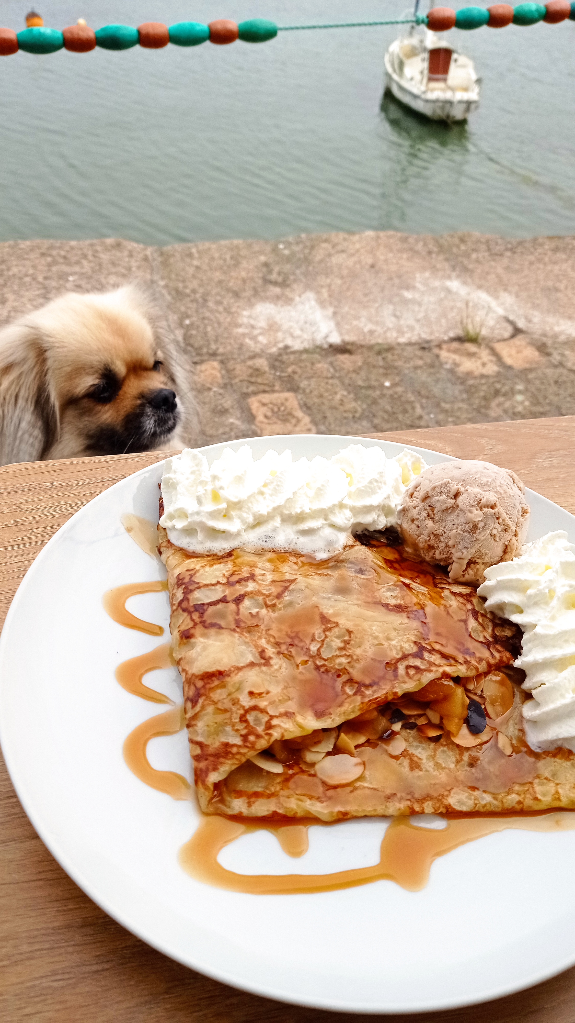 Arrivés sur Camaret vers 15h30,45, affamés, sur le port, la crêperie de la marine est ouverte et nous acceuille avec un chien pour dejeuner. Accueil super chaleureux et sympathique, toutes les crêpes salées ne sont plus disponibles vu l'heure mais la serveuse nous propose cependant un choix intéressant et local. Les crêpes sont délicieuses et bien garnies. La crêpe dessert du jour : pommes cuites, miel local, amande et glace vanille artisanale...une tuerie🤩. Super rapport qualité-prix. Adresse à retenir.