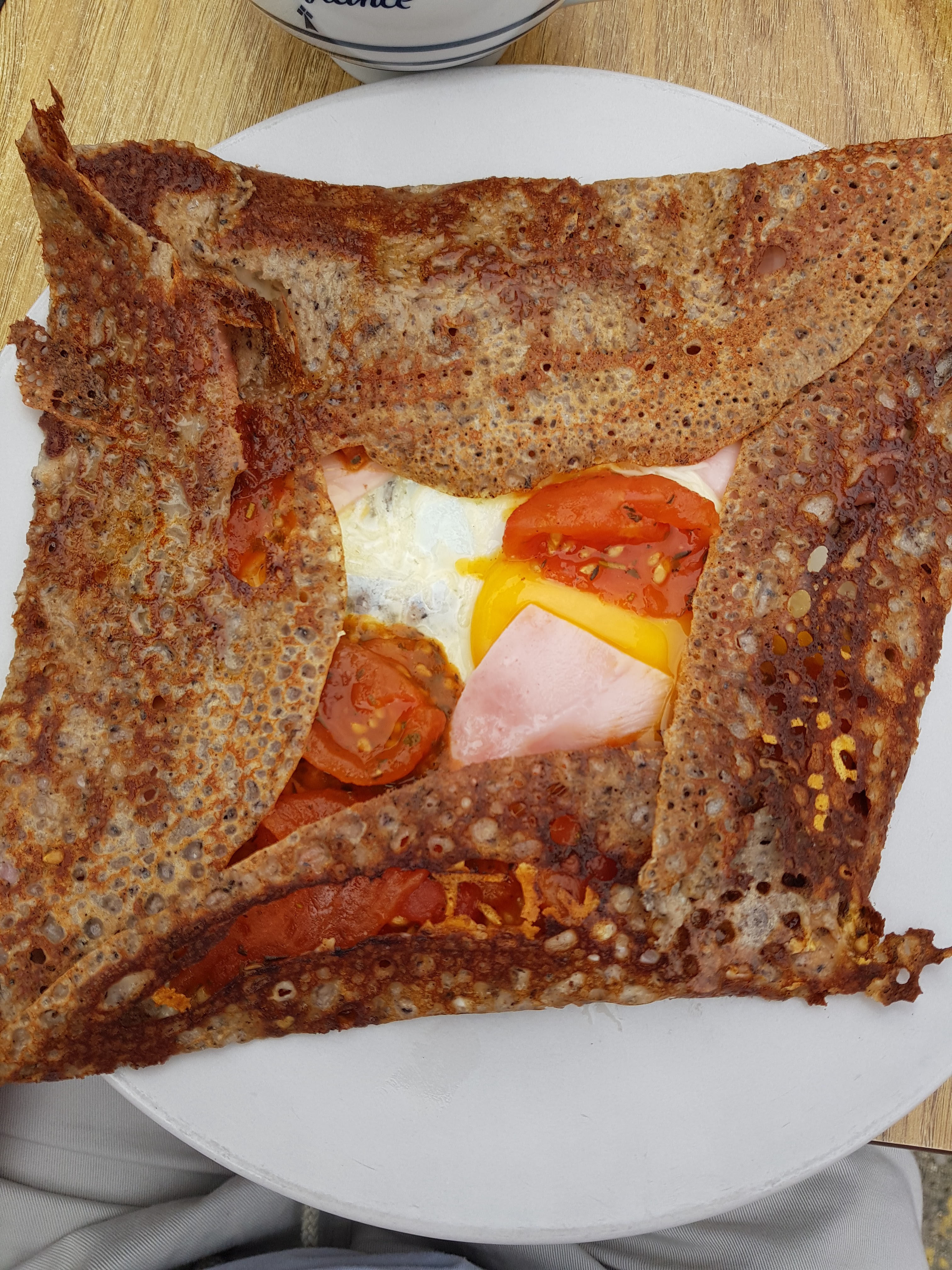 Arrivés 12h00 juste, sans réservation, un accueil souriant et agréable, un service rapide, des galettes à la fois croustillantes, moelleuses et généreuses en garniture... passé 12h15, il est préférable d'avoir réservé... Le plus c'est la cuisine ouverte dans laquelle on ne peut que saluer l'incroyable dextérité des cuisiniers avec leurs 8 crêpières... Le moins : il n'y en a pas... tout était parfait ! Merci beaucoup pour ce moment Vue exceptionnelle