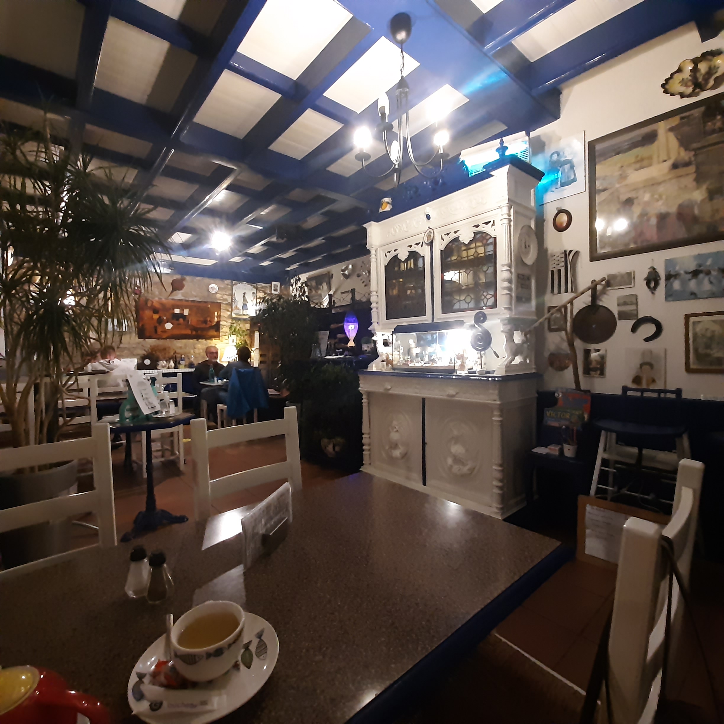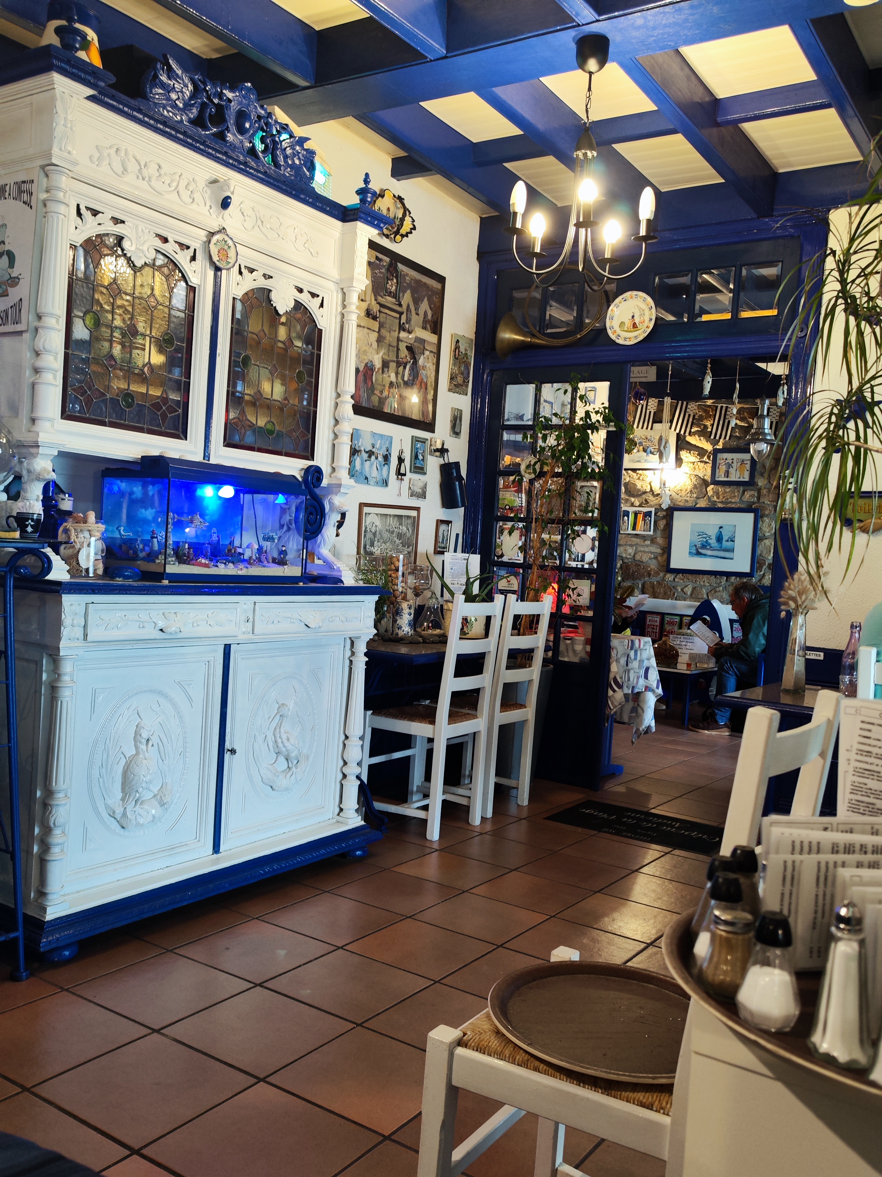 Décor très agréable à dominante bleue avec quelques détails me rappelant la Bretagne de mon enfance. Bon accueil. Vue exceptionnelle même par temps de pluie. Comme dans beaucoup de crêperies du coin, les galettes sont bonnes...patron fort sympathique. Prix très corrects pour un bord de mer. Que demander de plus?
