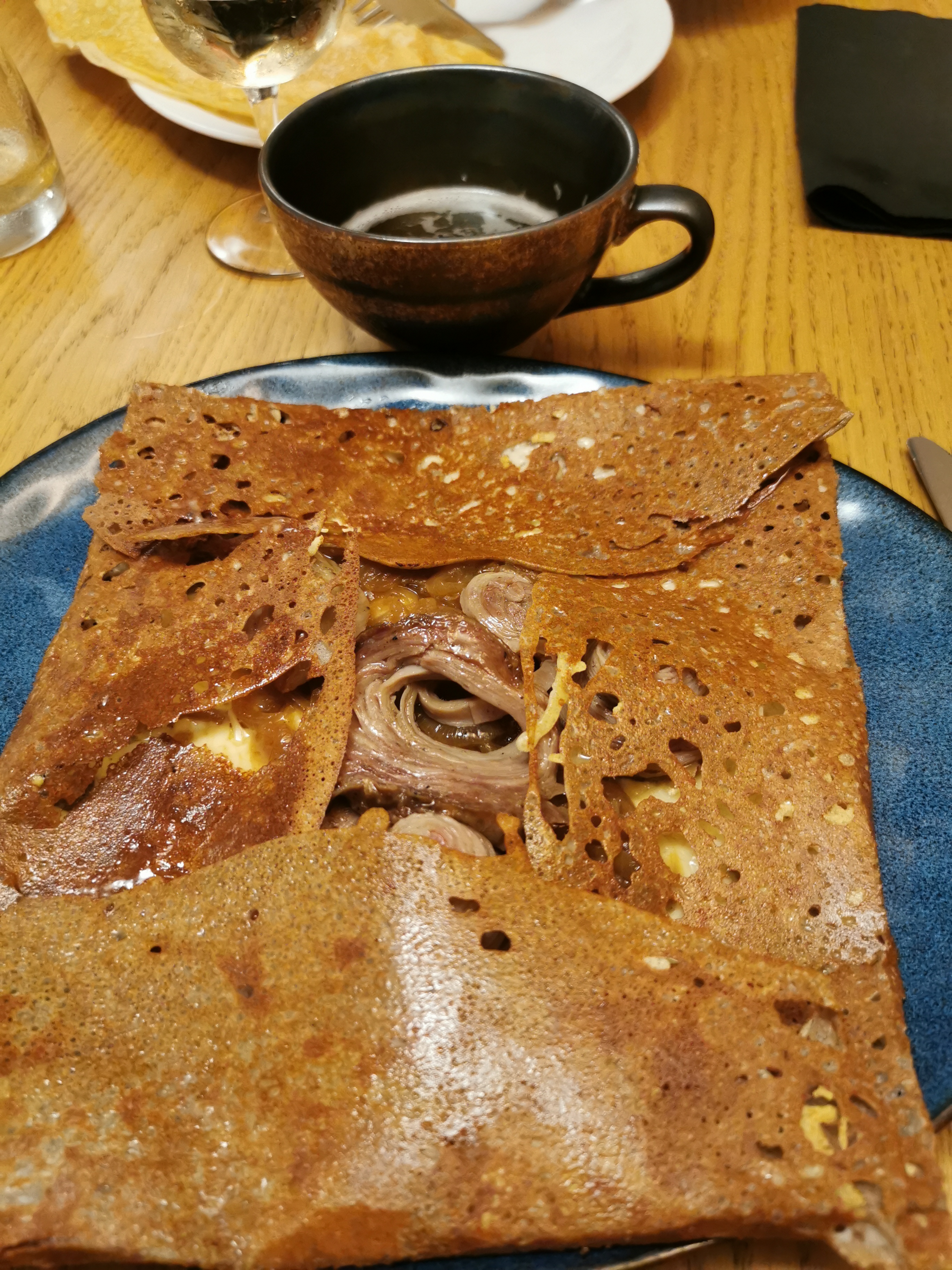 Accueil super agréable et avec tout ça les crêpes un délice pour ma part la 1ere aux gésiers et pommes la qualité et quantité rien à en dire et ensuite saucisse avec ces petits oignons confits sublime je cale pour la dessert mais je reviendrai sans hésiter merci à vous et bonne continuation à bientôt