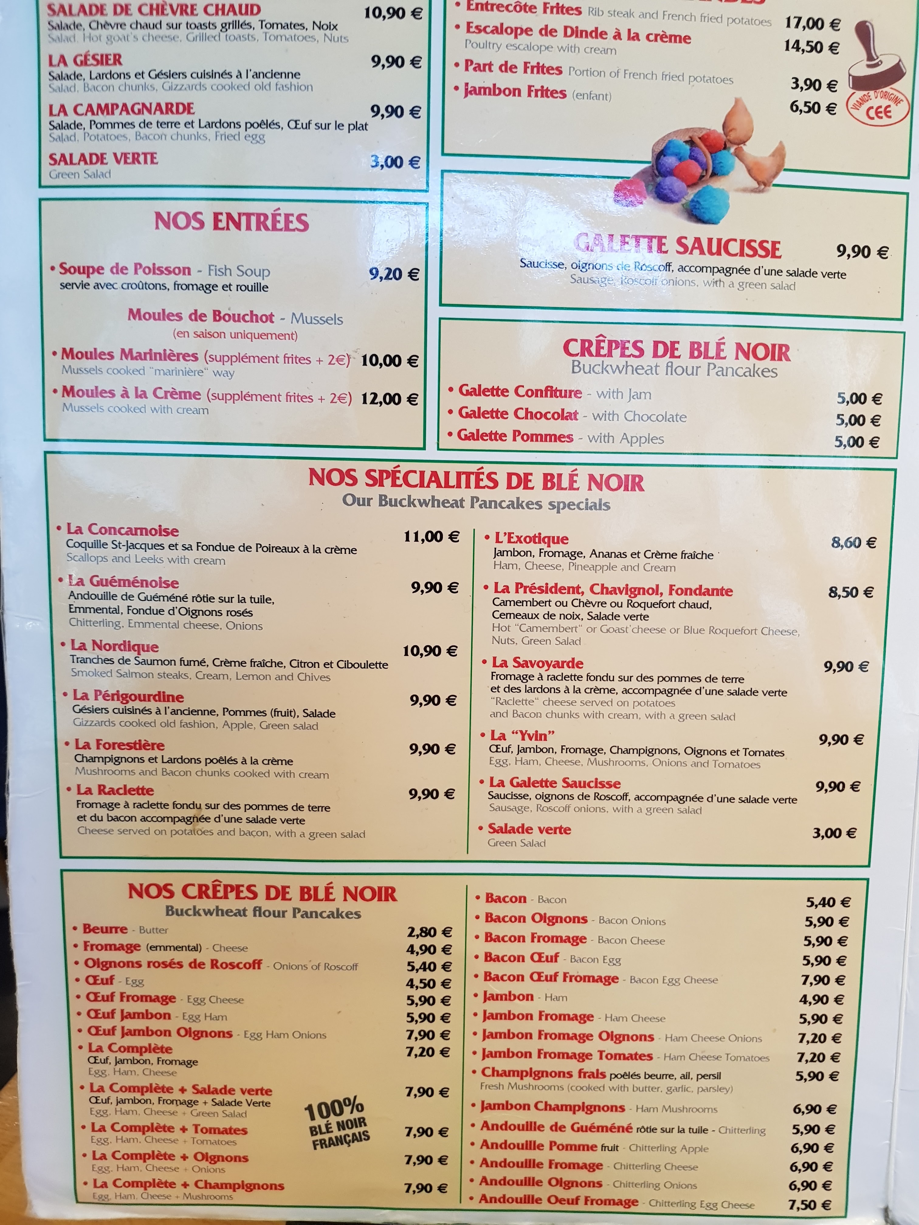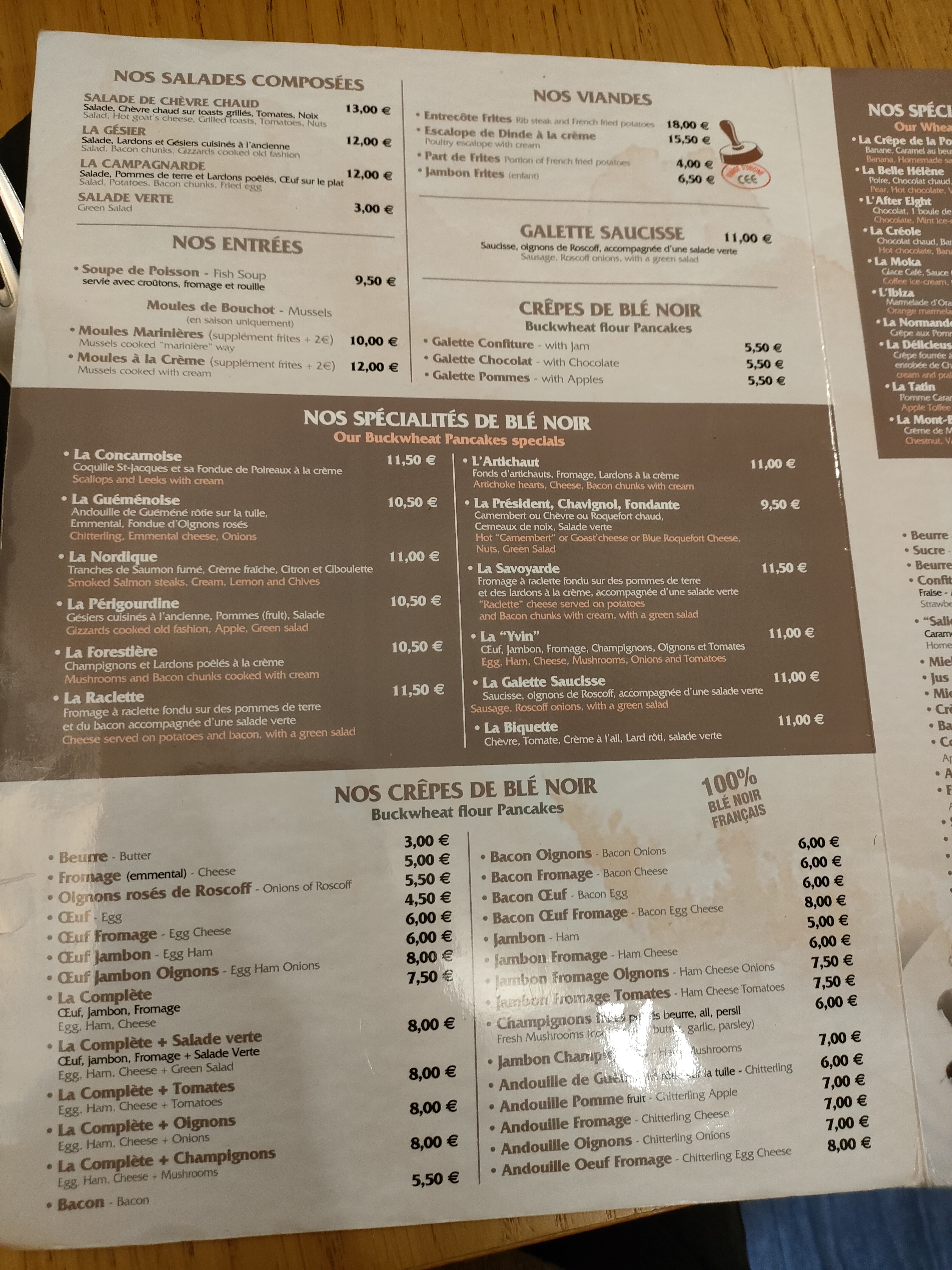 Endroit sympathique, mais un peu cher pour ce que c'est. Nous sommes venus à 18, une belle tablé donc un bon chiffre pour eux ! On nous a précisé qu'il faudrait nous dépêcher, qu'on ne devrait pas rester longtemps pour manger, c'était un peu étrange. En ce qui concerne les prix, les froments sont moyennement fournis, mais au juste prix. D'autres produits sont moins juste : 3.80 la salade normalement en plat à part (une salade très légere, pas du tout fournit), proposée avec les crêpes. Ce n'est pas très clair quand on propose ''Vous voulez de la salade en accompagnement de la crêpe'' comme si ça venait avec les crêpes de base alors que c'est un autre plat. La moitié de mes camarades ne l'avaient pas compris. 2 euros la chantilly industriel (pas précisé sur la carte) et 7 euros la crêpes caramel avec peu de caramel. Les cidres sont chers aussi. Endroit charmant quand même, personnel TRÈS gentil et agréable, aucun souci là dessus ! Si vous y allez vous passerez quand même un bon moment mais ce n'est pas celle que je conseillerais en premier pour Roscoff ;)