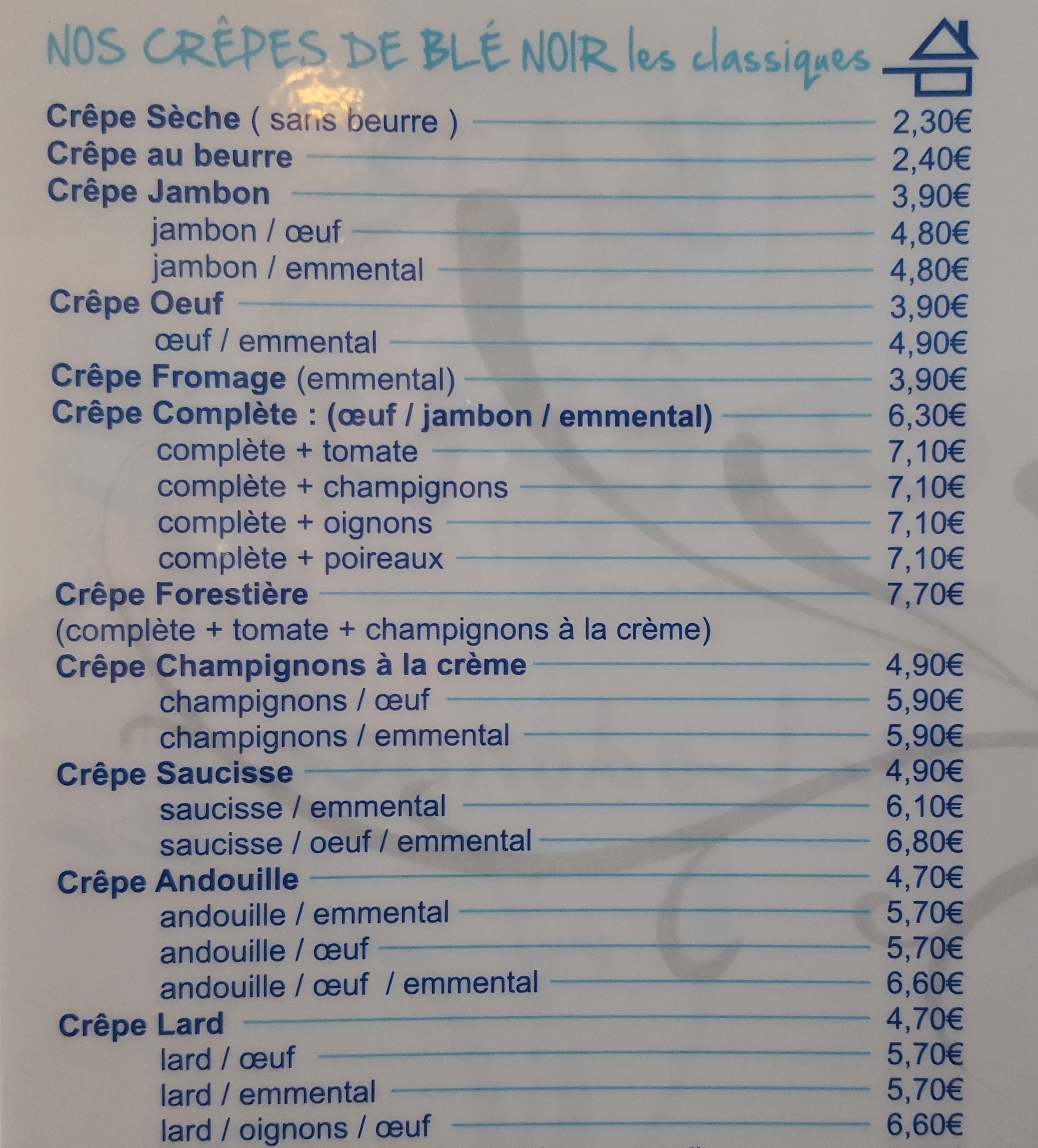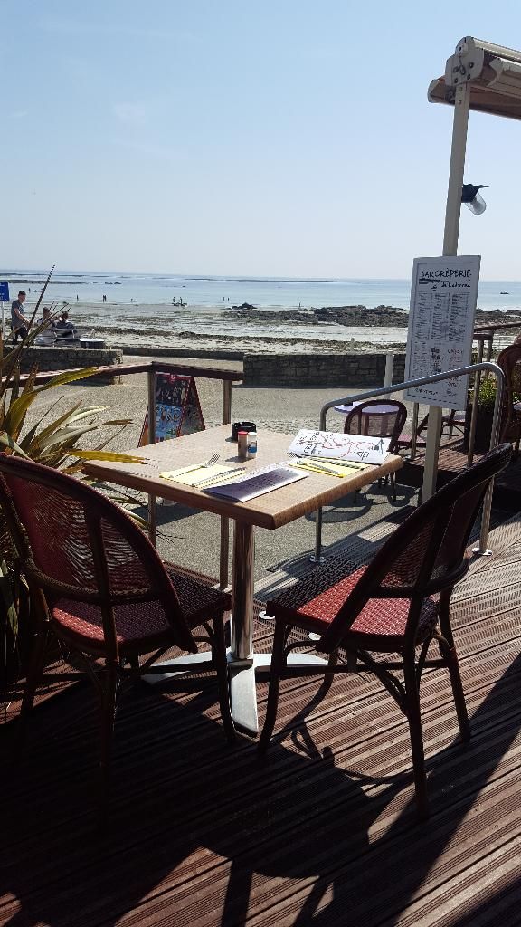 Nous y avons mangé 3 fois cette semaine. Moules-frites sauce maison, crêpe complète champignons, crêpe végétarienne, crêpe Bigoudén, crêpe pommes rissolées caramel beurre salé... bref tout était bon à un prix honnête. Cidre très bon aussi. Magnifique vue sur la plage, service rapide. Petit plus : le service continu contrairement aux autres restaurants du coin. Si je peux me permettre, j'ai trouvé le prix du supplément chantilly à 1.60 euros assez cher par rapport au reste.