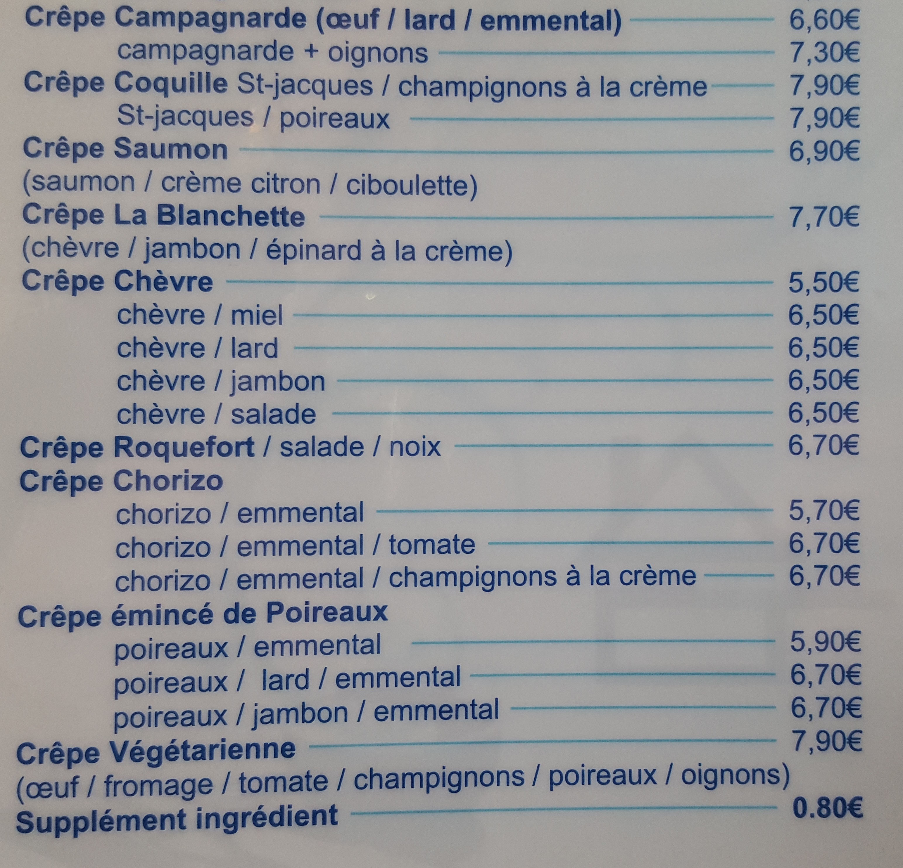 Les galettes sont délicieuses et bien garnies et à un prix raisonnable, surtout pour une crêperie de bord de mer ! Presque toutes les galettes étaient à un prix inférieur à 10€. J’ai particulièrement apprécié que les légumes soient bien préparés et cuits.
