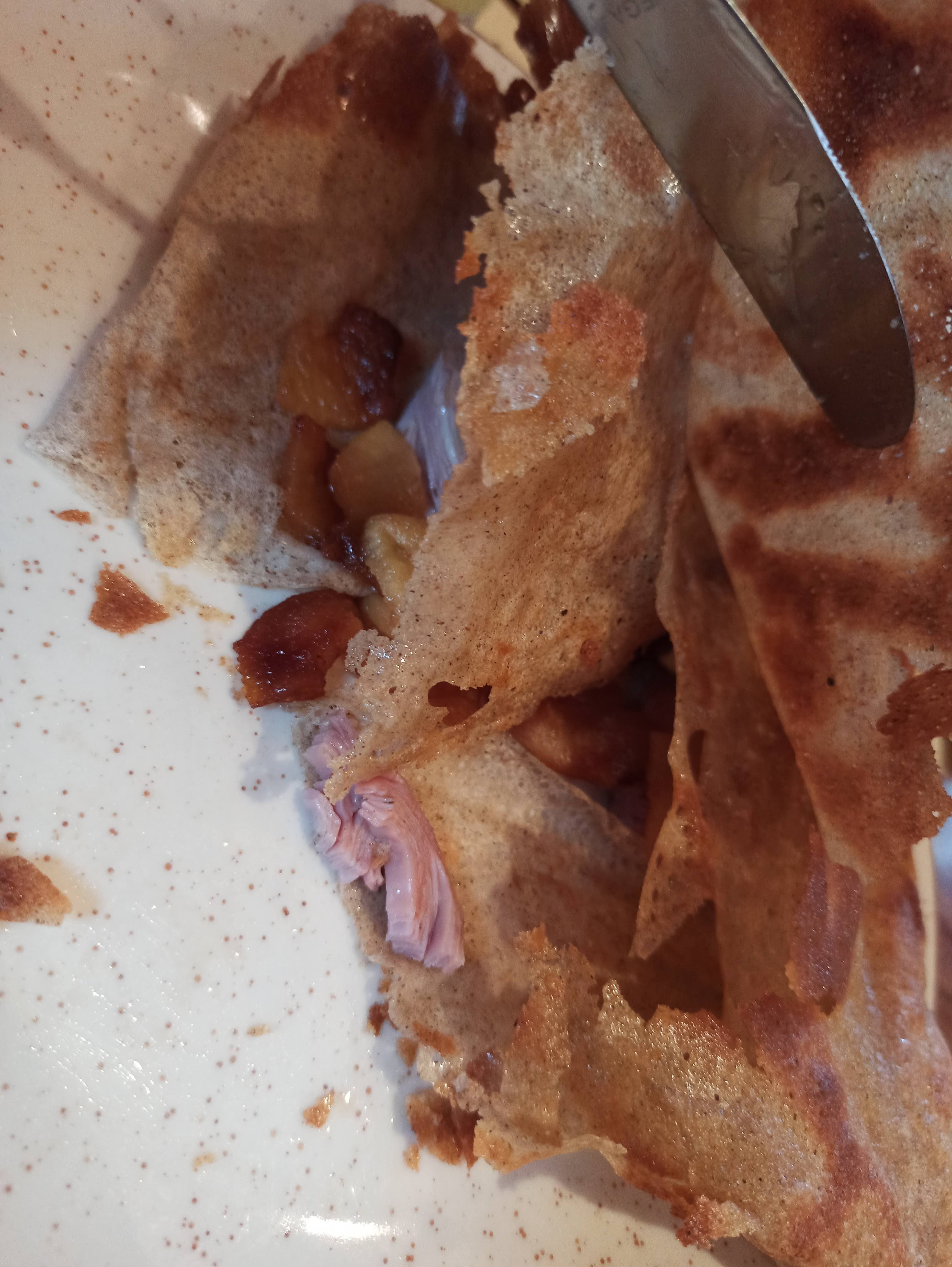 Bonnes crêpes qui mériteraient de vraies saucisses et lard fermier .