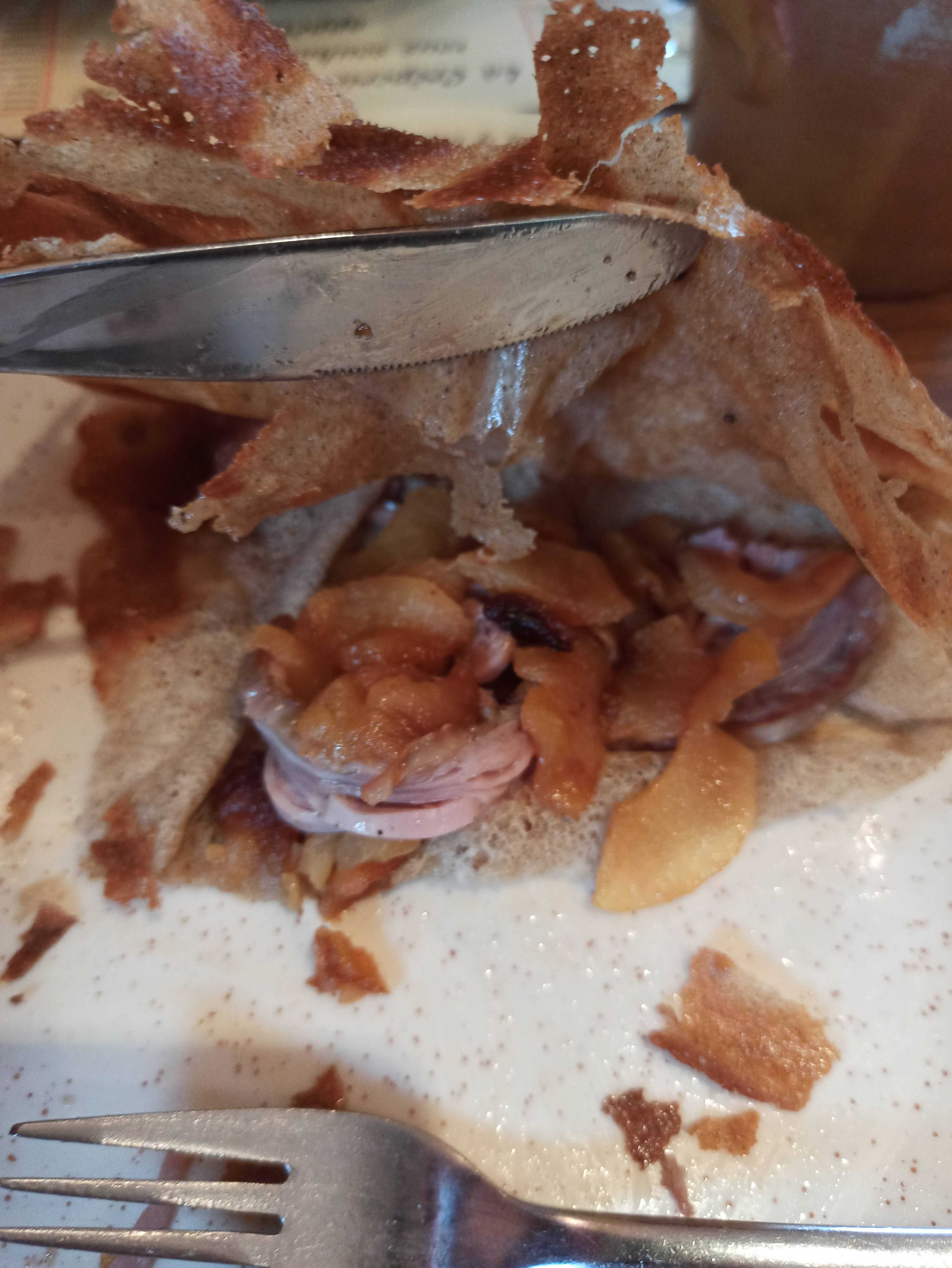 Crêpe cramée cassante pas bonne je sors de formation à la crêpe au logis Moy de Questembert je suis très déçu heureusement que Jean Philippe ne nous apprend pas à travailler comme ça