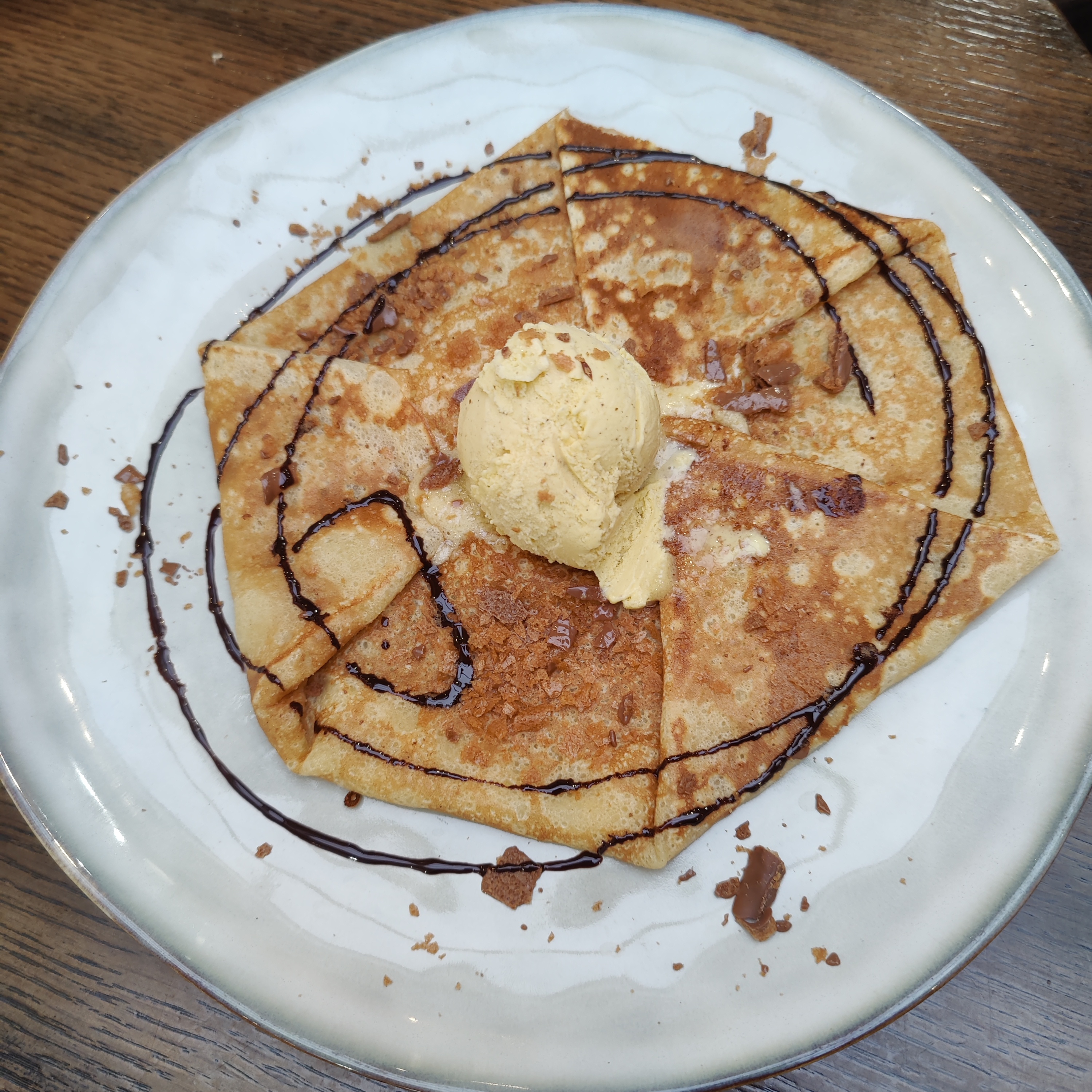 Belle découverte crêperie très agréable, accueil chaleureux, galette généreuse et délicieuse, prix abordable je recommande vraiment.