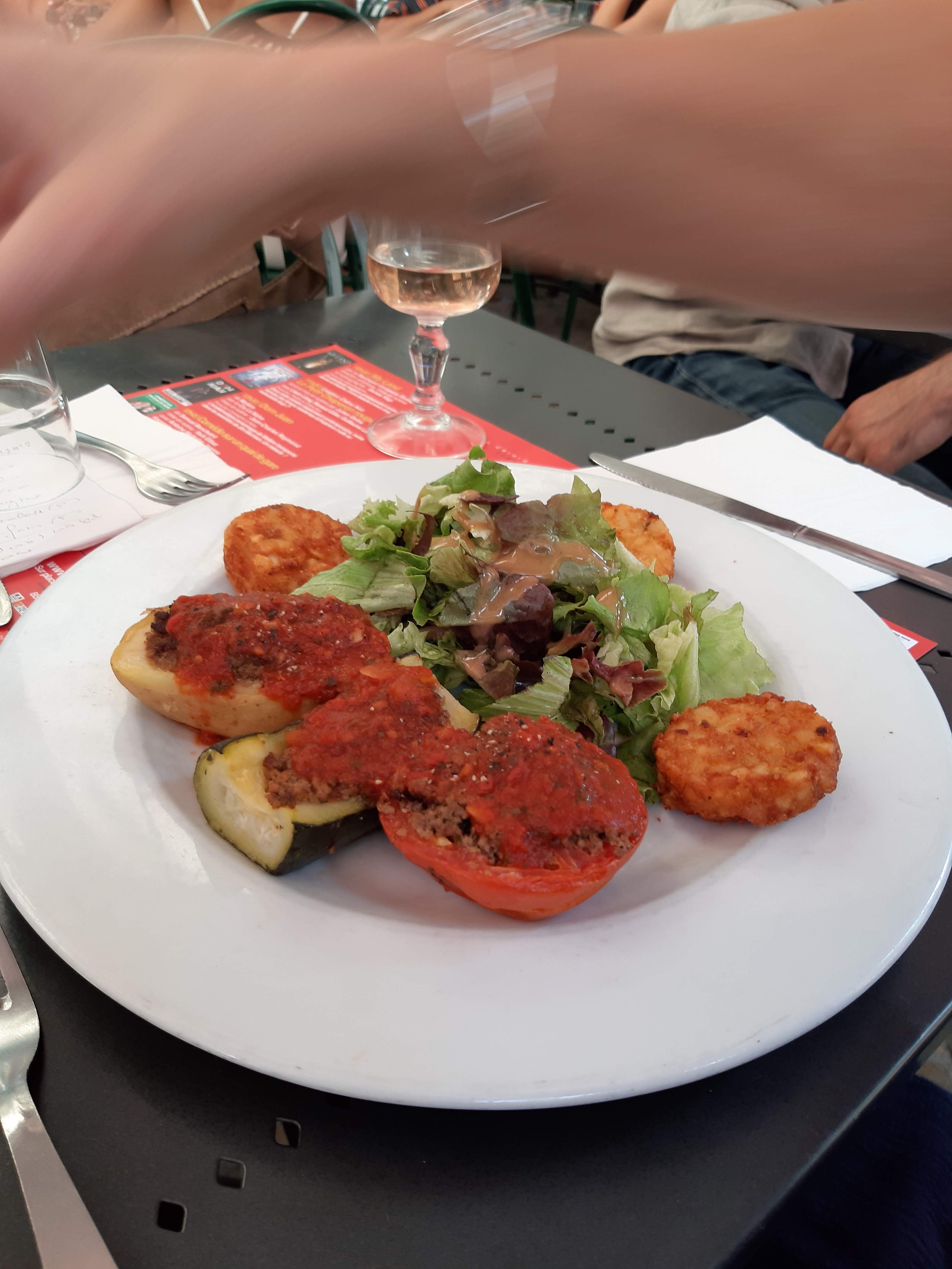 Ce n'est pas un restaurant, une cantine...Les petits farcis de Provence : une demi patate, une demi tomate, un morceau de courgette, un peu de farce posée dessus (avec parcimonie), on asperge avec une sauce tomate en brique, 4 galettes de pommes de terre congelées, voila un plat typique provençal !