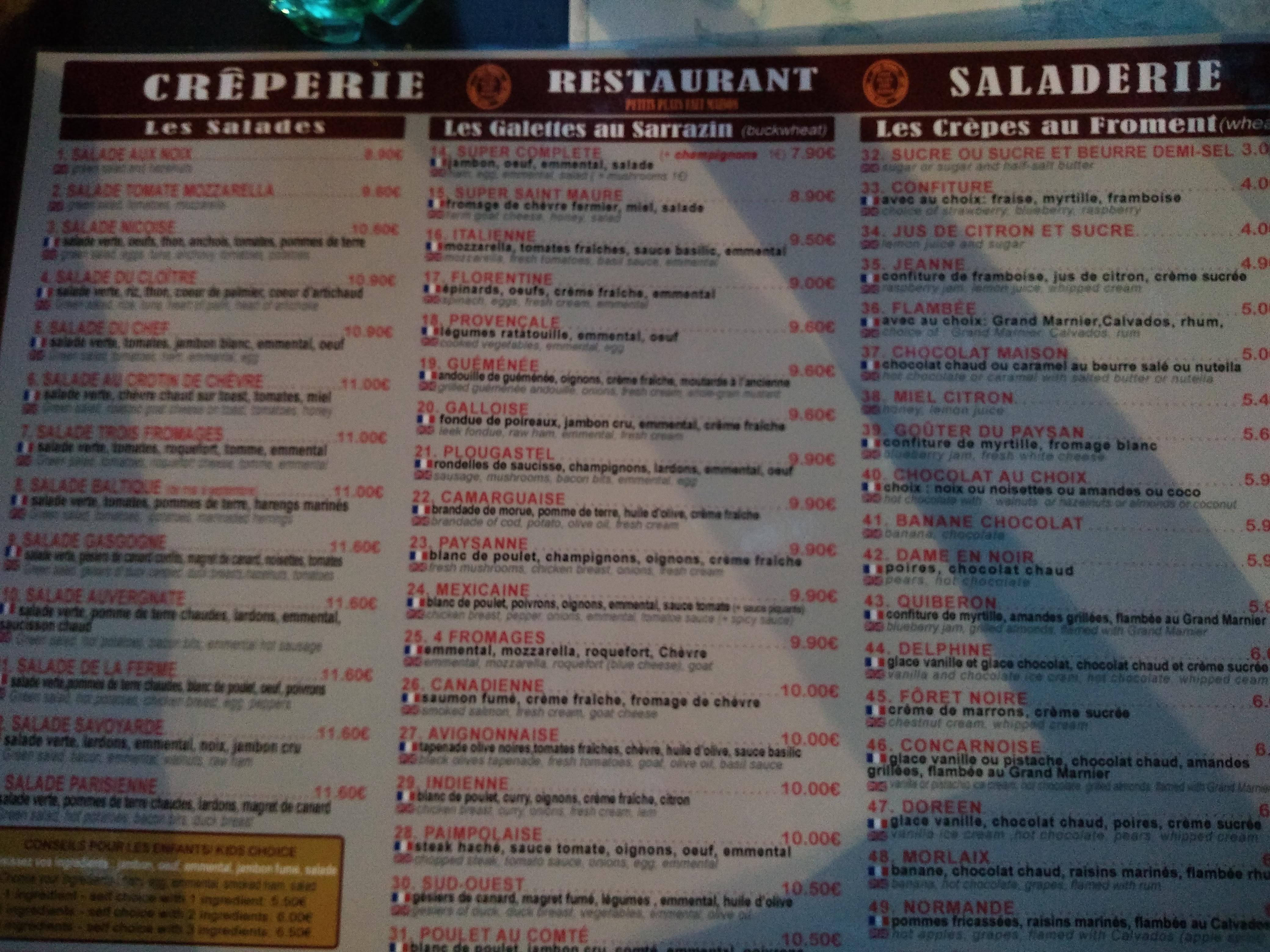 Tres bonne impression de ce restaurant en general. Le cadre est tres joli, la place est au calme et les crepes sont excellentes. Sucré, salé, il y en a pour tous les goûts, et le cidre est excellent aussi. A recommander !