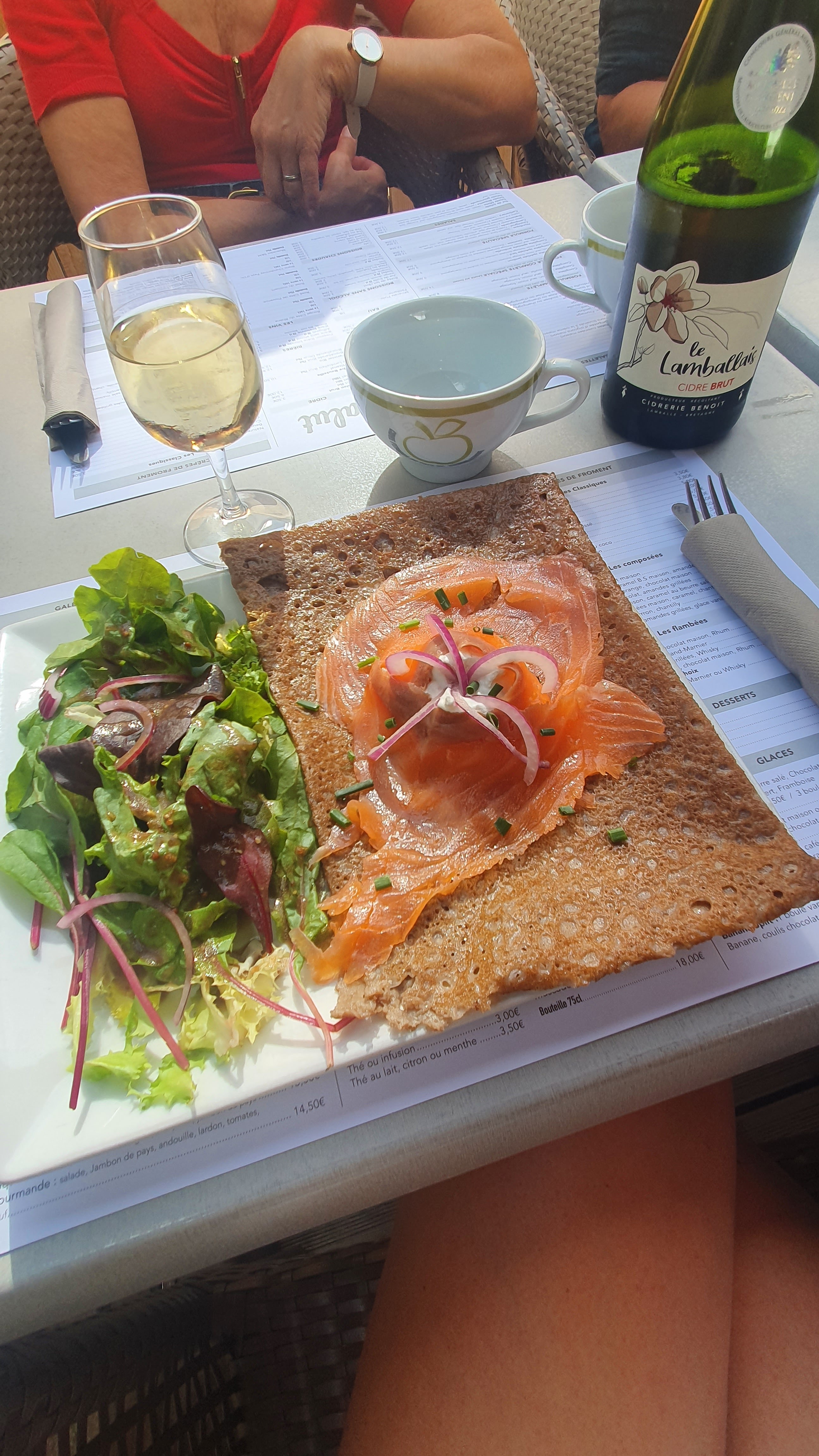 Nous sommes venus le soir de mon anniversaire le 5 septembre. Tranquille le temps pour prendre l'apéritif, ensuite à la commande la galette bretonne. Bien garnie, elle se laisse mangée accompagnée d'une salade. J'ai pris une formule qui inclut 40 cl de cidre pour 17 eur. Le cidre ,je le trouve trop sucré un brut aurait été mieux En dessert, une crêpe au caramel 👌