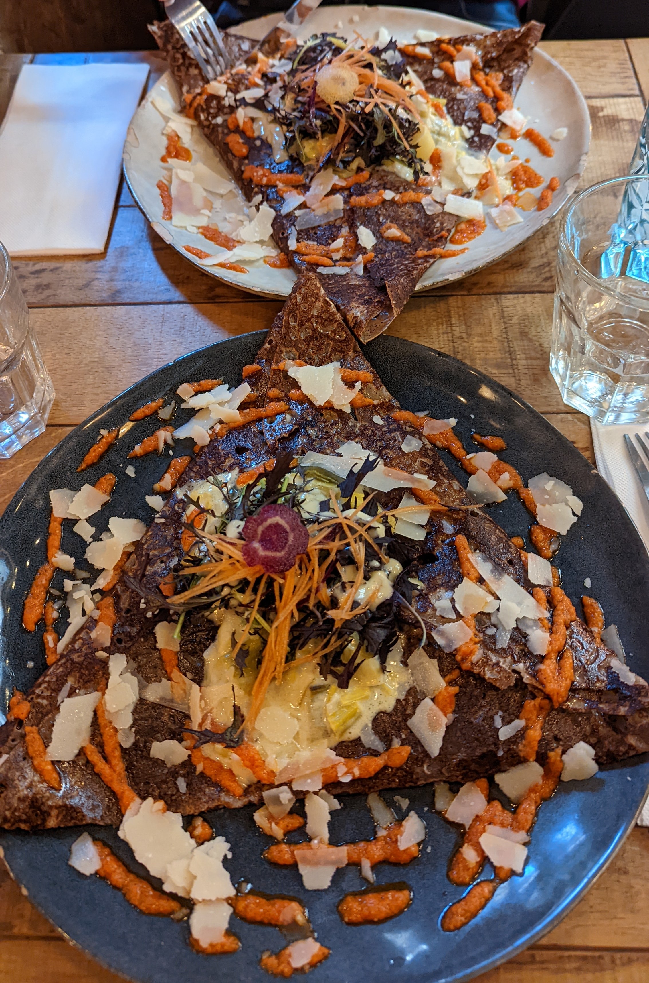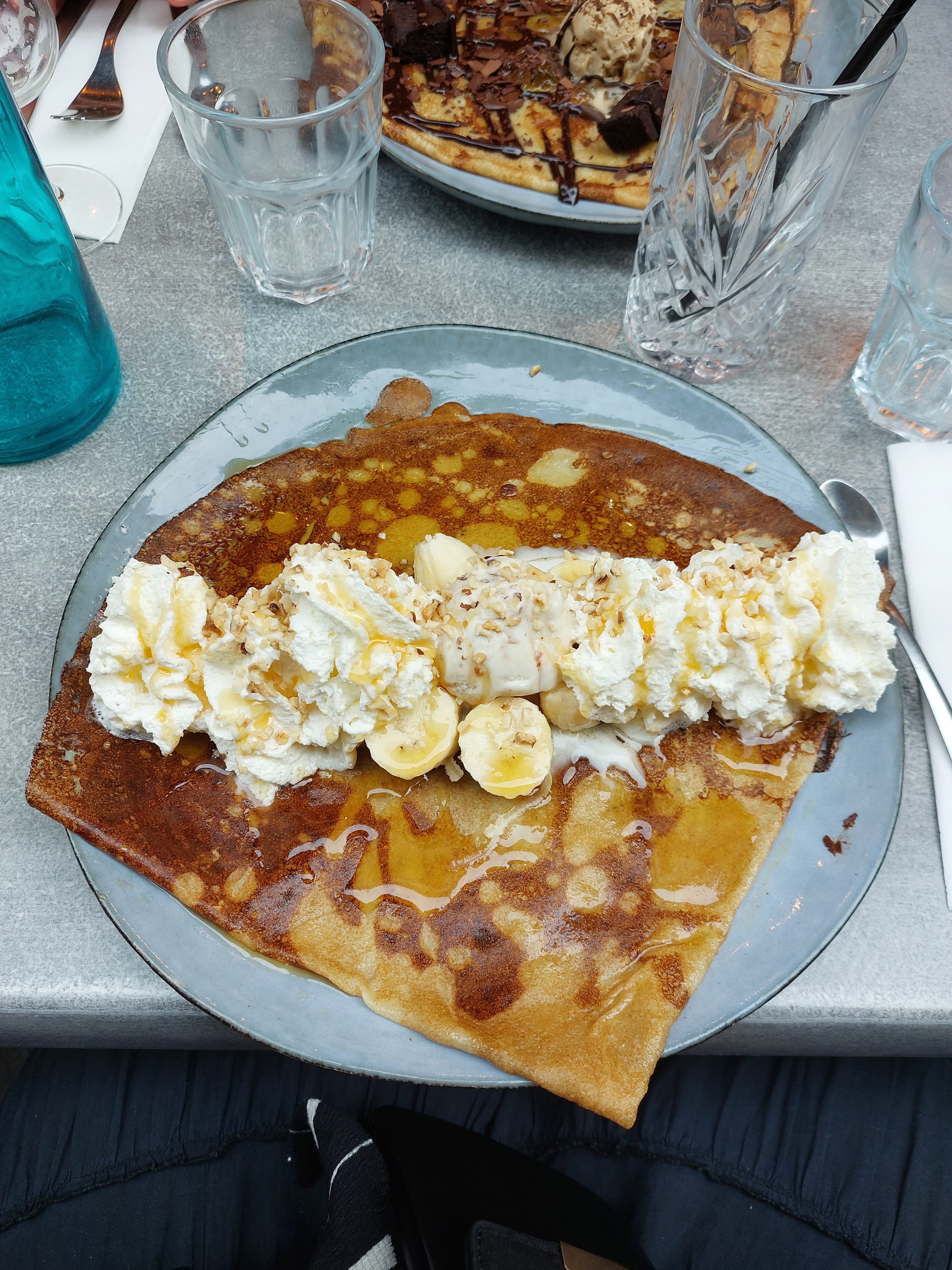 Première fois en Bretagne nous ne pouvions passer à côté de ce plat emblématique. La galette du mois à la fondue de poireaux était très bonne, par contre la crêpe dessert était un peu trop sucré pour nous !