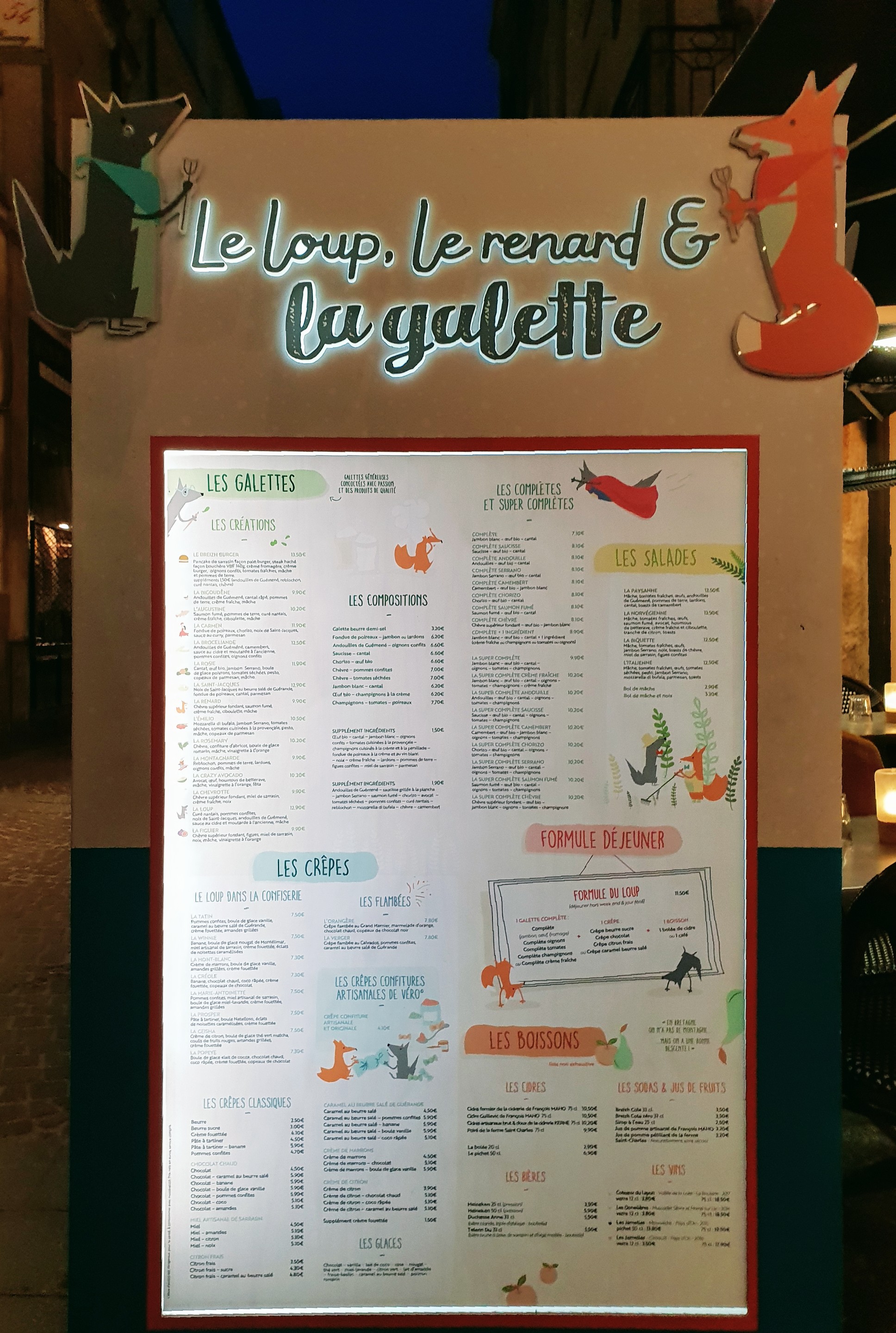 Arrivée avec des amies un samedi soir, il y avait beaucoup de monde mais nous avons été très bien accueillies. Pour ne pas qu'on attende trop longtemps, la patronne nous a installé a l’extérieur, avec chauffage et plaids a disposition pour ne pas qu'on ai froid. Le choix de galettes et crèpes est impressionnant et elles sont très bonnes. Je ne met pas les 5 étoiles car je suis juste un peu déçue des galettes pliées en triangle avec la garniture uniquement posée dessus. Le loup le renard et la galette reste tout de même une très bonne adresse a découvrir.