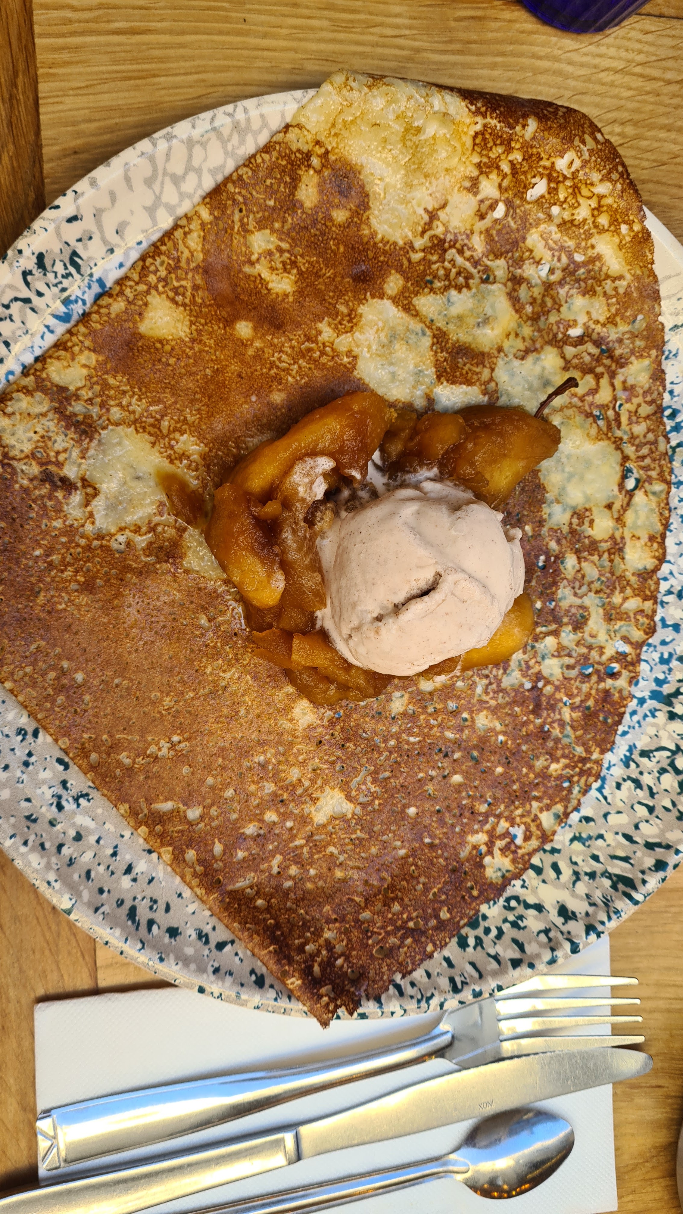 Excellente crêperie. Service rapide et souriant La galette avec andouillette était super bonne La crêpe caramel beurre salé / glace vanille fondante. La meilleure crêperie du coin
