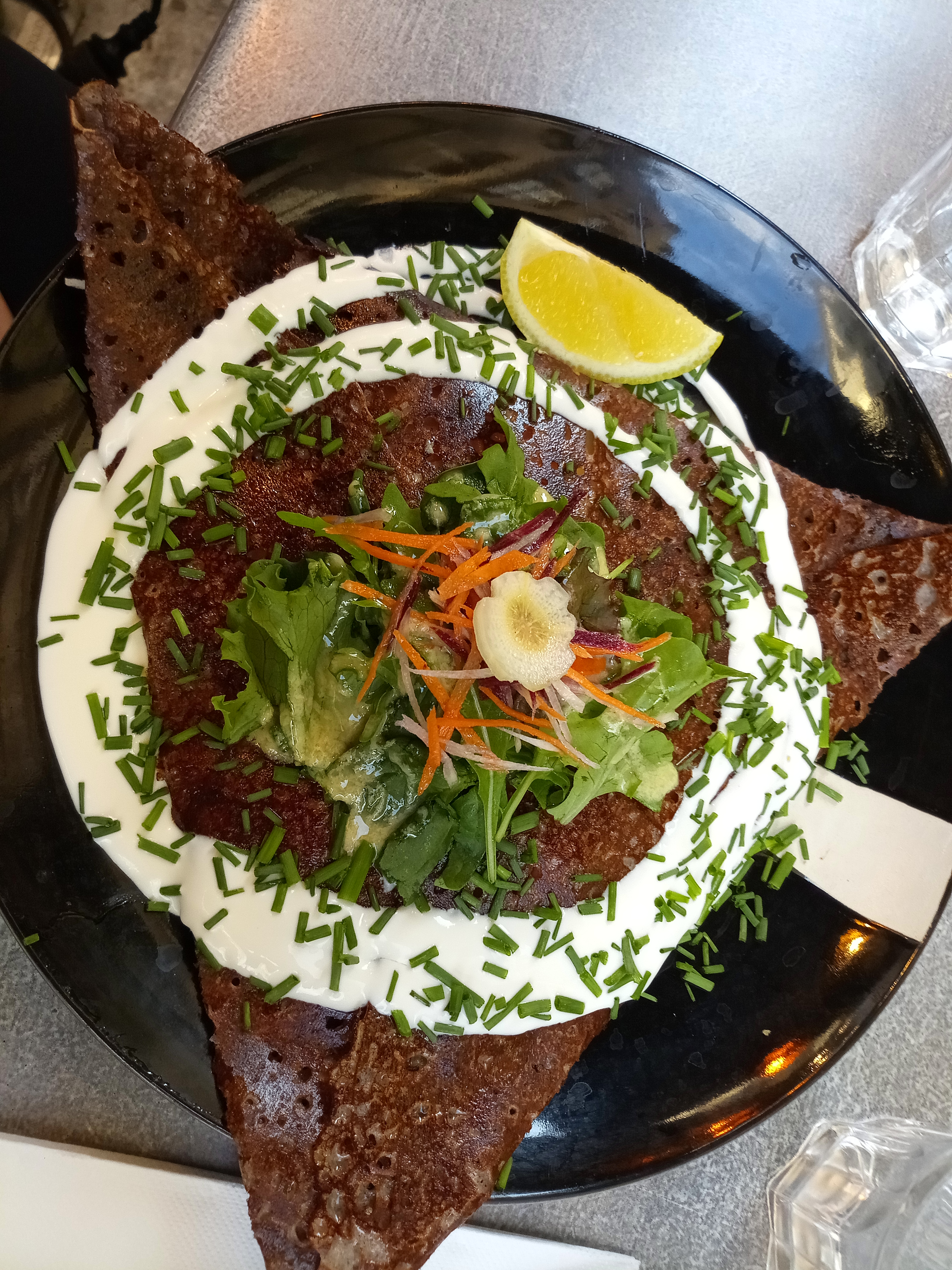 Les crêpes sont très belles, bonnes et copieuses. Les recettes sont originales et variés. Néanmoins il y a peu d'options végétariennes ce qui est dommage... De plus nous avons demandé à emmener notre dessert dans un doggy bag ce qui nous a été refusé, il me semble pourtant que c'est obligatoire de le proposer !