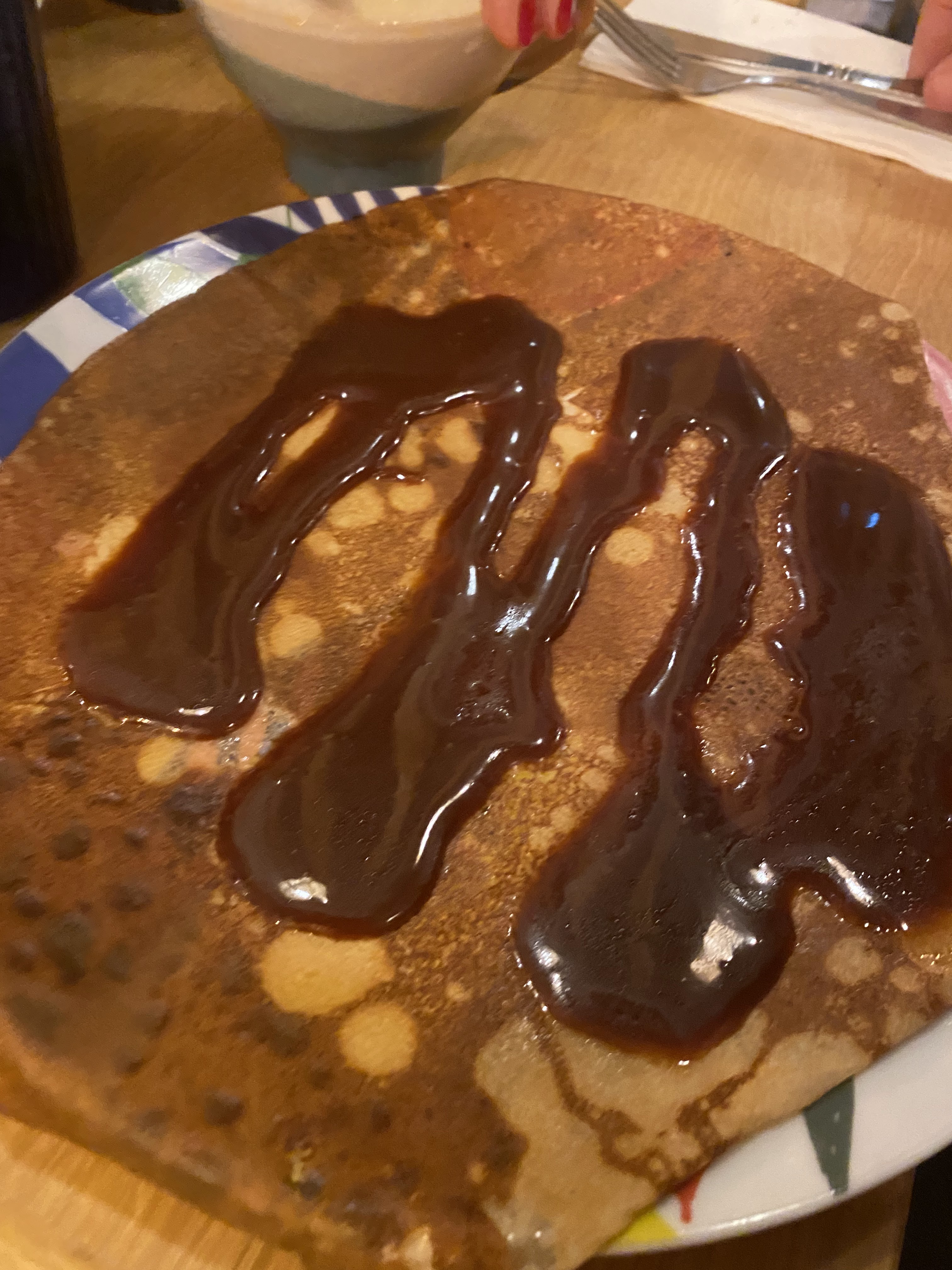 Ambiance chaleureuse et crêpes délicieuses. Très bon moment passé en famille. Ps : si on appuie sur le bouton Ne pas appuyer dans les toilettes il ne se passe rien tout va bien