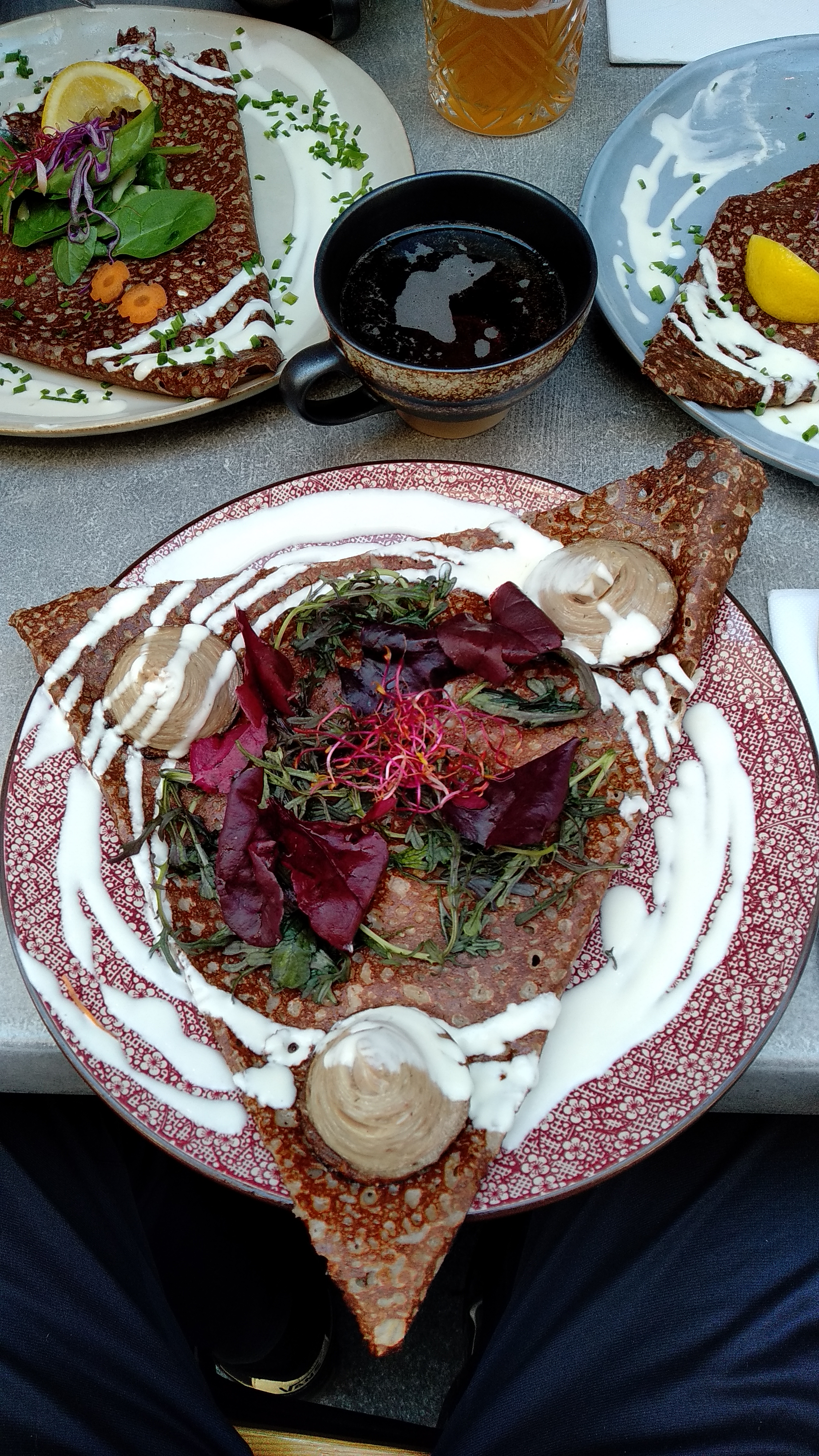 Un régal ces galettes! Il y a du choix, beaucoup de saveurs, les assiettes sont très travaillées, produits de qualité. Niveau timing c'était très bien orchestré. Les serveurs sont très aimables et souriants. Bref on a passé un super moment 🐺🦊❤️