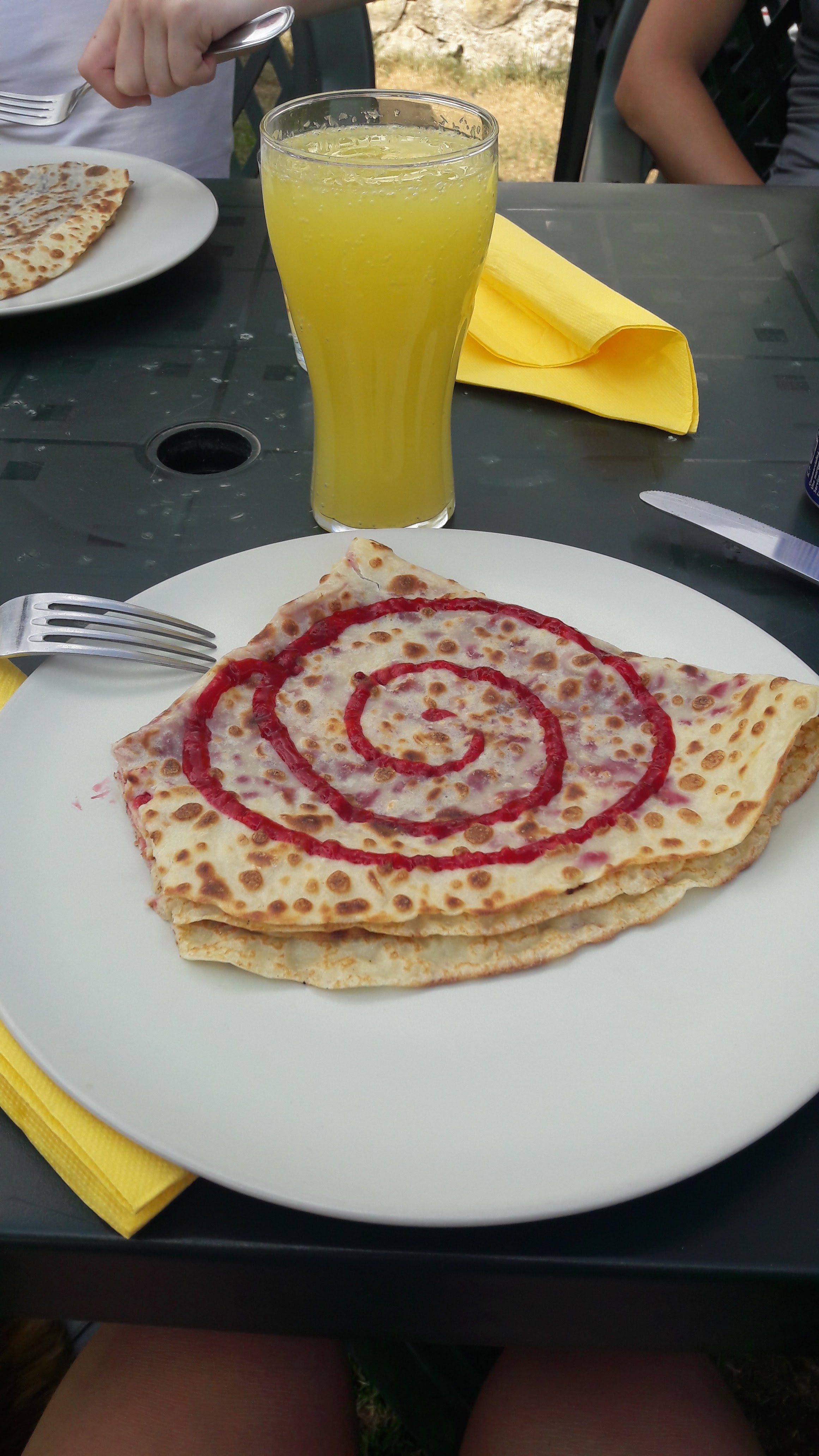 Superbe terrasse panoramique, on a même pu assister au bal des vautours sur les montagnes en face. Niveau menu, ici ce sont des crêpes salées et non des galettes de blé noir comme en Bretagne. Le personnel est très attentionné et sympathique