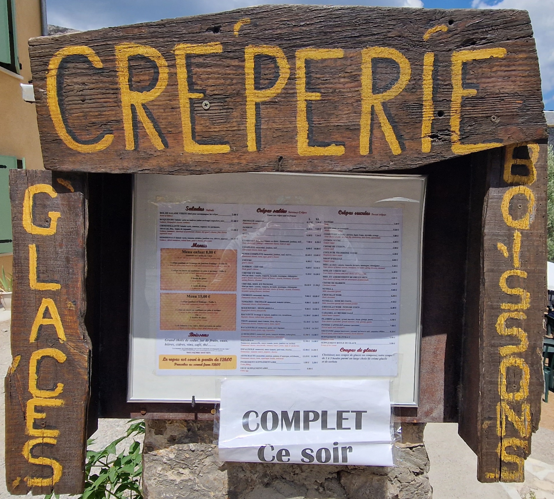 Cette crêperie est située à la sortie du village au départ d'une piste forestière. Les crêpes sont bonnes ; les tables offrants la plus belle vue (stratosphèrique comme il se dit de nos jours) sur le Canyon du Verdon sont vites prises d'assaut. Les vautours qui passent au-dessus de nos têtes sont eux aussi STRATOSPHÈRIQUE sans oublier cet olivier au beau milieu de la terrasse :tout simplement un autre monde...