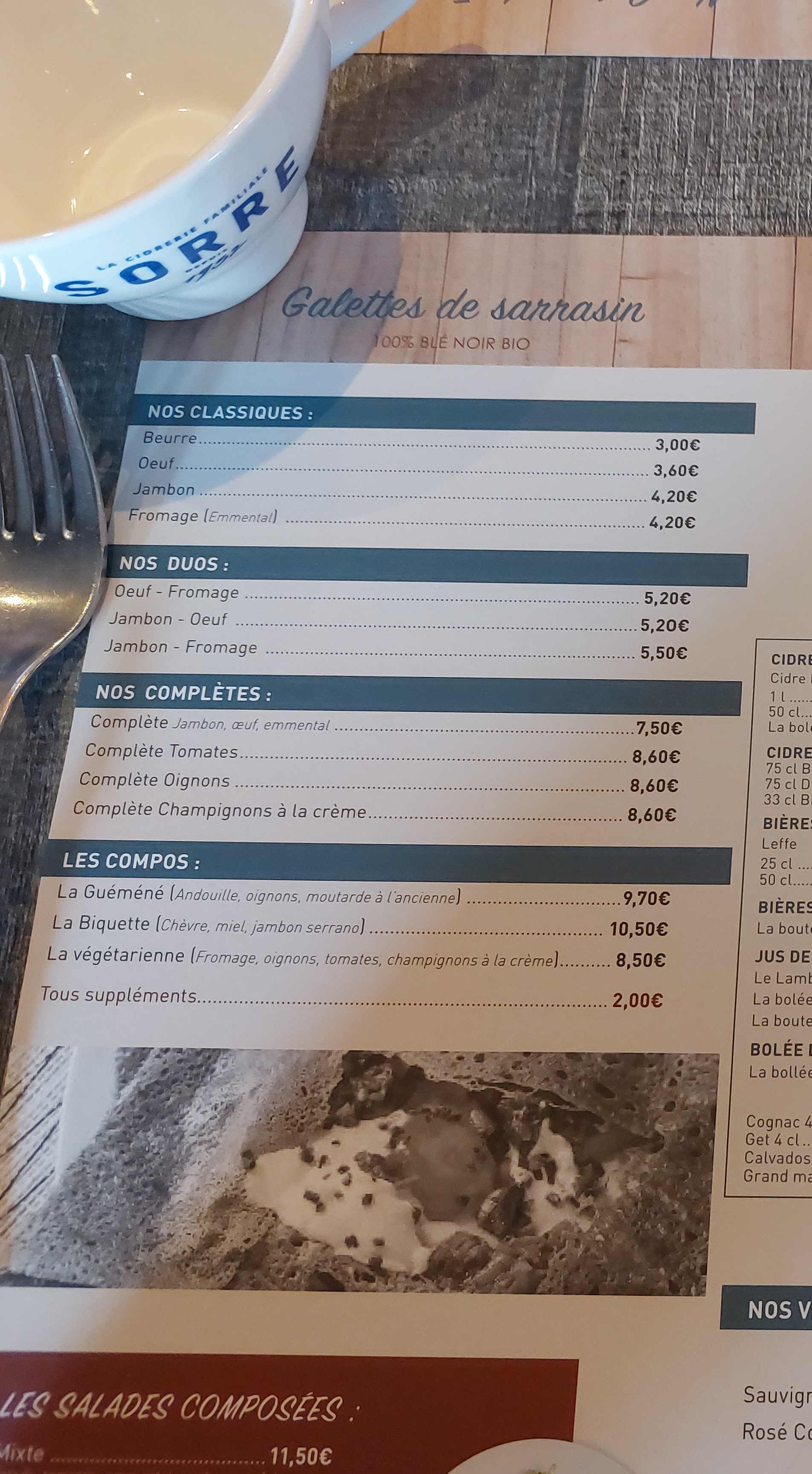 Lieu sympa nous avons mangé avec ma fille par contre les galettes pas top top niveau goût et en dessert nous avons pris les crêpes la crêpe n'était pas cuite du tout et environs 100 g de sucre par crêpes donc autant vous dire niveau goût c'était pas top par contre niveau prix ça reste correct pour la vue que nous avons eu
