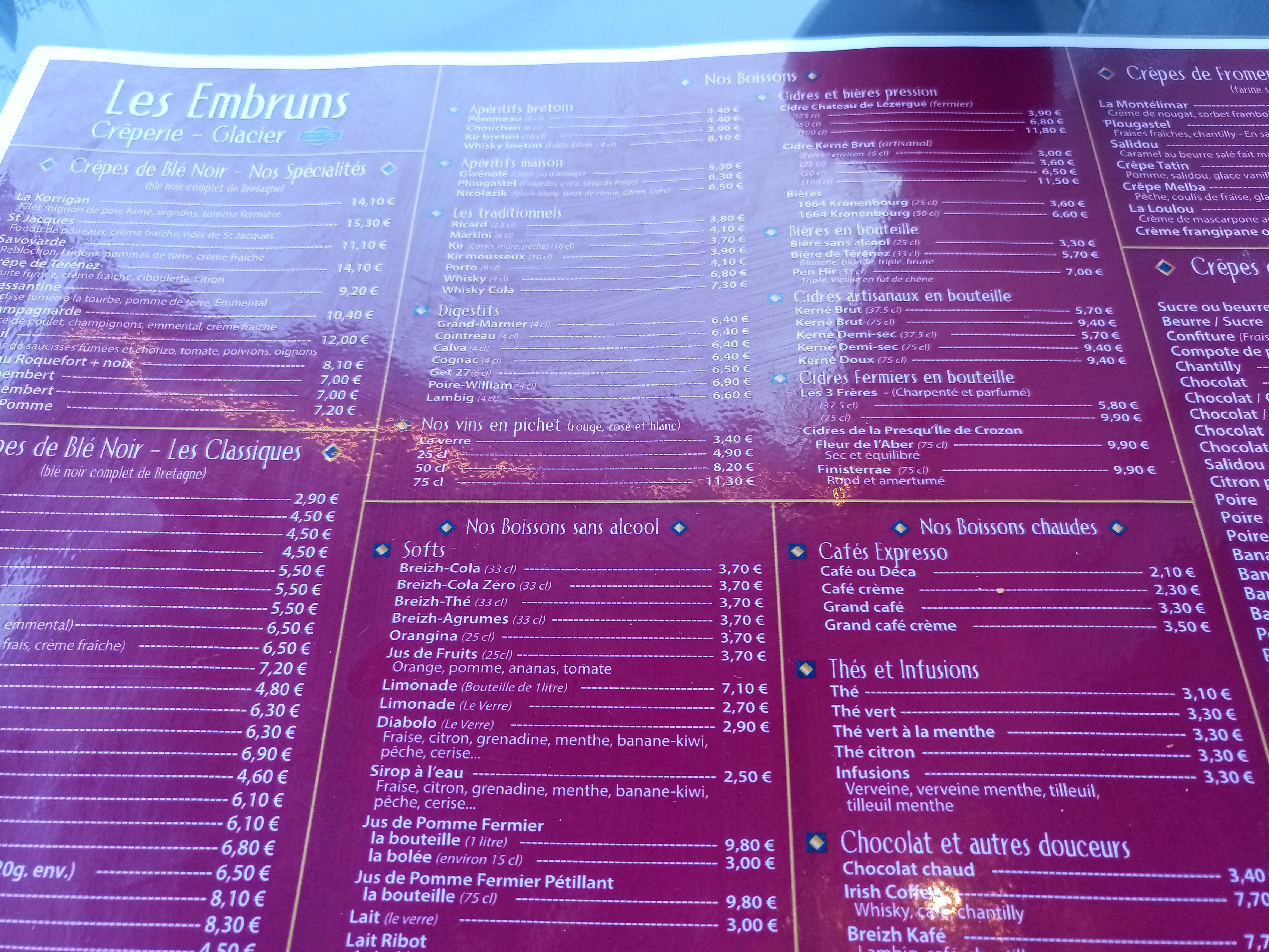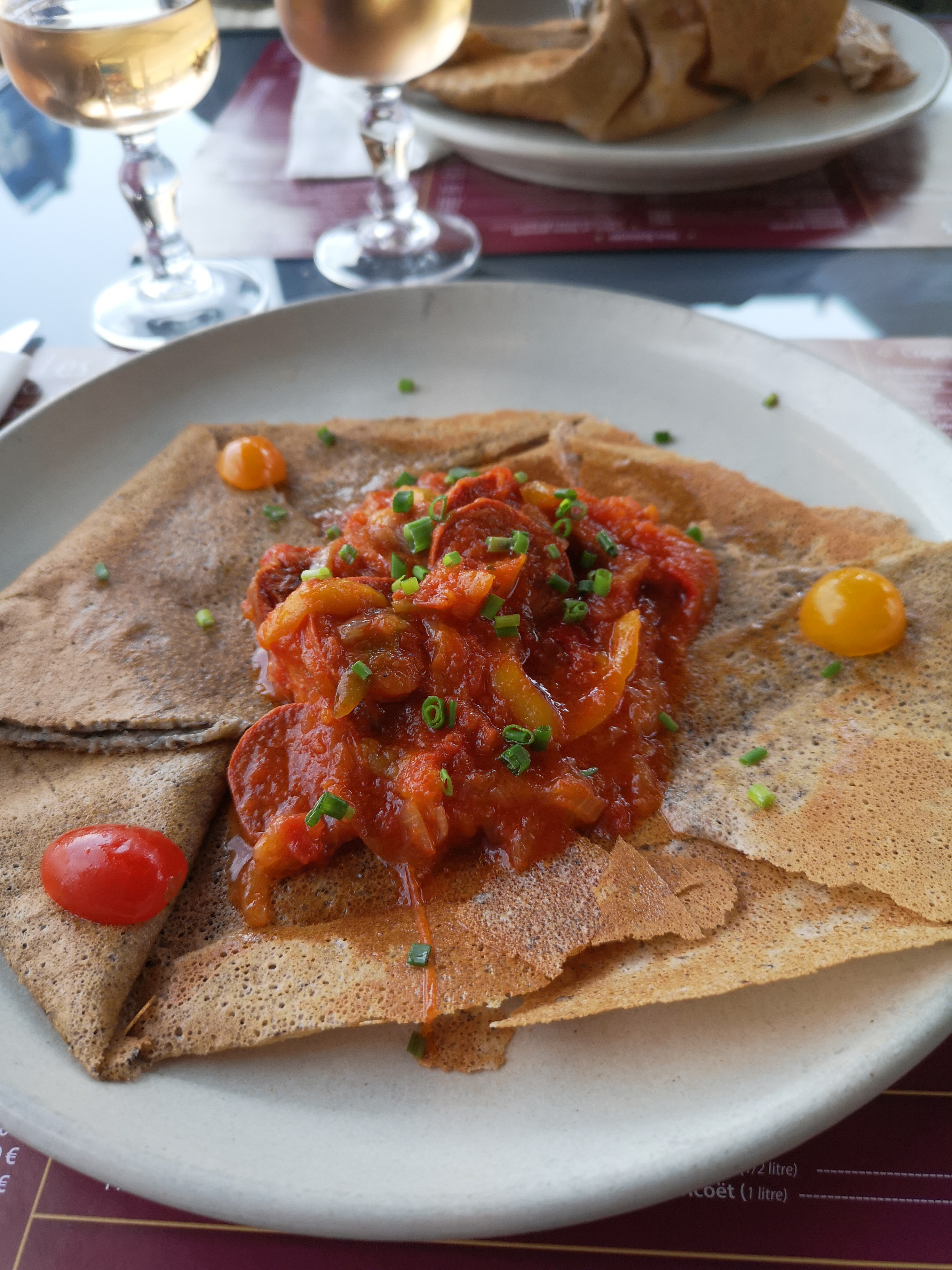 Les crêpes sont délicieuses et fabriquées à la main. Je vous conseille celle aux noix de Saint jacques avec fondue aux poireaux, le tout accompagné d’une bonne bouteille de cidre Fleur de l’Aber. L’endroit est très agréable avec une superbe vue sur le port de plaisance de Camaret et en arrière plan, la tour Vauban.