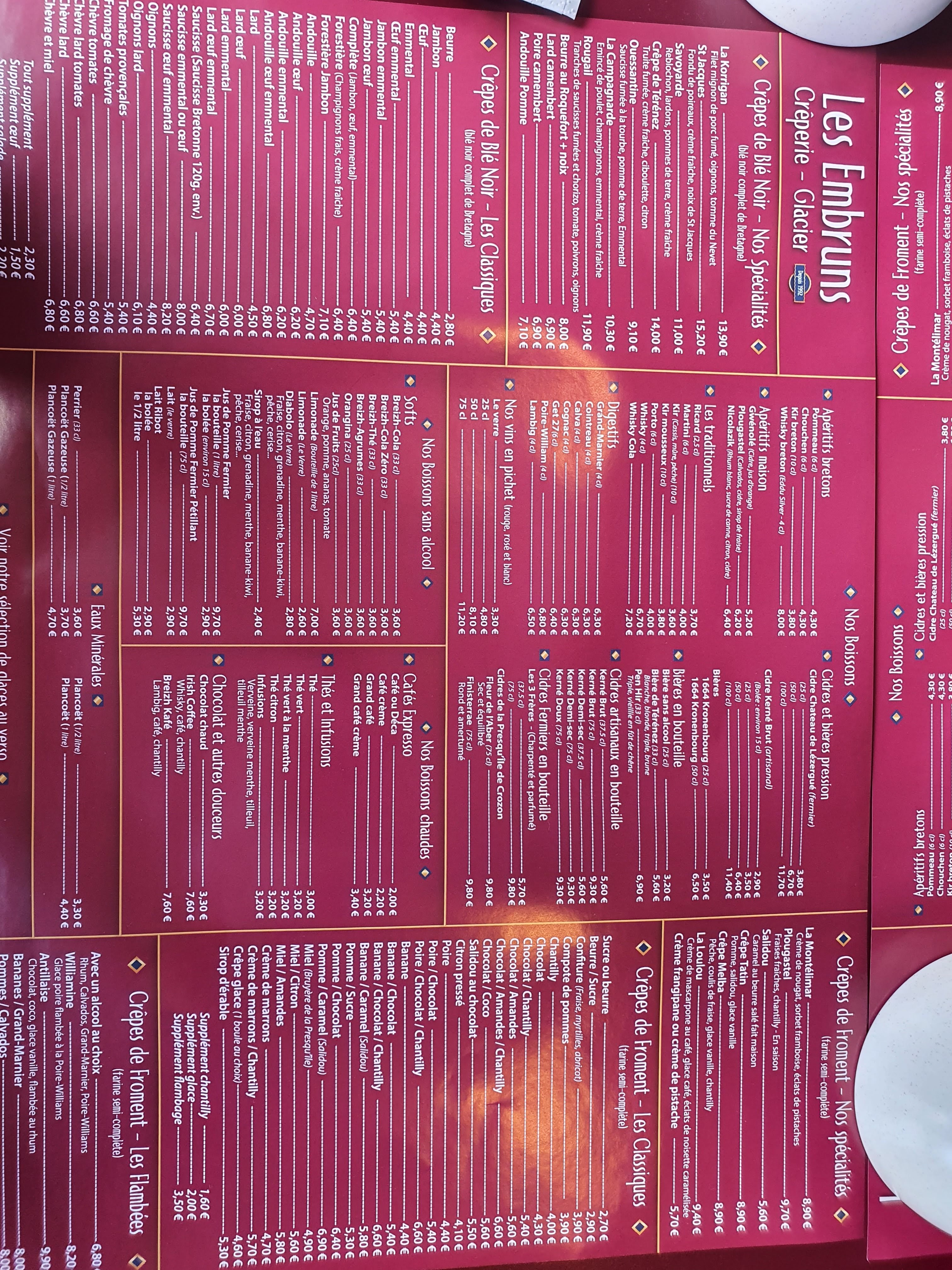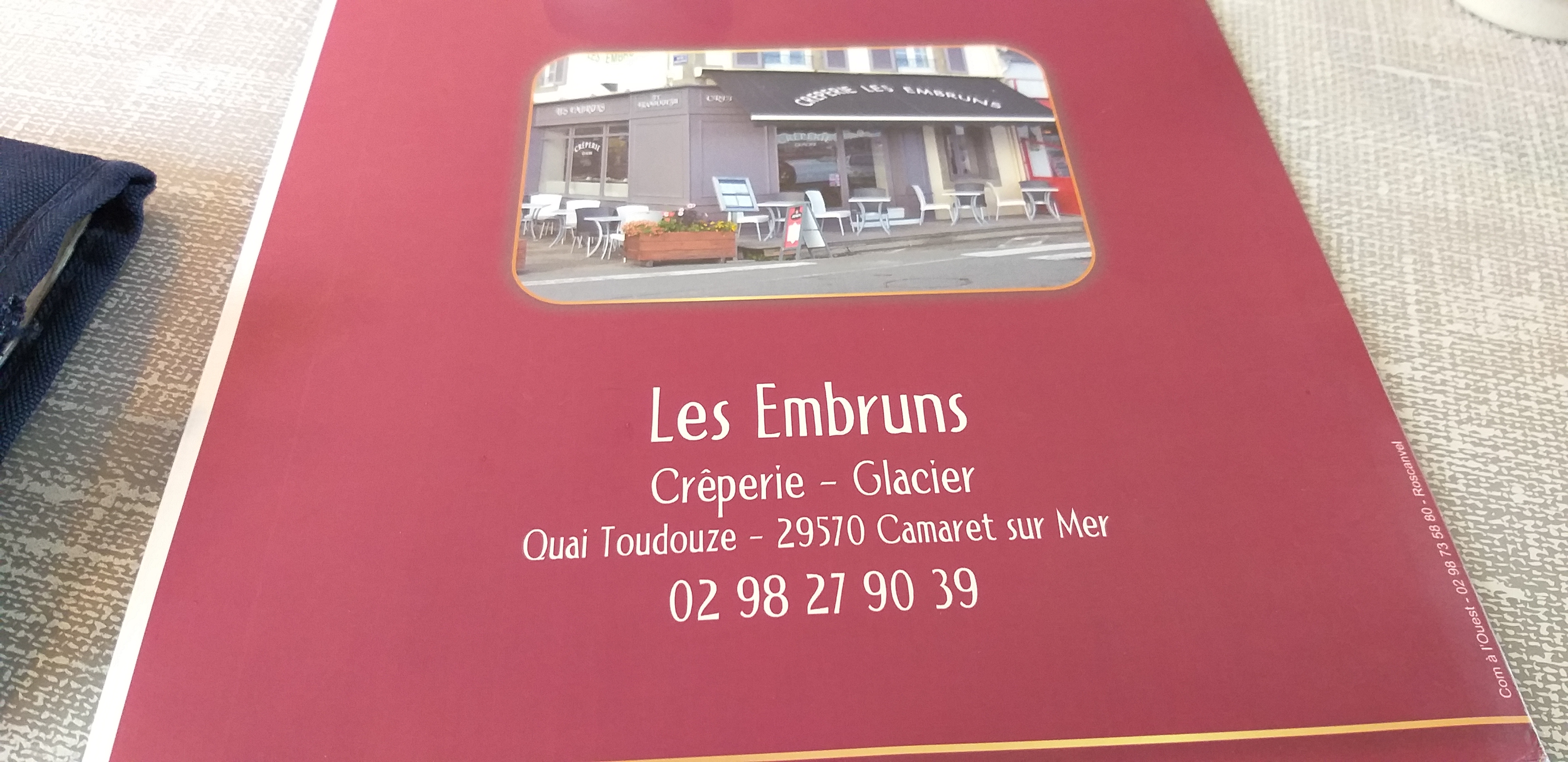 Une excellente crêperie au bout du monde, c'est possible : rendez-vous aux Embruns à Camaret. De retour en terres finistériennes, 10 ans après mes premières visites je suis retourné ce jour dans cette crêperie. J'y ai retrouvé un accueil de très bonne facture, un bon choix de galettes et crêpes. Très bon rapport qualité prix, produits frais. Voyageurs, vacanciers n'oubliez pas de déguster le Nicolazic : savoureux cocktail du patron. Je remercie toute l'équipe des Embruns pour ce moment de bonheur culinaire. A très bientôt.