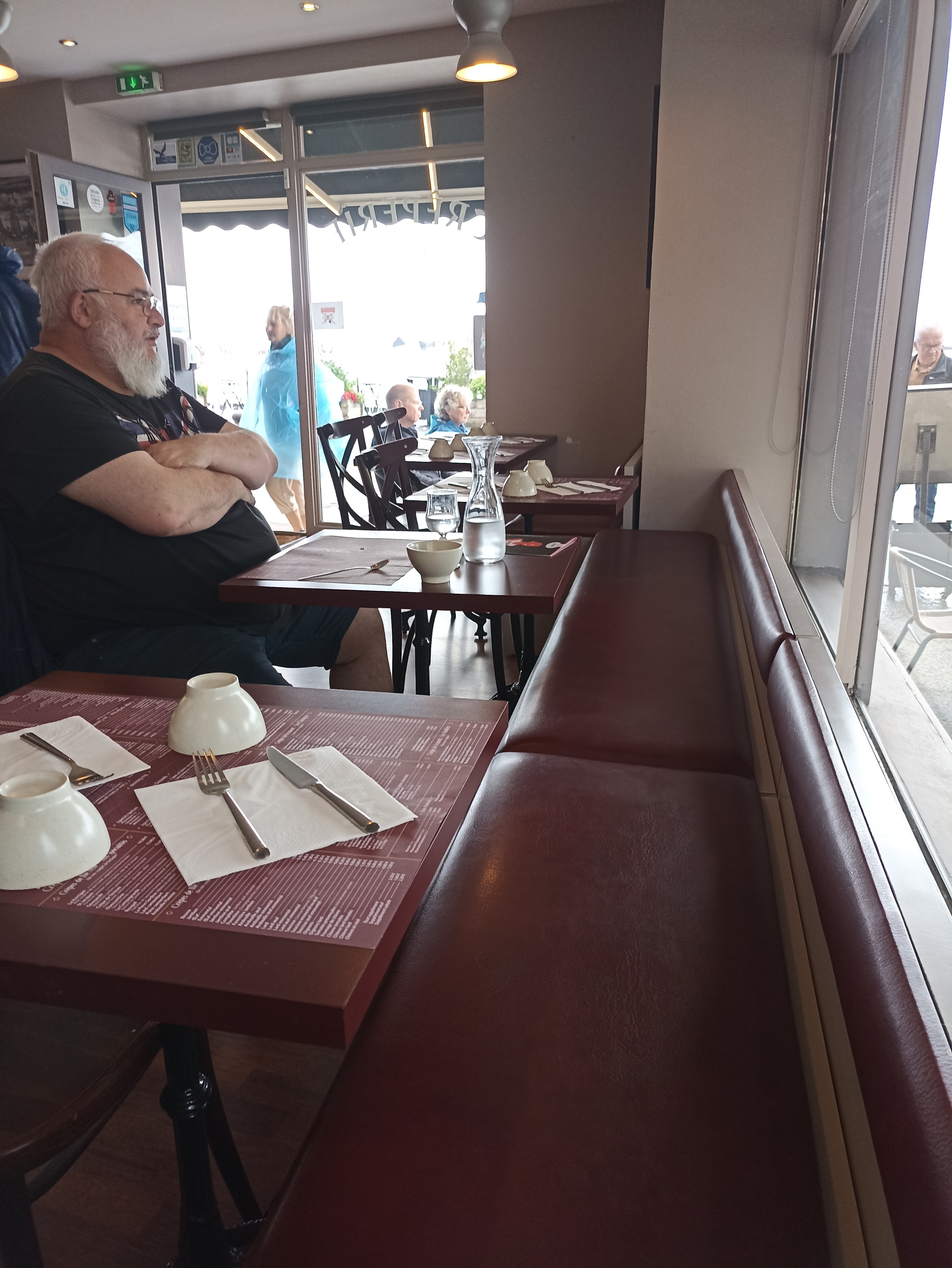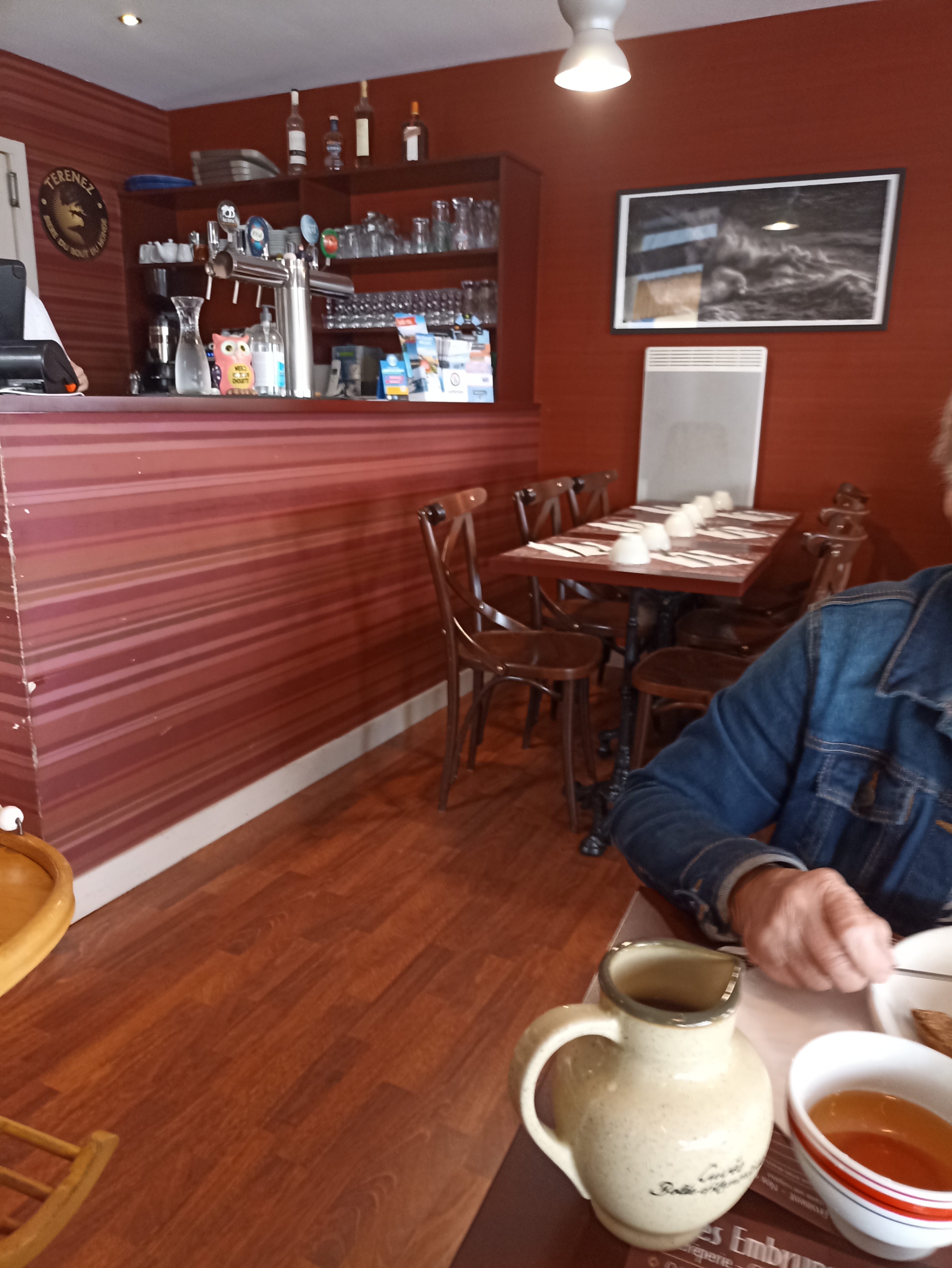 Bel établissement sur la jetée du port de Camaret sur Mer, terrasse, tablées sur le côté ou le devant du restaurant, salle intérieure, avec tables et chaises de deux, quatres ou plus, adaptables, propre, clair, net, bien accueilli, chaleureux, personnels bienveillants, banquettes, tableaux marins, menu sur le set de table, de nombreux choix pour une variétés de crêpes de toutes sortes,nous avons pris deux crêpes aux champignons frais avec une sauce crème fraîche, délicieuses, 50cl de cidre doux, deux crêpes pommes caramel fondus, et un décaféiné,le tout pour 36€10, repas excellent, toilette sur le côté, un seul, ne pas hésiter à y aller selon les saisons, les jours, les heures, les besoins.