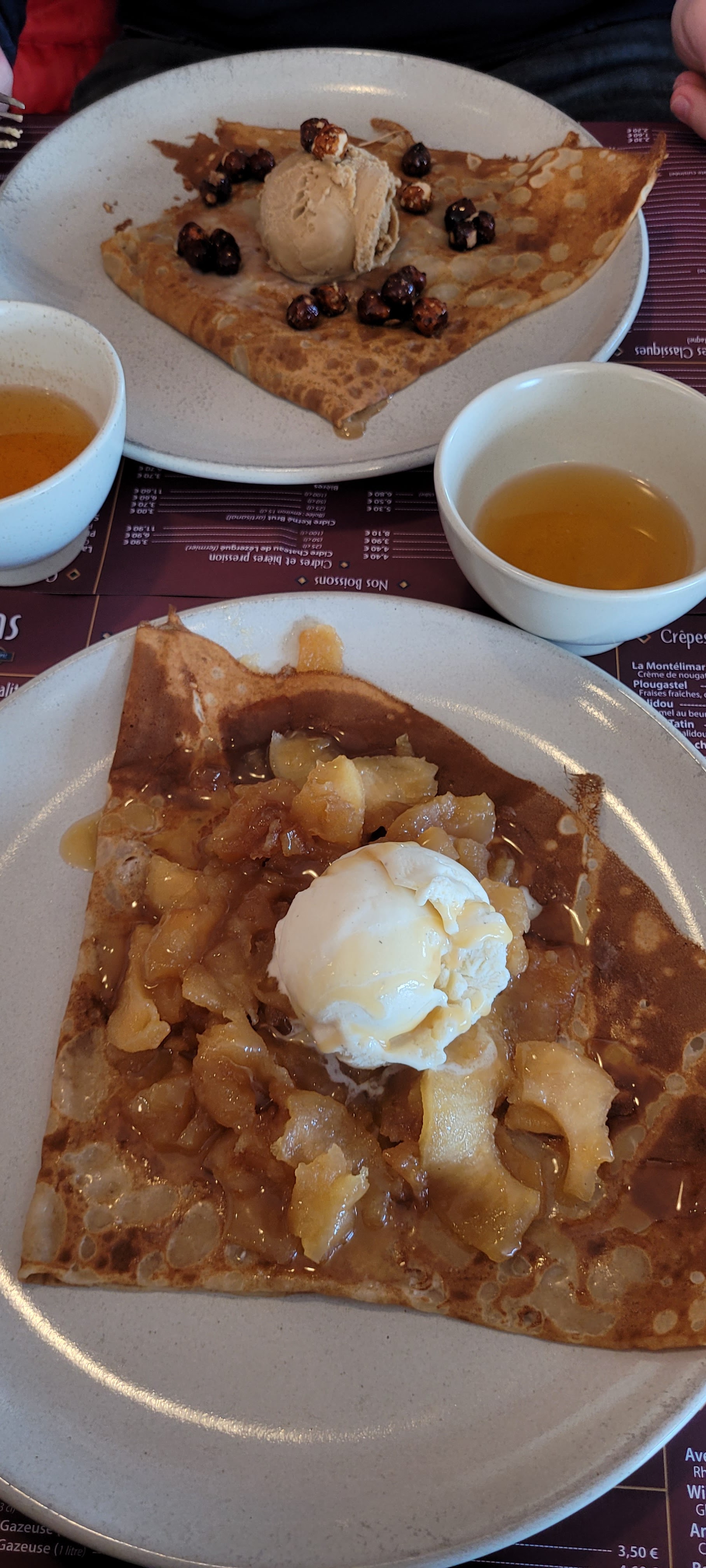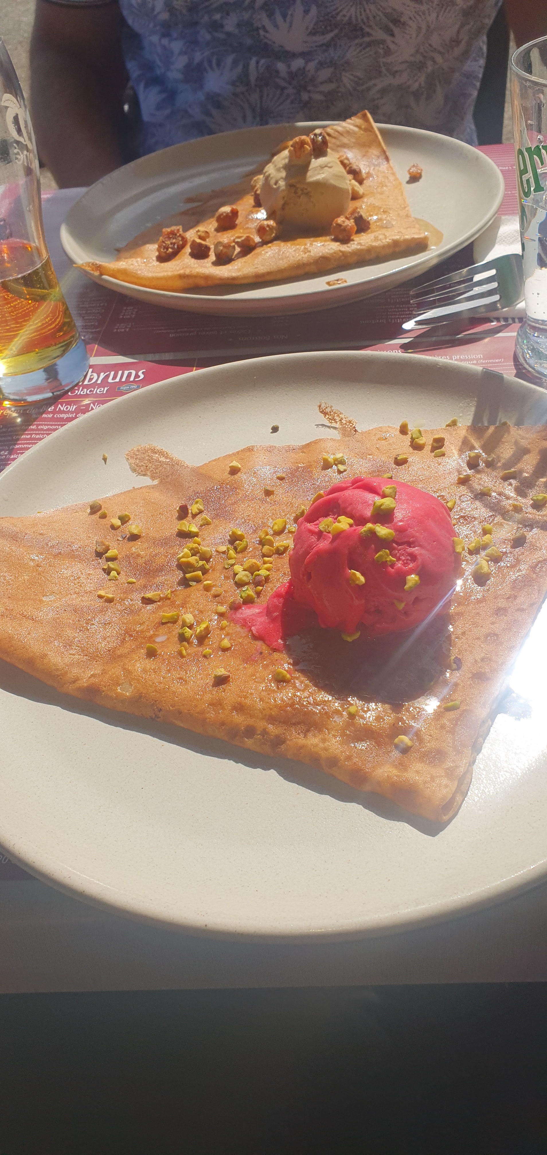 Je recommande, super bon ! J'ai pris une galette saucisse chèvre et il y avait plein de chèvres pas comme les arnaqueurs qui ont mettent un tout petit peu et mon frère et ma mère ont adoré leurs galettes ! Ils ont pleins de goûts originaux de glaces comme palets bretons, blé noir et même kouinaman et plein d'autre ! Personnellement j'ai pris palet breton et caramel au beurre salé, mon frère deux boules de menthe chocolat et ma crème tatin et c'était trop bon ! On a même demandé le glaciers ! Très peu de temps d'attente, serveurs super gentils.