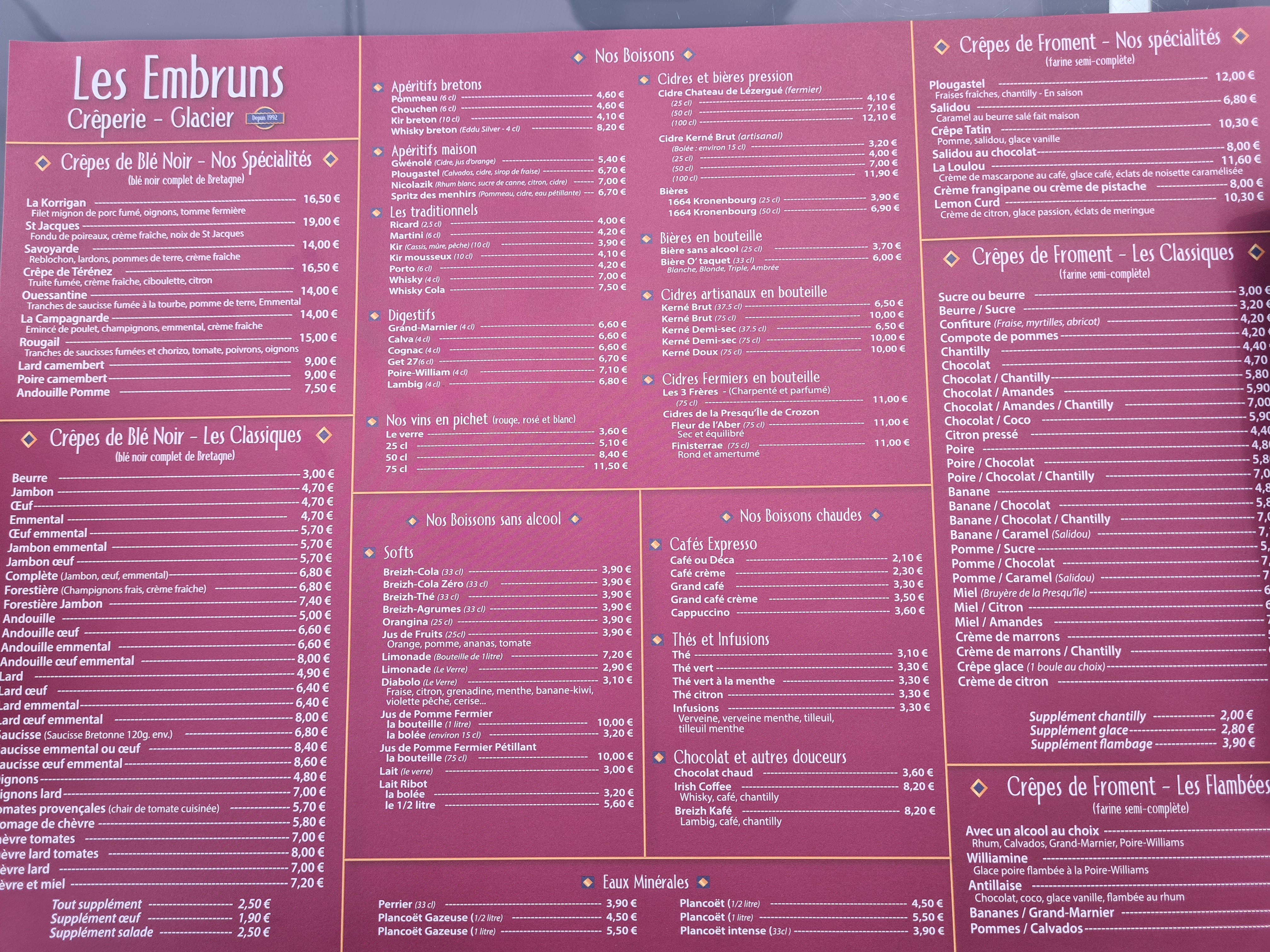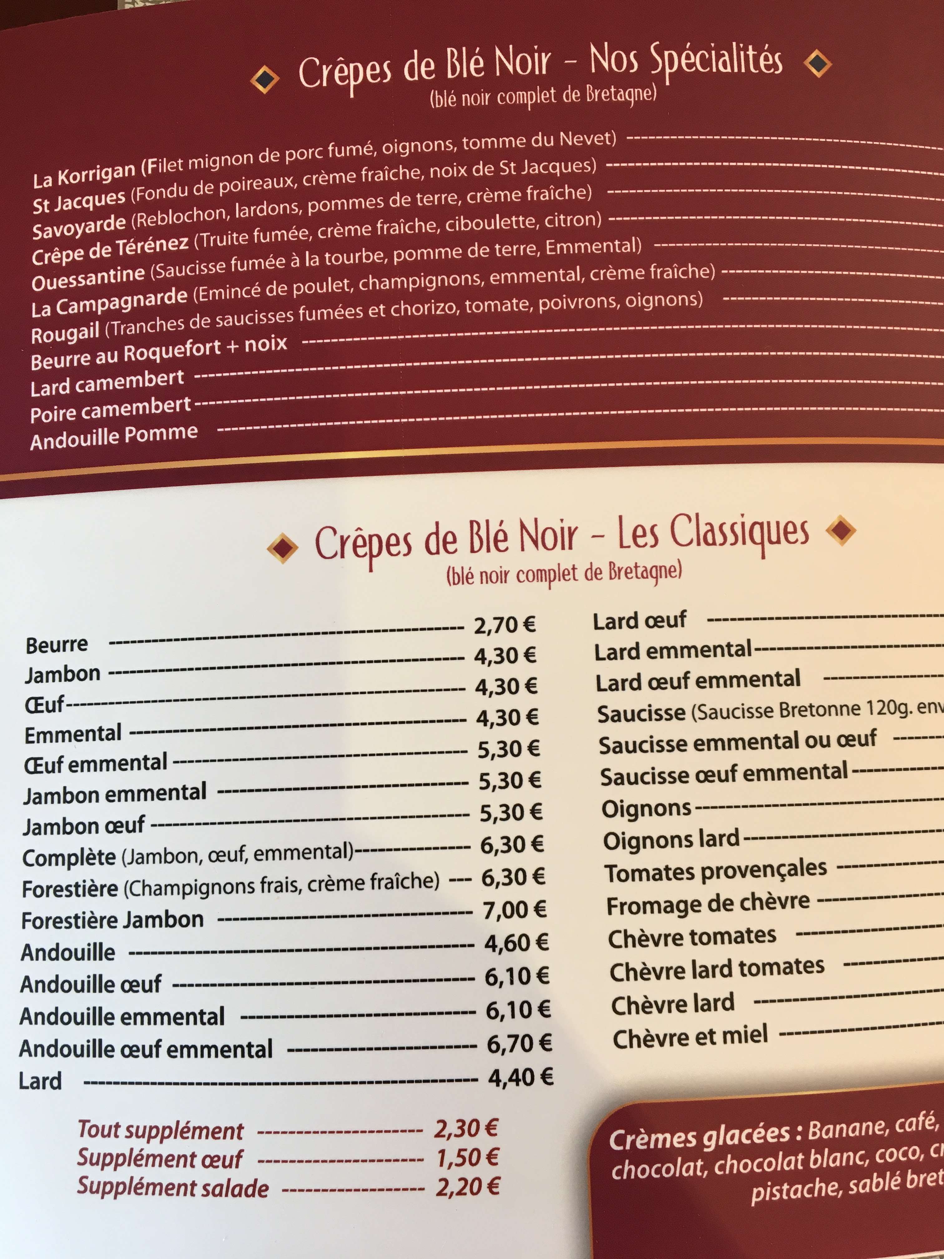 Bon service. Crêpes excellentes et avec un large choix. Prix abordable (carte dans les images) et la moins chère des crêperies du port. Desserts copieux.