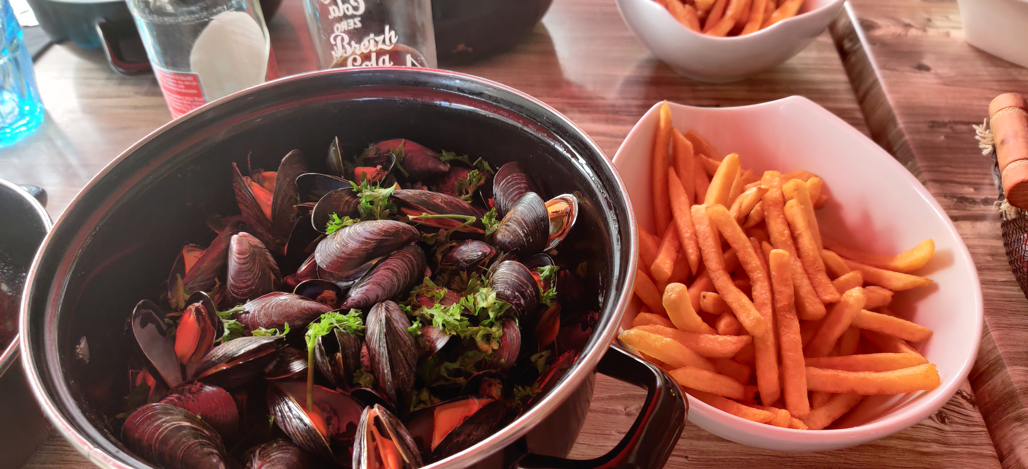 Moules de qualité, mais préparation à revoir : par exemple les moules gorgonzola sont juste des moules avec un bloc de gorgonzola par dessus... Pareil pour les autres. Frites surgelées mais correctes, galettes et crêpes correctes aussi. Service très mauvais malgré la sympathie: 15 minutes pour avoir une carafe d'eau (à 2 reprises, demandée à 3 serveurs différents), j'ai fini par me déplacer. Une galette oubliée... Débarras aléatoire de la table... Rien de catastrophique, mais service à revoir FORTEMENT.
