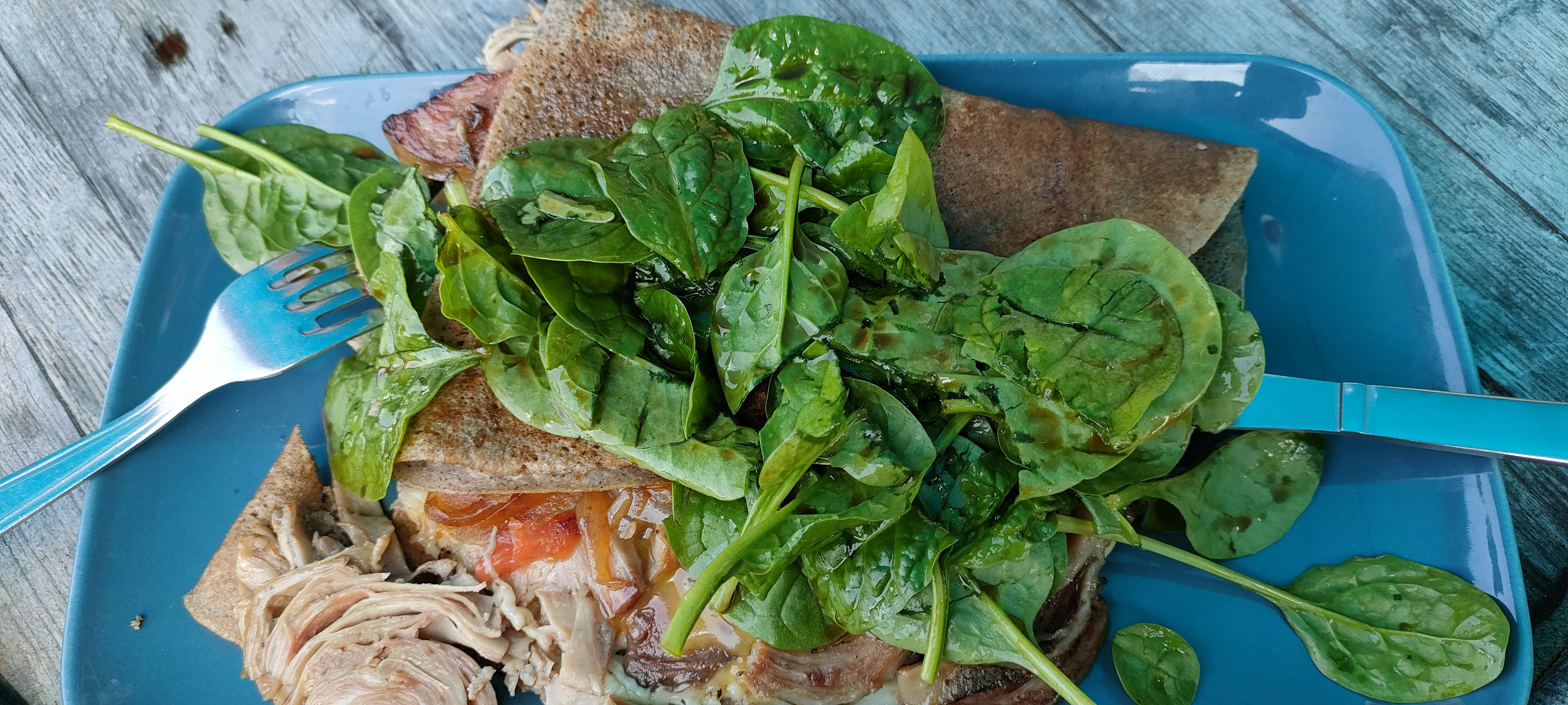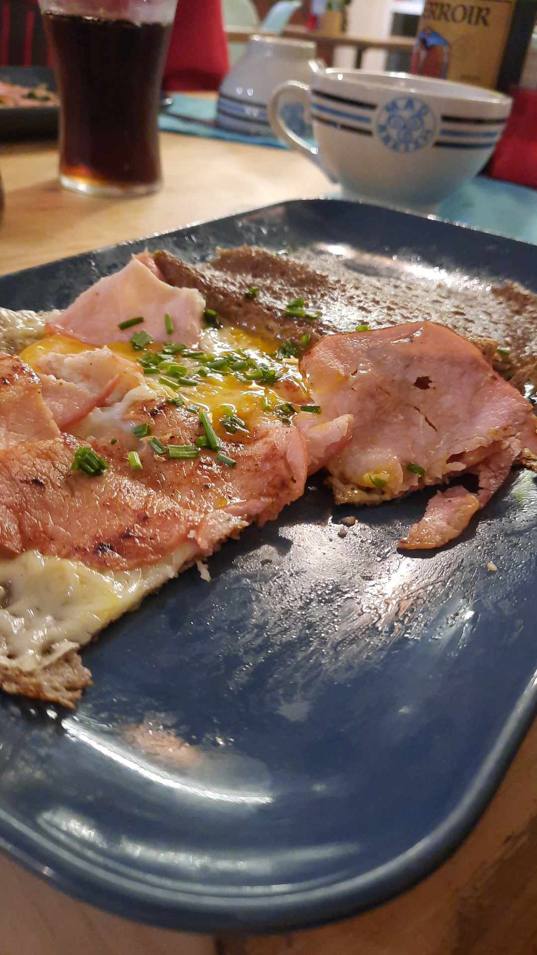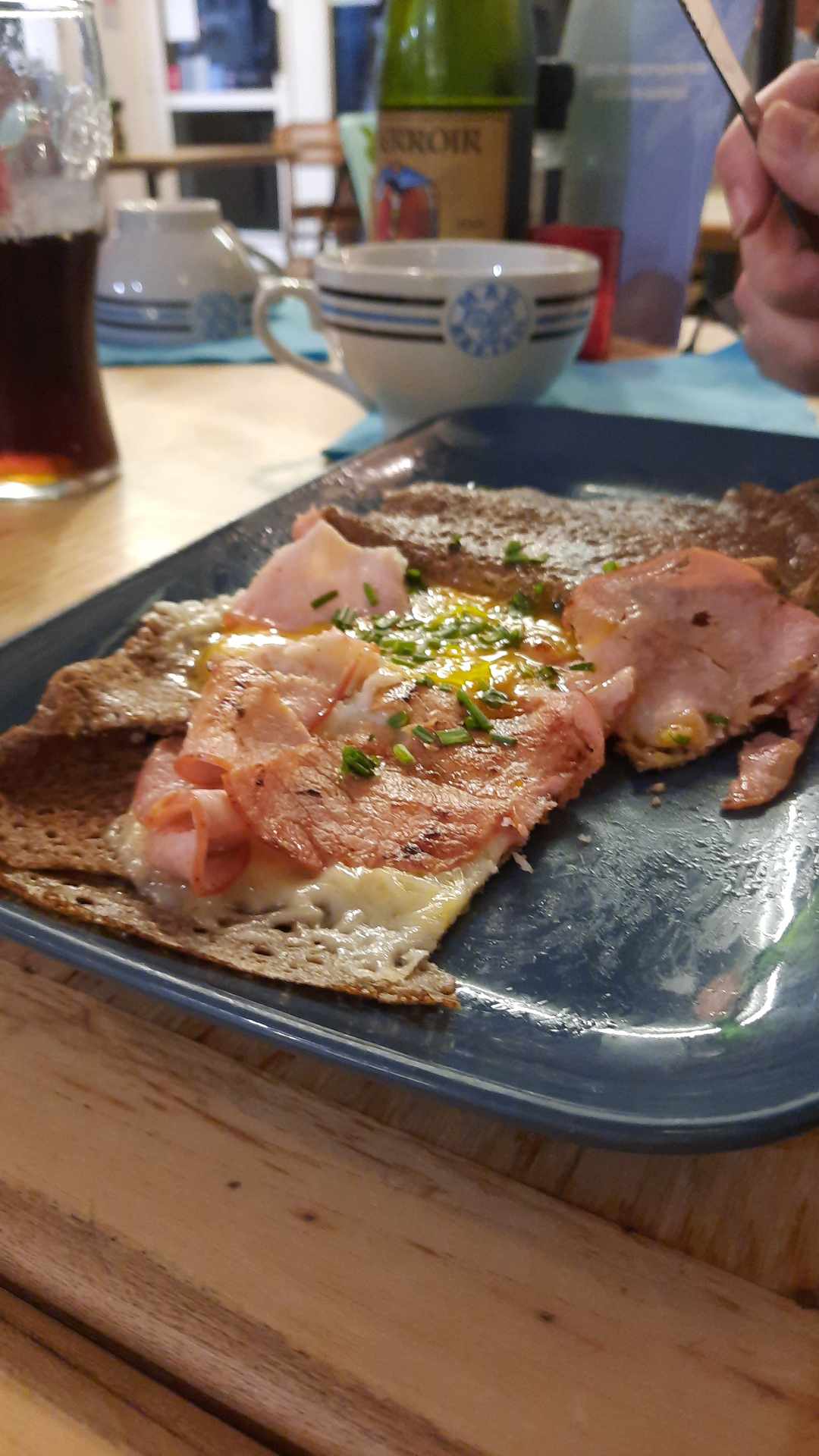 Sur l ardoise du jour il était mentionné galettes avec pousse d épinard, nous avions beaucoup trop de salade verte. La guéméné avec beaucoup de jambon et du fromage, non mentionné sur la carte. Avons été déçu, dommage nous habitons à côté et après 2 visites nous ne retournerons pas.