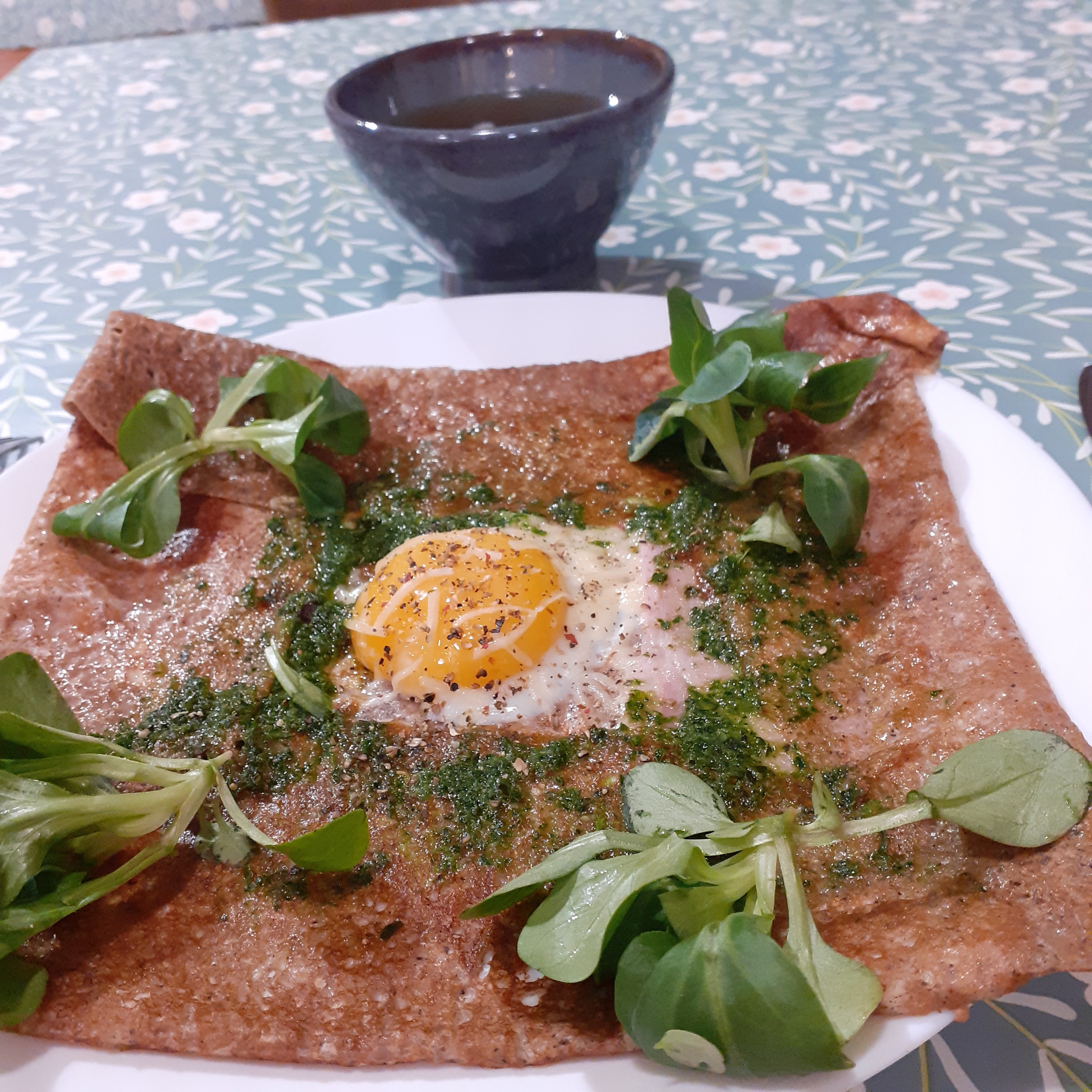 Une belle découverte pour notre déjeuner de ce midi pendant la fête de Quintin pour ma famille et moi-même. J'ai adoré ma crêpe au magret et sa confiture de cerises noires, j'ai particulièrement apprécié la convivialité, l'ambiance pour ne pas dire l'aura qui règne dans ce magnifique lieu, décoré avec goût et l'accueil +++ de nos hôtes. Vous y êtes accueillis avec le sourire la gentillesse et l'envie de partage et de vous faire partager un bon moment. C'est chose faite et d'autant plus appréciable lorsque vous êtes touriste (mais bretonne de coeur). Je recommande et espère revenir y déjeuner. Ma famille s'associe à moi pour vous dire mille fois merci.